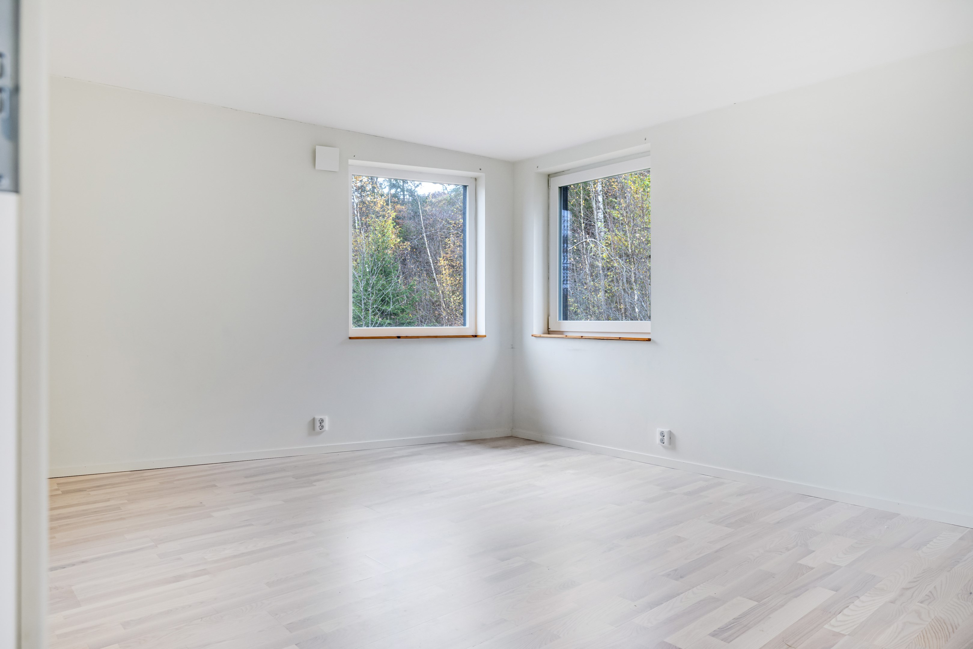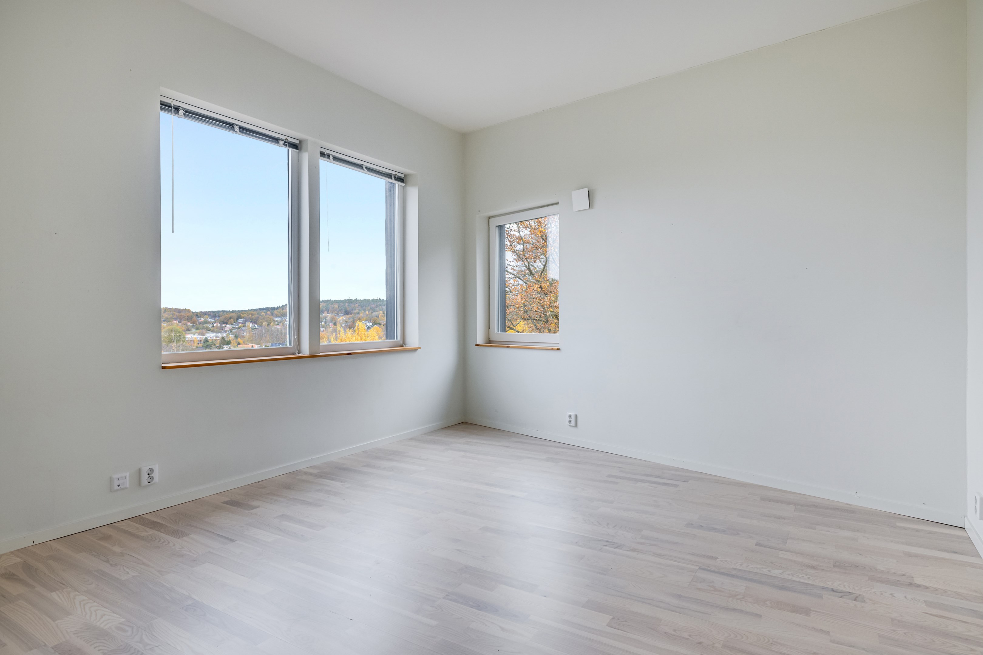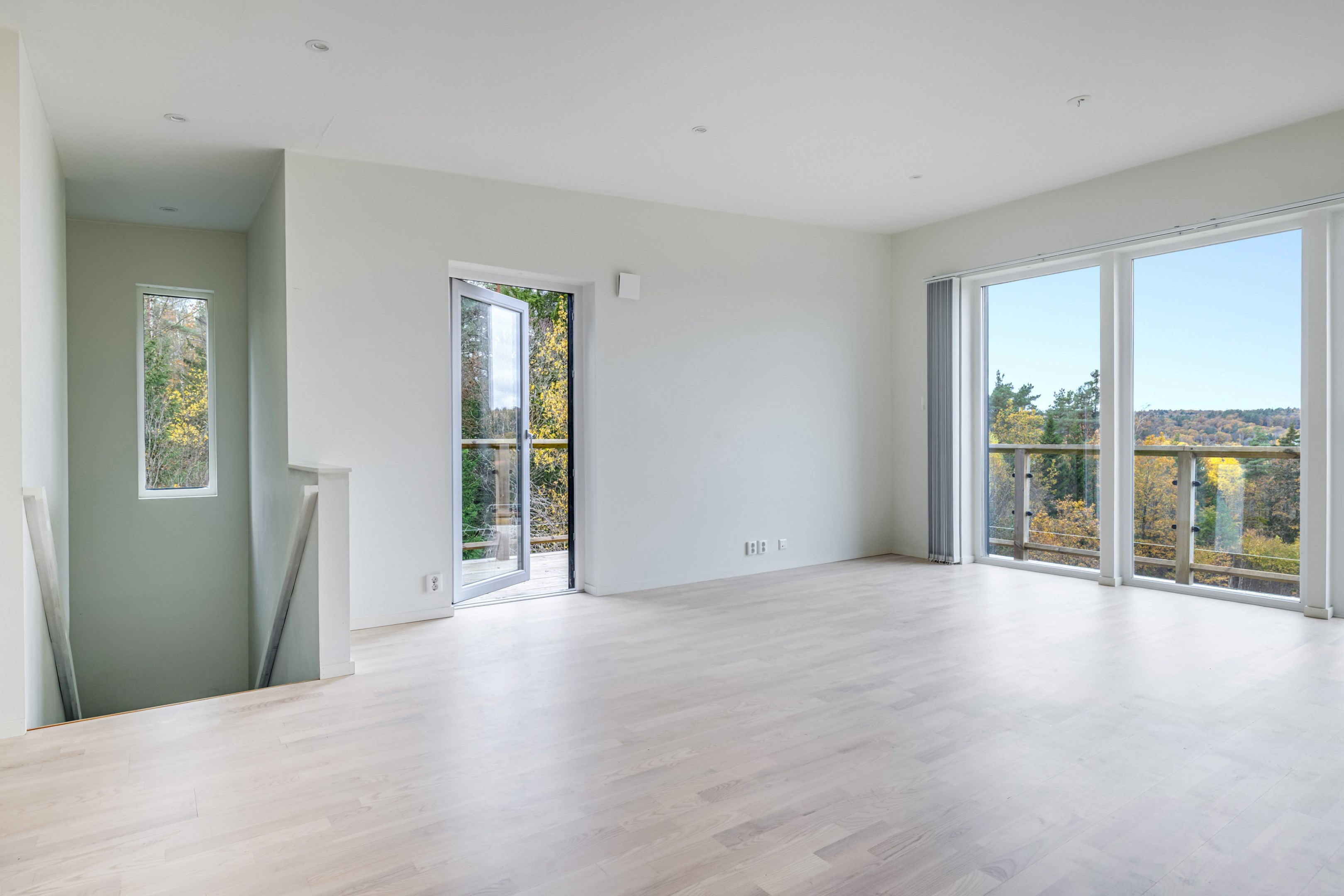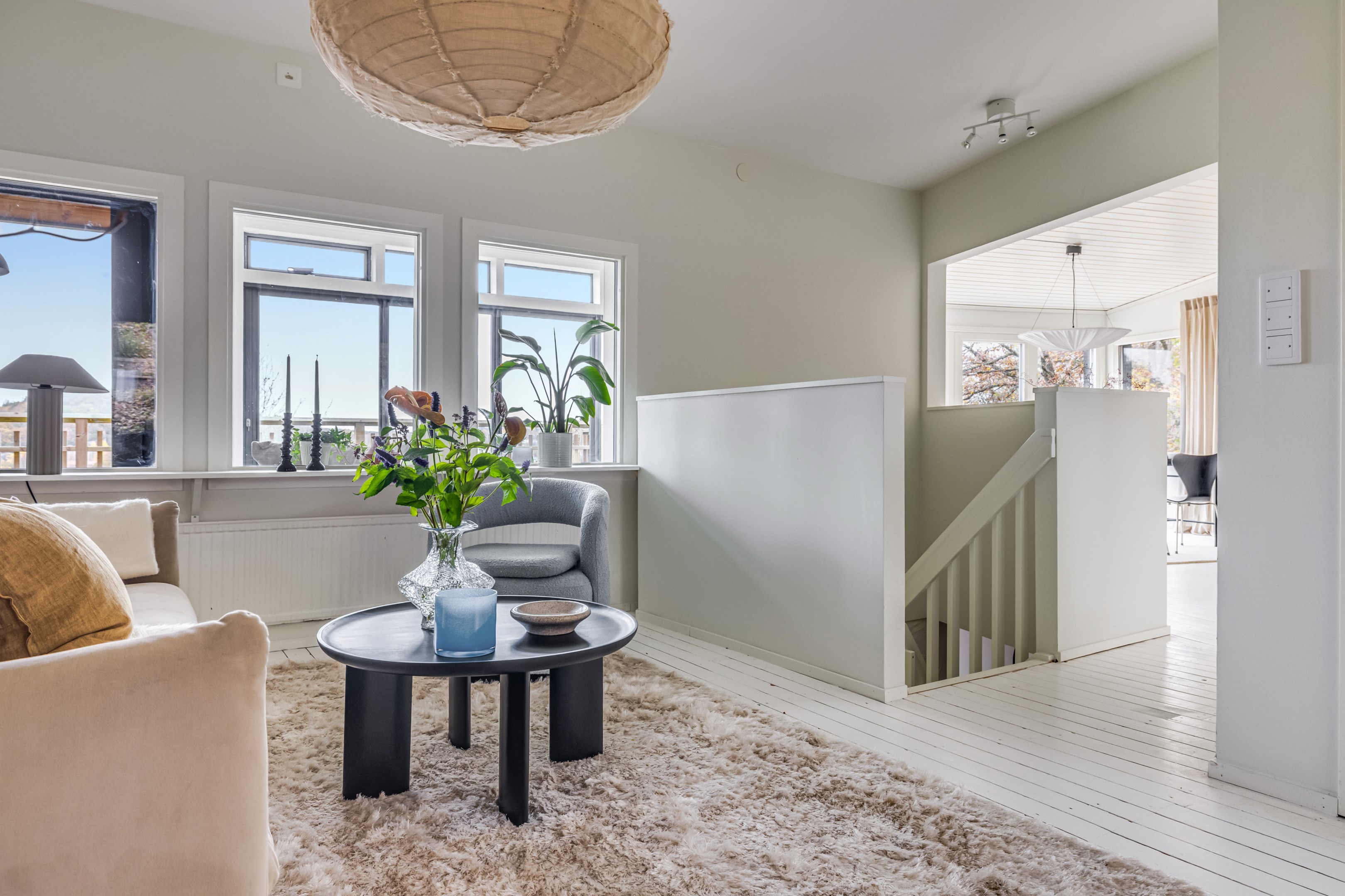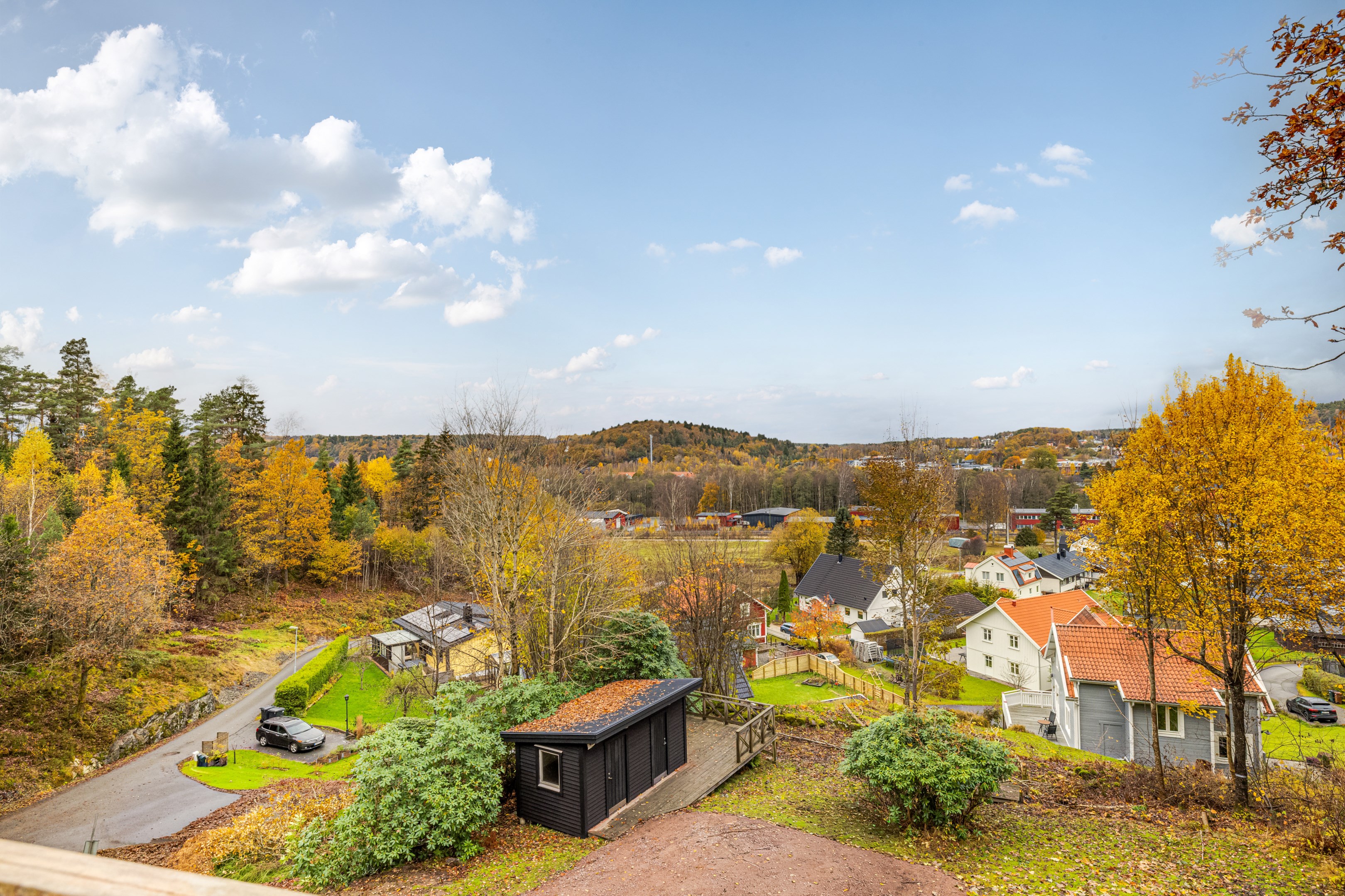 ENTRÉPLAN Via entrén under tak leds du in i denna mäktiga villa. På entréplanet möts du av en hall med yta för att hänga av dig ytterkläder och skor längs med väggen. Betongväggarna är putsade i vitt och på golvet ligger en grå klinker. Längre in i hallen finns god yta för garderober. Från hallen når du den helkaklade ytan som agerat tvättstuga och badrum. Utrymmet är äldre men fullt funktionellt. Här finns duschmöjligheter via duschkabin, wc-stol och handfat samt tvättmaskin och torktumlare från 2021. Utrymmet har vattenburen golvvärme och via ett fönster tittar dagsljuset in. Via dörren intill når du ett grovinrett utrymme, här står innerdelen till husets värmekälla, IVT Optima 800. MELLAN PLAN Från entréplanet har en trappa nyligen installerats som leder dig upp till nästa plan. Här möts du av stora hemtrevliga sällskapsytor, generösa fönsterpartier och ett rejält kök med en social barbänk som delar av ytorna på ett trivsamt sätt. Luftvärmepumpen från 2015 är sparsamt använd då den nyttjats som ett värmekomplement under årets kallare dagar och för AC under årets varmare dagar. På golven ligger det ett vitmålat träplank och väggarna är genomgående målade i vitt. Köket har gott om skåp och mycket bra arbetsytor. Ovan vita bänkskivor i laminat har du stänkskydd i vitt kakel. Vitvarorna fördelar sig om en kombinerad kyl och frys från 2020, äldre spis och ugn, fläktkåpa från 2015 och diskmaskin från 2017. Köksrummets generösa yta ger dig många olika möbleringsalternativ. Här är lätt att duka upp stort till familjära tillställningar. Braskaminen ger både värme och stämningsfaktor. Uterummet ligger smart placerat och är en skön plats för avkoppling och återhämtning. Uterummet som har höst isolerat glas från Willab Garden har det övre planet som tak och tjock frigolit under golvet så med en gasolkamin kan du snabbt värma upp utrymmet även på vintern. I vardagsrumsdelen får du plats med soffgrupp och tillhörande möblemang. En gästtoalett ligger i anslutning till rummet. Från vardagsrummet når du också en liten uteplats under tak åt söder. För dig som önskar större sällskapsytor på detta plan finns möjlighet att öppna upp delar av väggen in mot intilliggande sovrum. Ett par trappsteg upp kommer du till det största sovrummet på detta plan. Här finns bra förvaring bakom skjutdörrar. Väggarna pryds av en mönstrad tapet och på golvet ligger en grå heltäckningsmatta. Vidare in i huset kommer du till trappan som leder dig upp till det övre planet och två rum lämpar sig bra till sovrum, kontor eller liknande. Väggarna är målade i vitt och på golvet ligger en grå heltäckningsmatta. Det innersta sovrummet ligger ett par trappsteg ner. Ett hörnfönster släpper in rikligt med ljus. ÖVRE PLAN Du välkomnas upp till det övre planet som är ett imponerande utrymme med magisk utsikt. Det övre planet fördelar sig om tre generösa sovrum, ett stort badrum och ett njutningsfullt sällskapsrum som har utgång till en balkong som sträcker sig runt 2 sidor om huskroppen. Sällskapsrummet har stora fönsterpartier som skänker ett fint ljusflöde till rummet. Alla sovrummen har plats för garderober och rymmer det mesta möblemanget du önskar. Badrummet har kakel från Interkakel, handfat med kommod, duschhörna med infällbara dörrar och wc-stol. Hela övre plan är helt fribärande och har vattenburen golvvärme i alla rum förutom badrummet som har elgolvvärme för bästa komfort. Fast nätverkskabel är draget till alla rum och den finns även i taket för en Wifi AP. På golven i alla rum ligger en 3 stavsparkett i ask, Stockholm White. Alla väggar är målade i vitt.