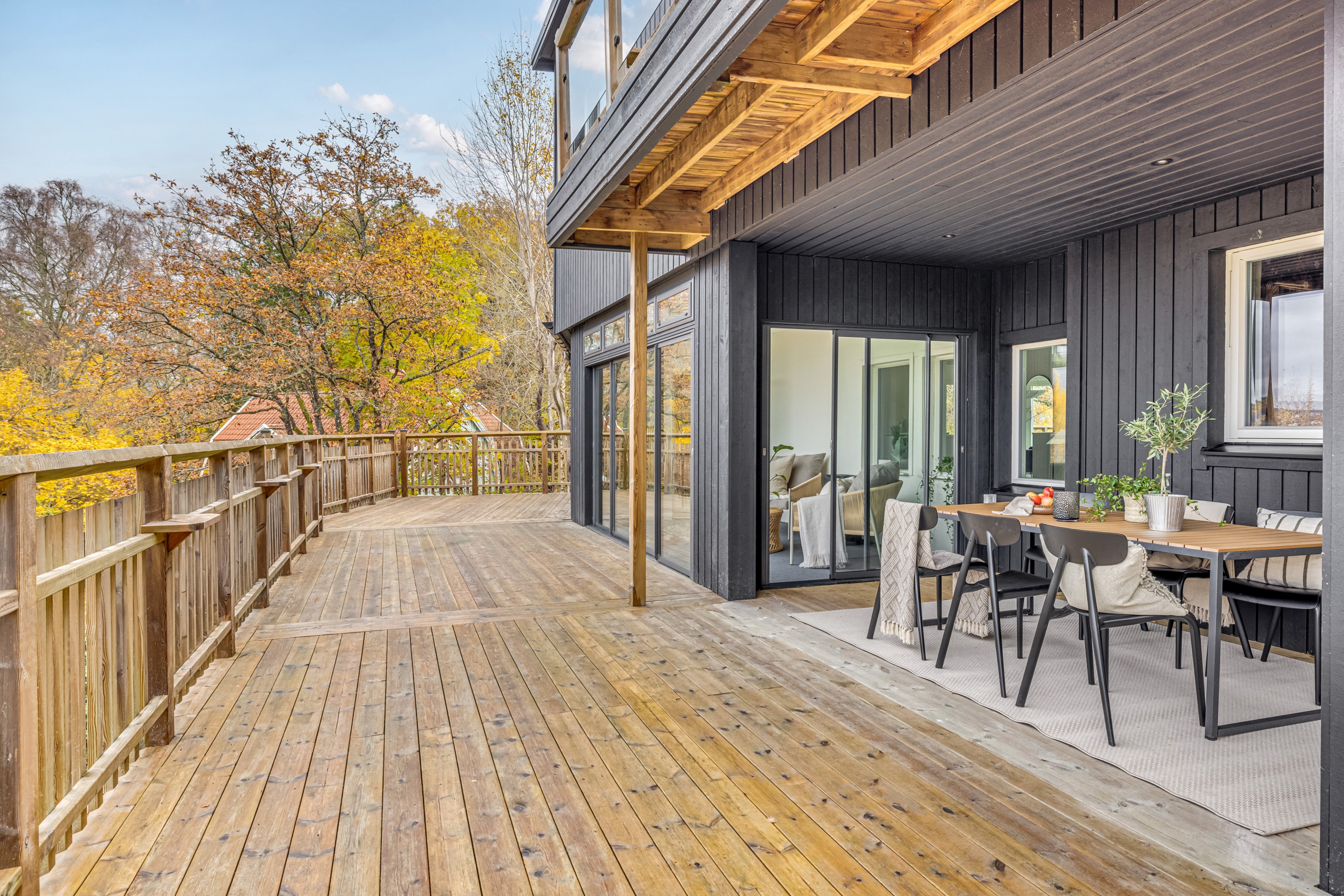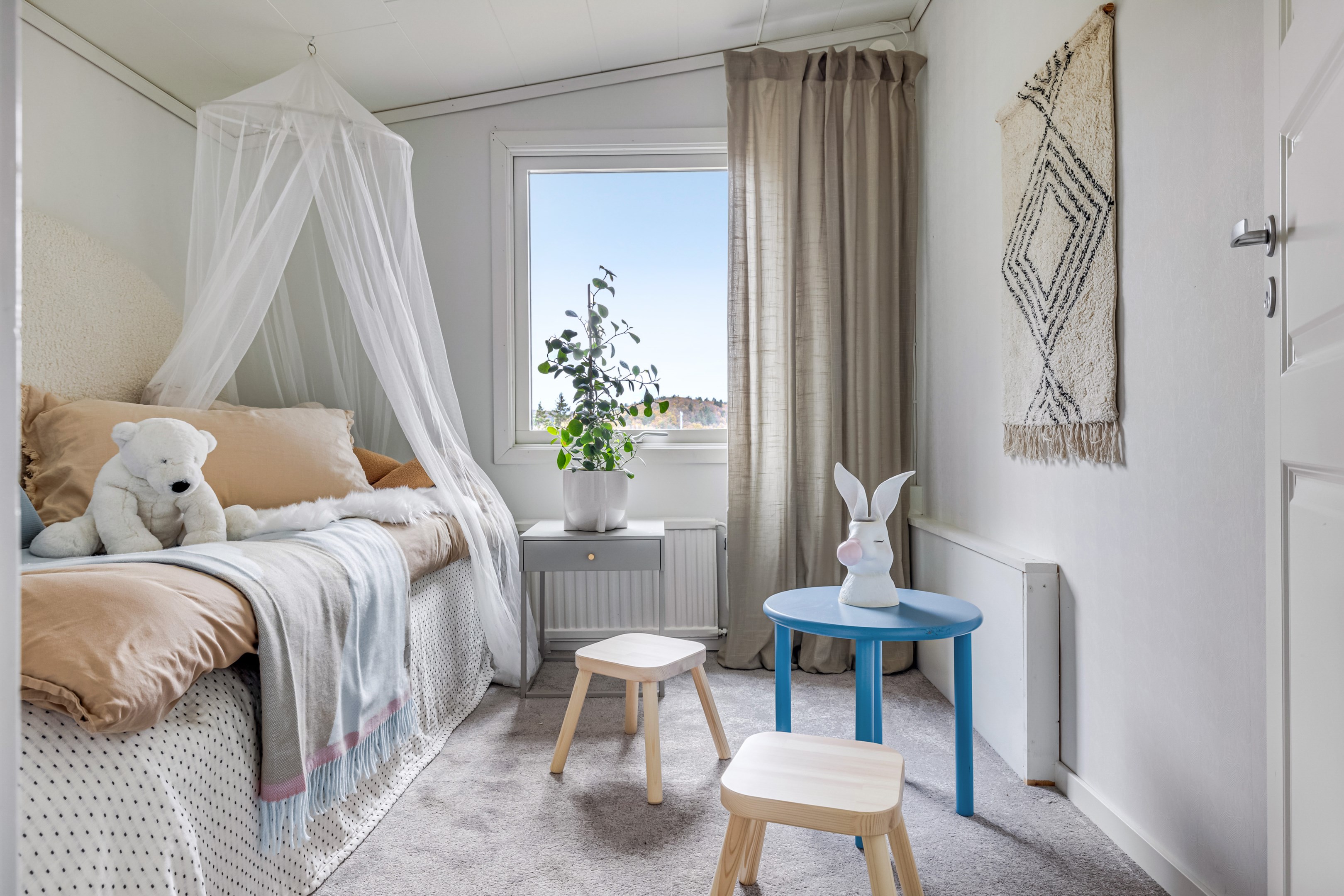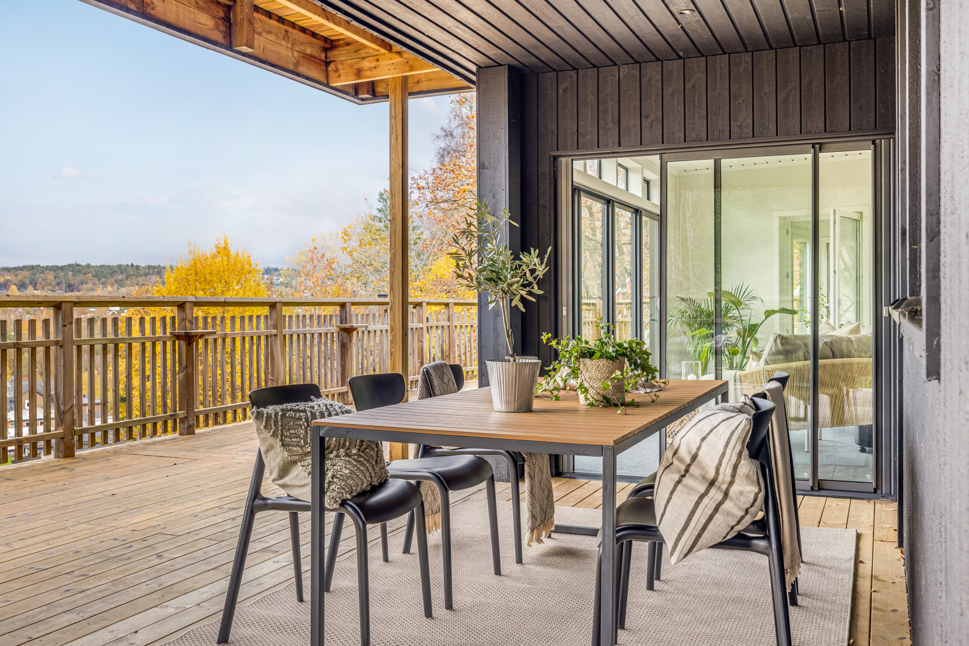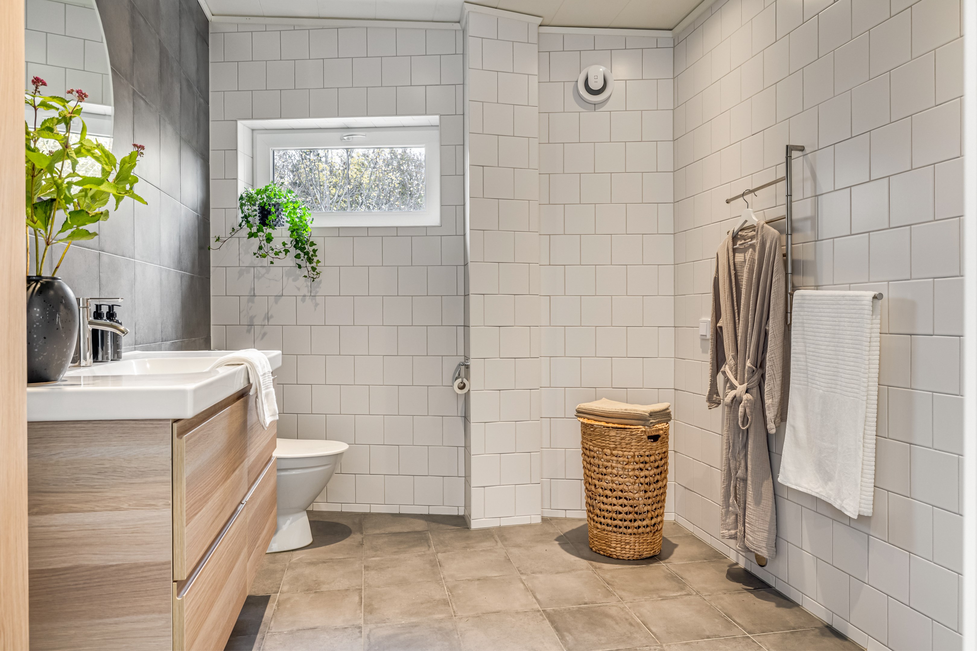 ENTRÉPLAN Via entrén under tak leds du in i denna mäktiga villa. På entréplanet möts du av en hall med yta för att hänga av dig ytterkläder och skor längs med väggen. Betongväggarna är putsade i vitt och på golvet ligger en grå klinker. Längre in i hallen finns god yta för garderober. Från hallen når du den helkaklade ytan som agerat tvättstuga och badrum. Utrymmet är äldre men fullt funktionellt. Här finns duschmöjligheter via duschkabin, wc-stol och handfat samt tvättmaskin och torktumlare från 2021. Utrymmet har vattenburen golvvärme och via ett fönster tittar dagsljuset in. Via dörren intill når du ett grovinrett utrymme, här står innerdelen till husets värmekälla, IVT Optima 800. MELLAN PLAN Från entréplanet har en trappa nyligen installerats som leder dig upp till nästa plan. Här möts du av stora hemtrevliga sällskapsytor, generösa fönsterpartier och ett rejält kök med en social barbänk som delar av ytorna på ett trivsamt sätt. Luftvärmepumpen från 2015 är sparsamt använd då den nyttjats som ett värmekomplement under årets kallare dagar och för AC under årets varmare dagar. På golven ligger det ett vitmålat träplank och väggarna är genomgående målade i vitt. Köket har gott om skåp och mycket bra arbetsytor. Ovan vita bänkskivor i laminat har du stänkskydd i vitt kakel. Vitvarorna fördelar sig om en kombinerad kyl och frys från 2020, äldre spis och ugn, fläktkåpa från 2015 och diskmaskin från 2017. Köksrummets generösa yta ger dig många olika möbleringsalternativ. Här är lätt att duka upp stort till familjära tillställningar. Braskaminen ger både värme och stämningsfaktor. Uterummet ligger smart placerat och är en skön plats för avkoppling och återhämtning. Uterummet som har höst isolerat glas från Willab Garden har det övre planet som tak och tjock frigolit under golvet så med en gasolkamin kan du snabbt värma upp utrymmet även på vintern. I vardagsrumsdelen får du plats med soffgrupp och tillhörande möblemang. En gästtoalett ligger i anslutning till rummet. Från vardagsrummet når du också en liten uteplats under tak åt söder. För dig som önskar större sällskapsytor på detta plan finns möjlighet att öppna upp delar av väggen in mot intilliggande sovrum. Ett par trappsteg upp kommer du till det största sovrummet på detta plan. Här finns bra förvaring bakom skjutdörrar. Väggarna pryds av en mönstrad tapet och på golvet ligger en grå heltäckningsmatta. Vidare in i huset kommer du till trappan som leder dig upp till det övre planet och två rum lämpar sig bra till sovrum, kontor eller liknande. Väggarna är målade i vitt och på golvet ligger en grå heltäckningsmatta. Det innersta sovrummet ligger ett par trappsteg ner. Ett hörnfönster släpper in rikligt med ljus. ÖVRE PLAN Du välkomnas upp till det övre planet som är ett imponerande utrymme med magisk utsikt. Det övre planet fördelar sig om tre generösa sovrum, ett stort badrum och ett njutningsfullt sällskapsrum som har utgång till en balkong som sträcker sig runt 2 sidor om huskroppen. Sällskapsrummet har stora fönsterpartier som skänker ett fint ljusflöde till rummet. Alla sovrummen har plats för garderober och rymmer det mesta möblemanget du önskar. Badrummet har kakel från Interkakel, handfat med kommod, duschhörna med infällbara dörrar och wc-stol. Hela övre plan är helt fribärande och har vattenburen golvvärme i alla rum förutom badrummet som har elgolvvärme för bästa komfort. Fast nätverkskabel är draget till alla rum och den finns även i taket för en Wifi AP. På golven i alla rum ligger en 3 stavsparkett i ask, Stockholm White. Alla väggar är målade i vitt.