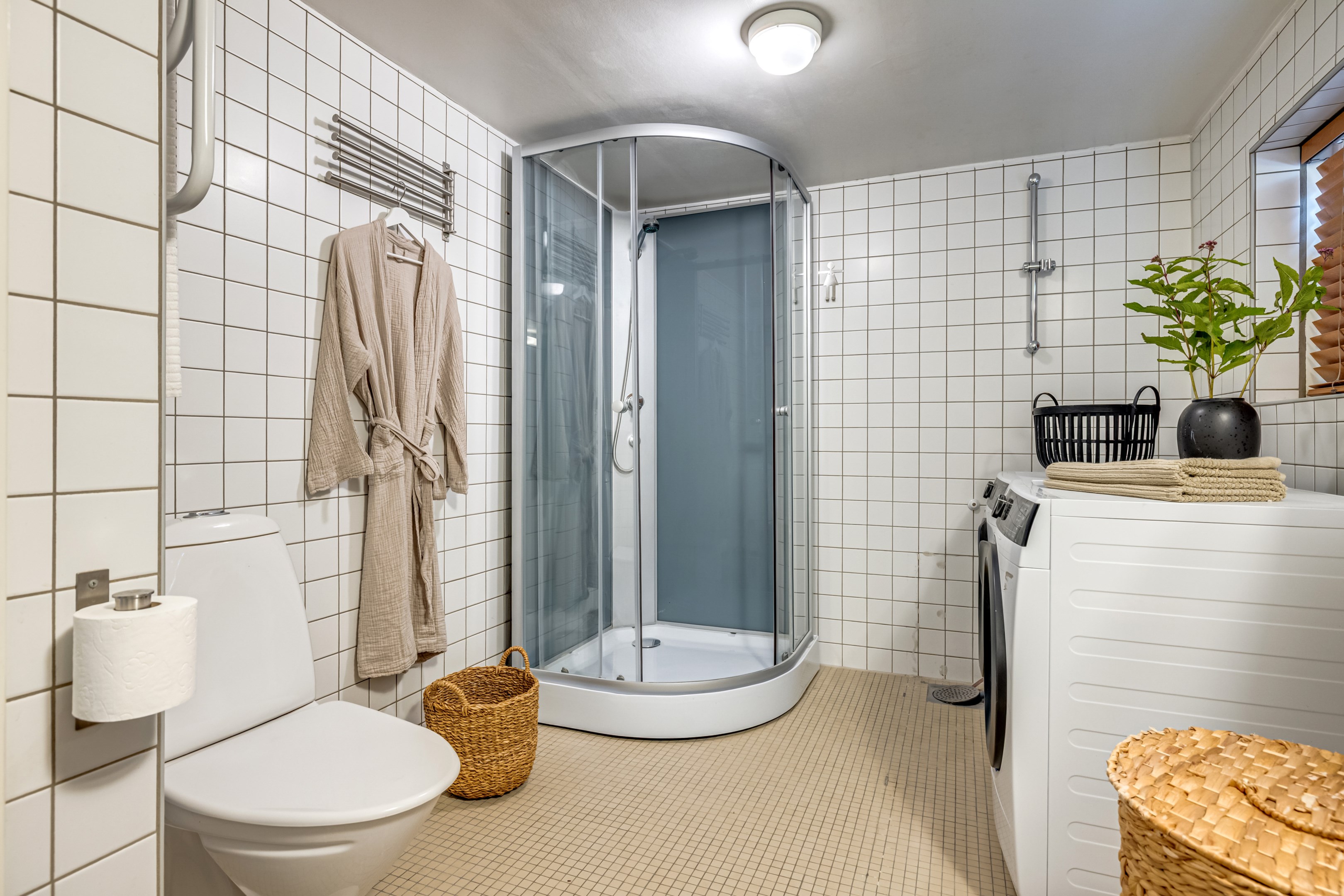 I de mindre bortre krypgrunderna bör man installera en avfuktare. Lite mosaik har släppt på golvet vid ena golvbrunnen i badrummet på entréplan, Inte helt ovanligt och inget man gör något åt förens man vill renovera utrymmet, enligt besiktningsmannen, då golvbrunnen ser bra ut.