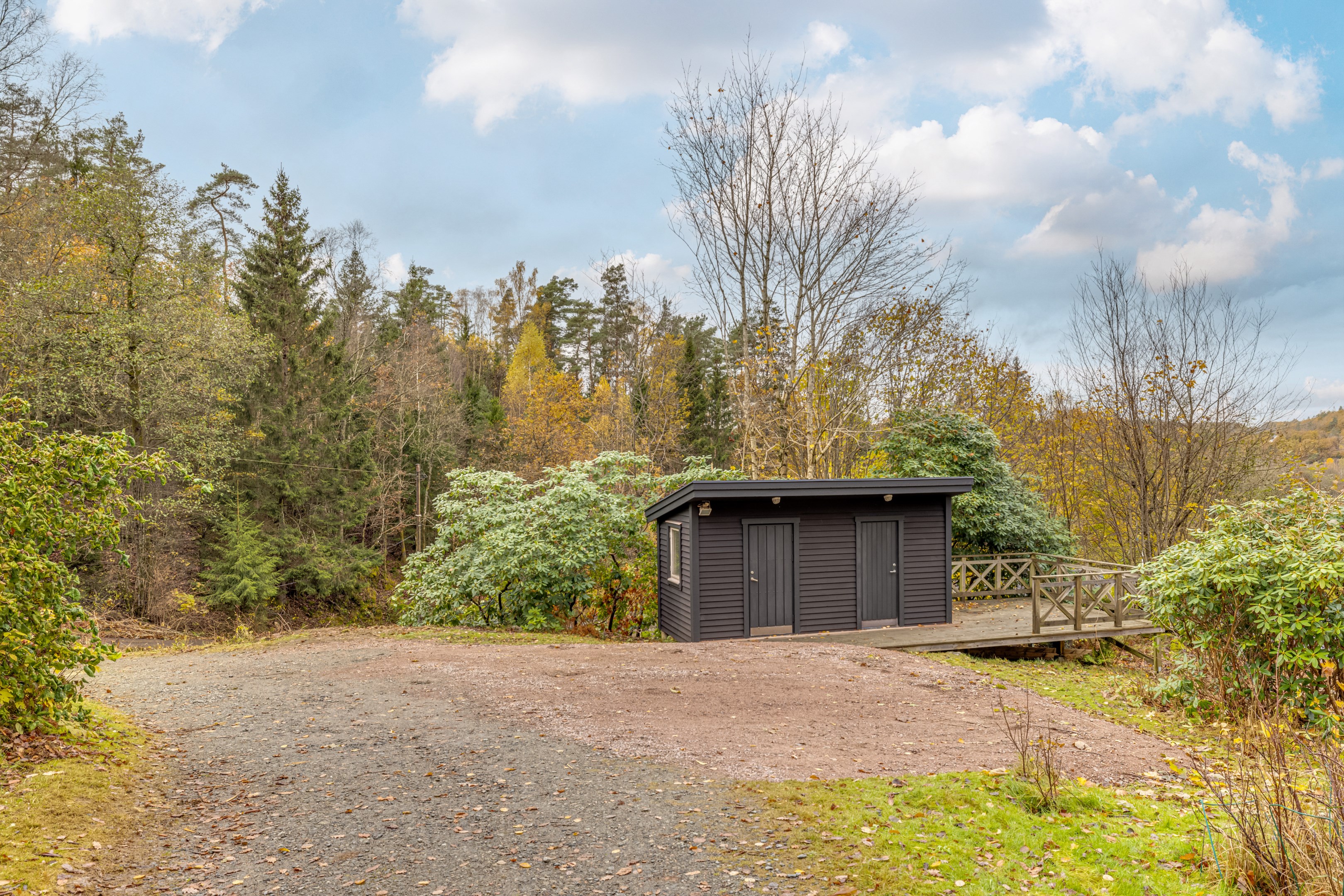 Äldre carport, är i behov av nytt tak. Kombinerad gäststuga och förråd om ca 12 kvm med en altan utanför. Ena rummet är inrett och om ca 8 kvm och kan nyttjas som varmförråd eller gästrum. Andra delen om ca 4 kvm är ett kallförråd. El finns indraget. Ett lusthus är placerad ovanför huset. Litet förråd vid entrén för trädgårdsredskap med hästkäppsstall intill.