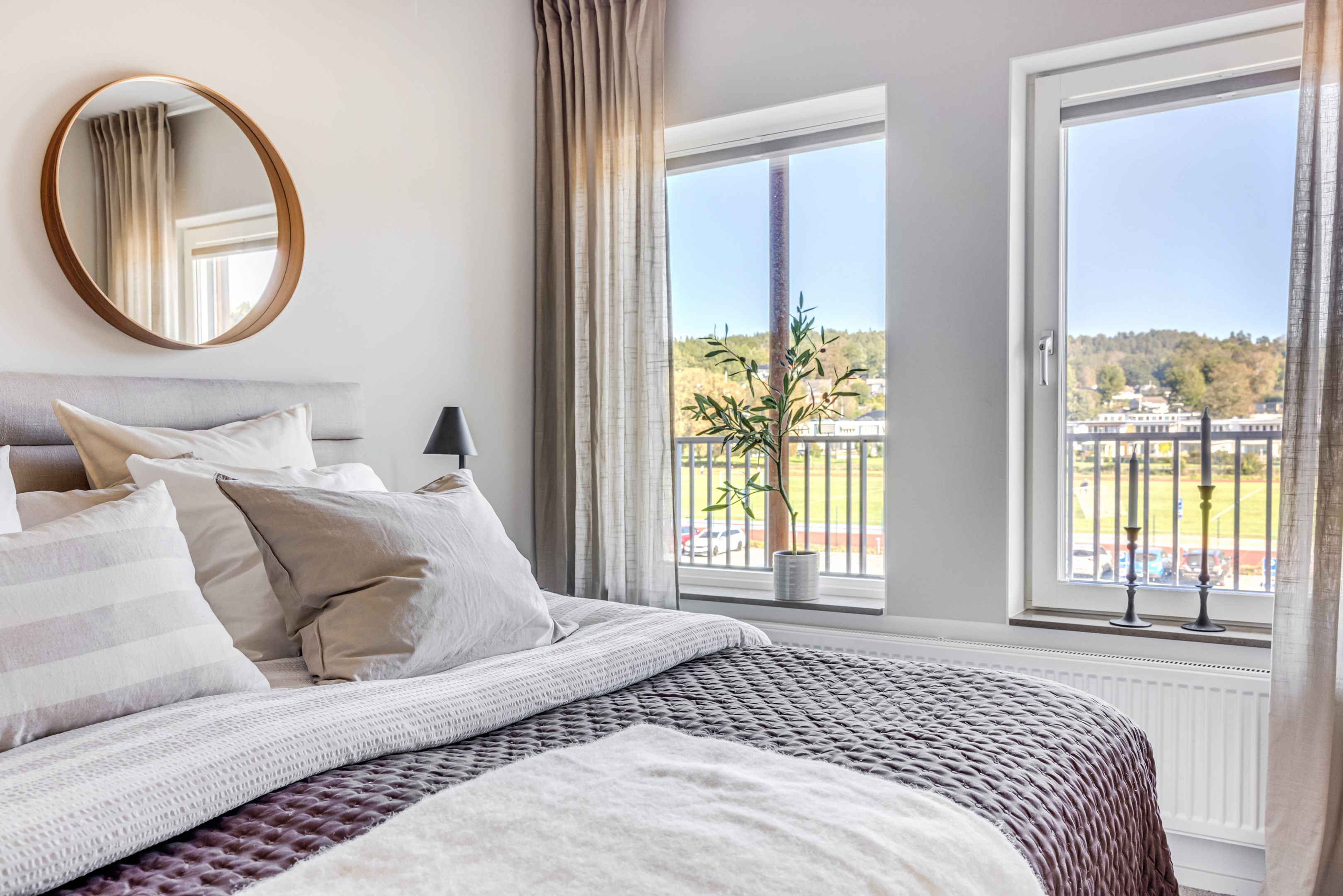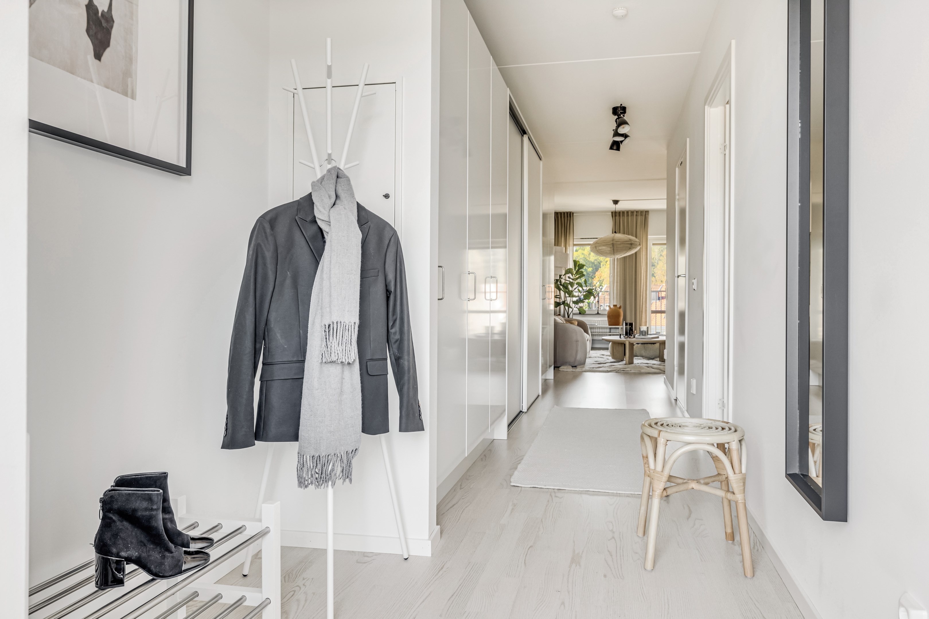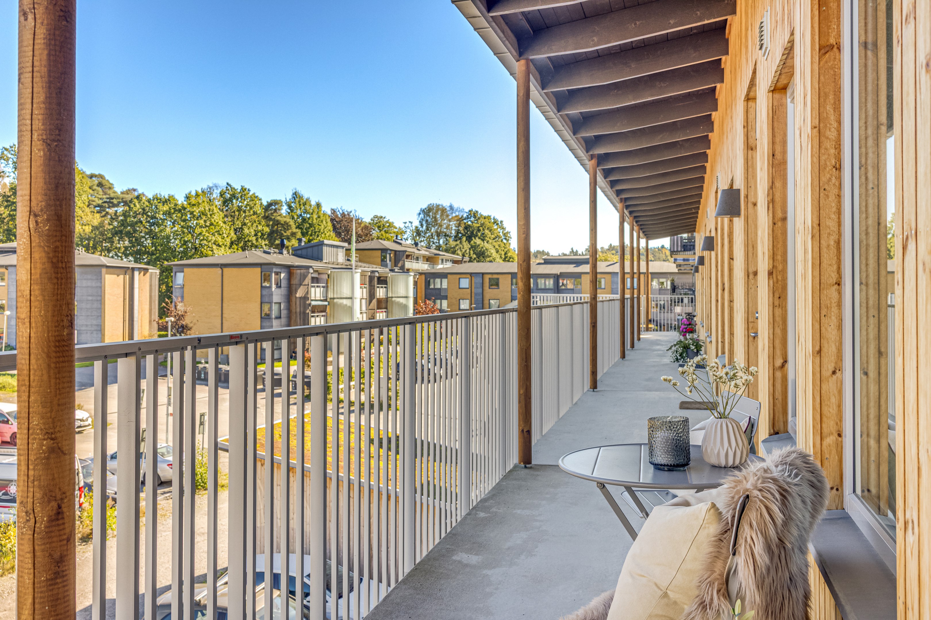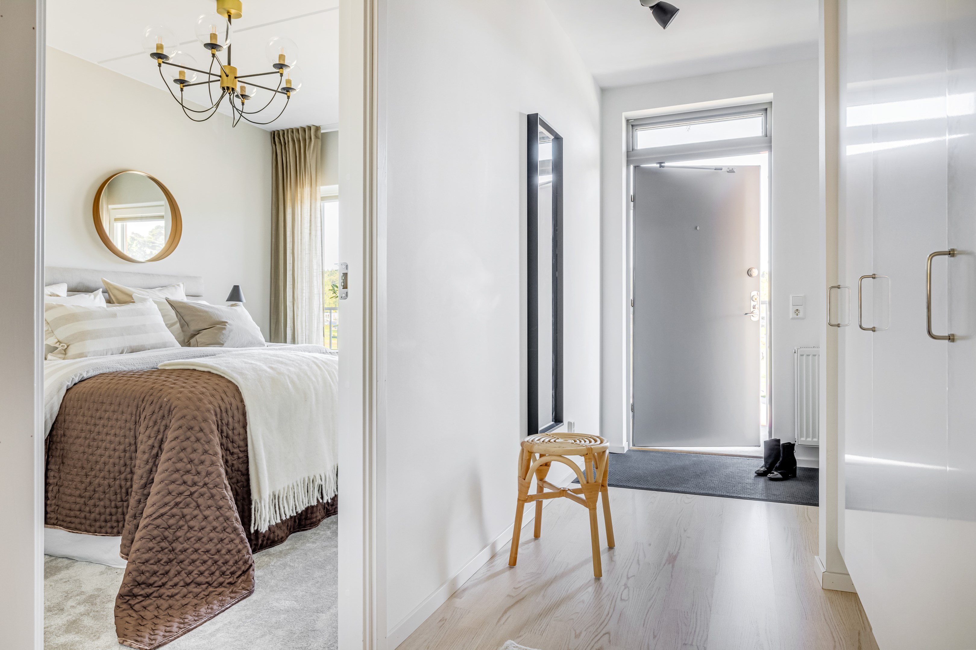 Via entré som ligger praktiskt under tak välkomnas du in i denna hemtrevliga bostad med genomgående planlösning. Interiört präglas bostaden av ett modernt formspråk med generös standard. Ljusa trägolv i ek och fönsterbrädor i kalksten samt kök från Marbodal, Tidaholm. Väggar, tak och innerdörrar går i vitt vilket skapar mycket ljus och rymd. Stor vikt har lagts på att utnyttja varje kvadratmeter på bästa sätt för att du ska få plats med allt som du behöver. Lägenheten har generösa ljusinsläpp med fri utsikt. Köket är skräddarsydd med målade luckor och matchande bänkskivor med tåliga arbetsytor. Stänkskydd i grått kakel. Underlimmad diskho i rostfritt. Bänkbelysning under väggskåp. Bostaden har rostfria vitvaror så som integrerad diskmaskin, induktionshäll, ugn, mikro och kolfilterfläkt. Här ges du gott om plats för att laga mat till både dig själv och dina gäster. Sällskapsytorna rymmer både soffa och matgrupp utan att det känns trångt. De smart planerade ytorna ger plats för att duka upp stort vid festligare tillfällen. Sommartid blir balkongen en mysig plats att umgås på. Ytan är generös och ger plats för två mindre utegrupper. Här erbjuds du möjlighet till rikligt med soltimmar. När den utanförliggande parken är klar blir vyn grönskande och fin. Badrummet är funktionellt och praktiskt med mörk grå klinker på golvet och vitt kakel på väggarna. Kommod, handfat, spegel, handdukstork och duschväggar i klarglas kommer från Svedbergs. Här finns elgolvvärme för bästa komfort. Ovan tvättmaskin och torktumlare finns bra arbetsytor på en bänkskiva i laminat och förvarning i vägghängda skåp. I hallen har du plats för att hänga av dig ytterkläder och skor. Gott om förvaringsutrymme finns i flertalet garderober och bakom skjutdörrar i vitt. Här finns även ett städskåp. Ett rogivande sovrum med plats för tillhörande möblemang når du från hallen. Här finns goda möjligheter till förvaring i två garderober. För dig som önskar mer förvaring finns det många olika smarta lösningar på att bygga upp en säng med byråar eller utdragbara halvgarderober under.