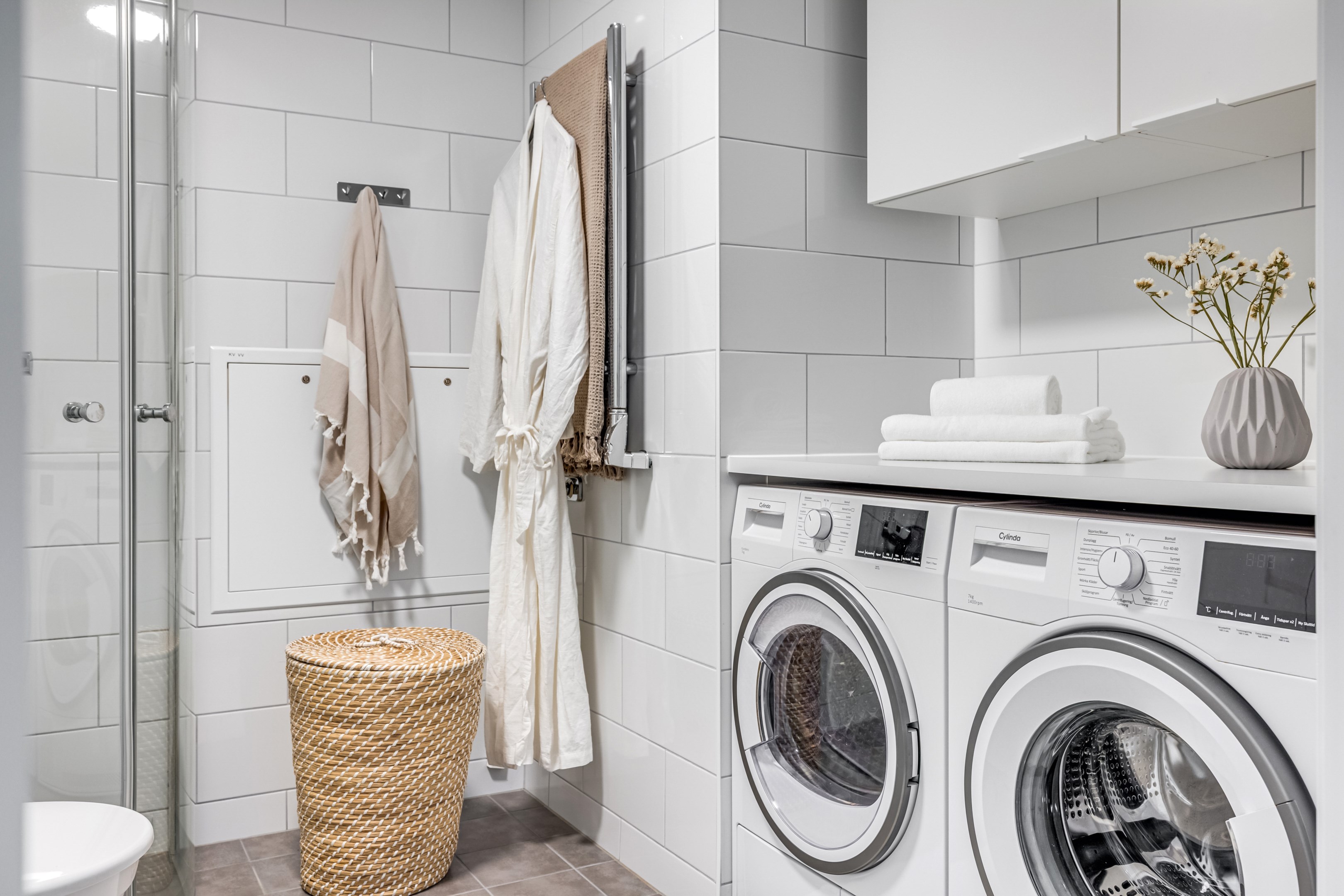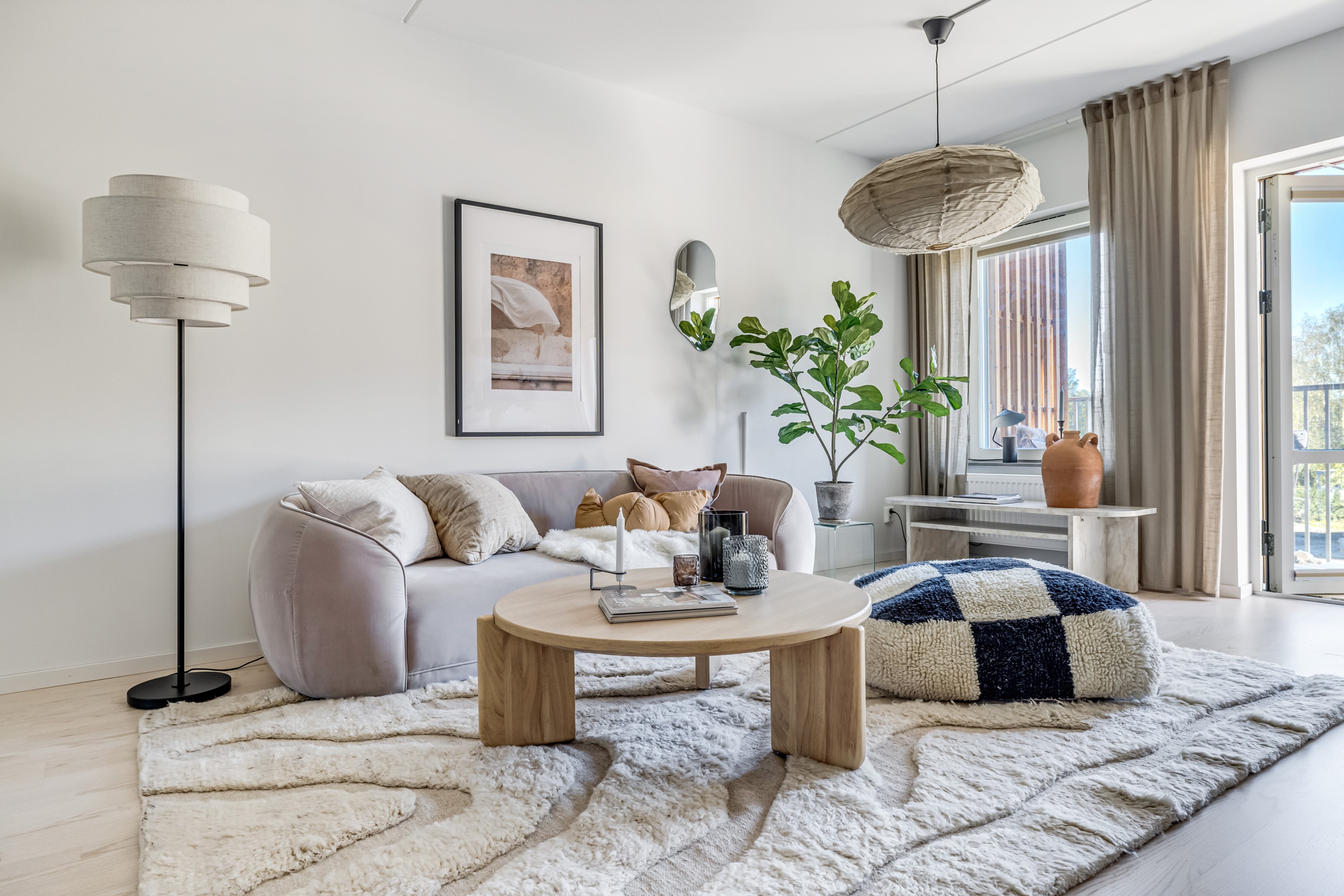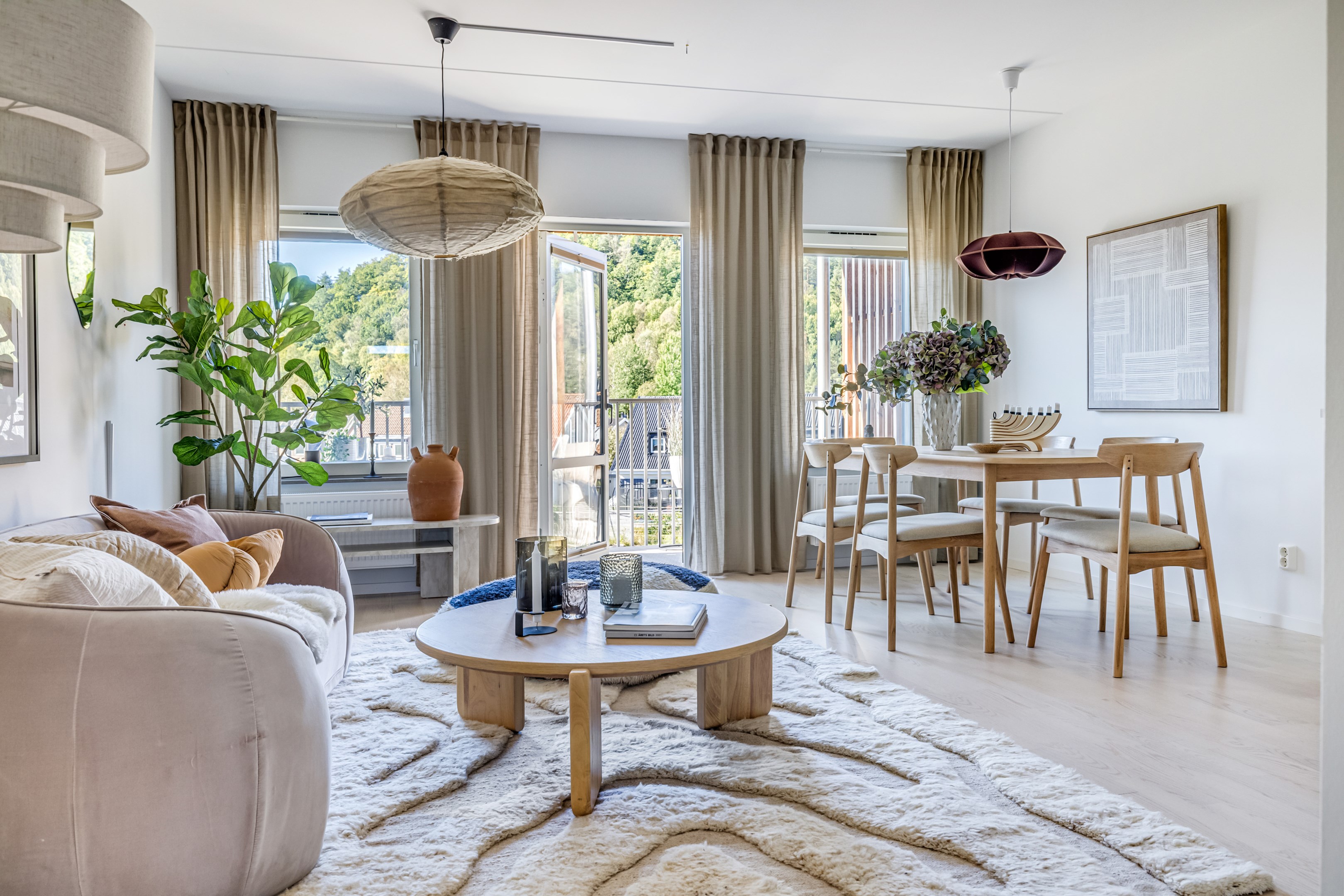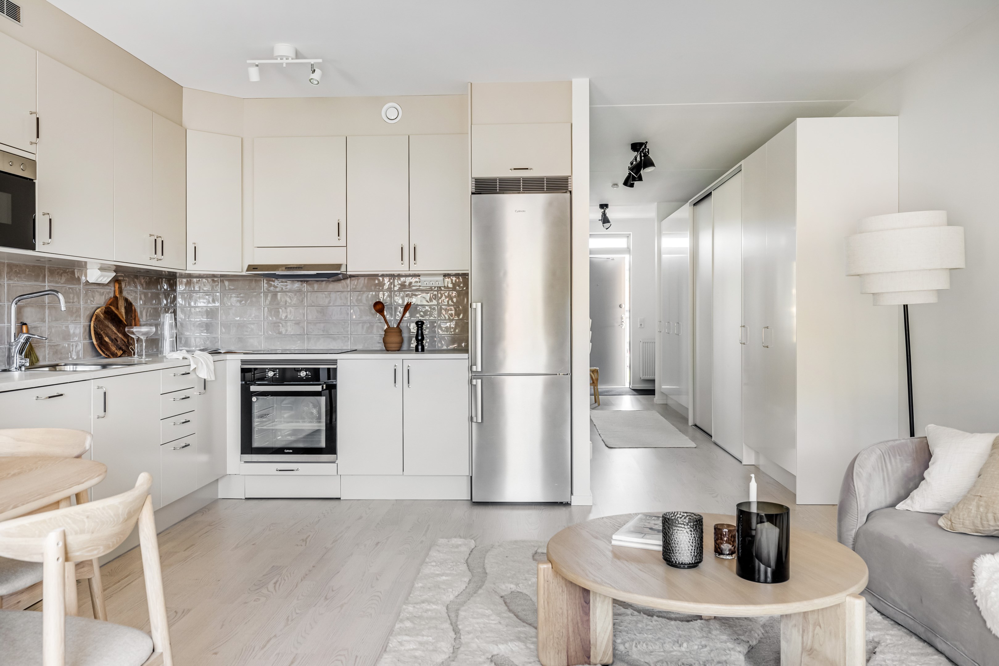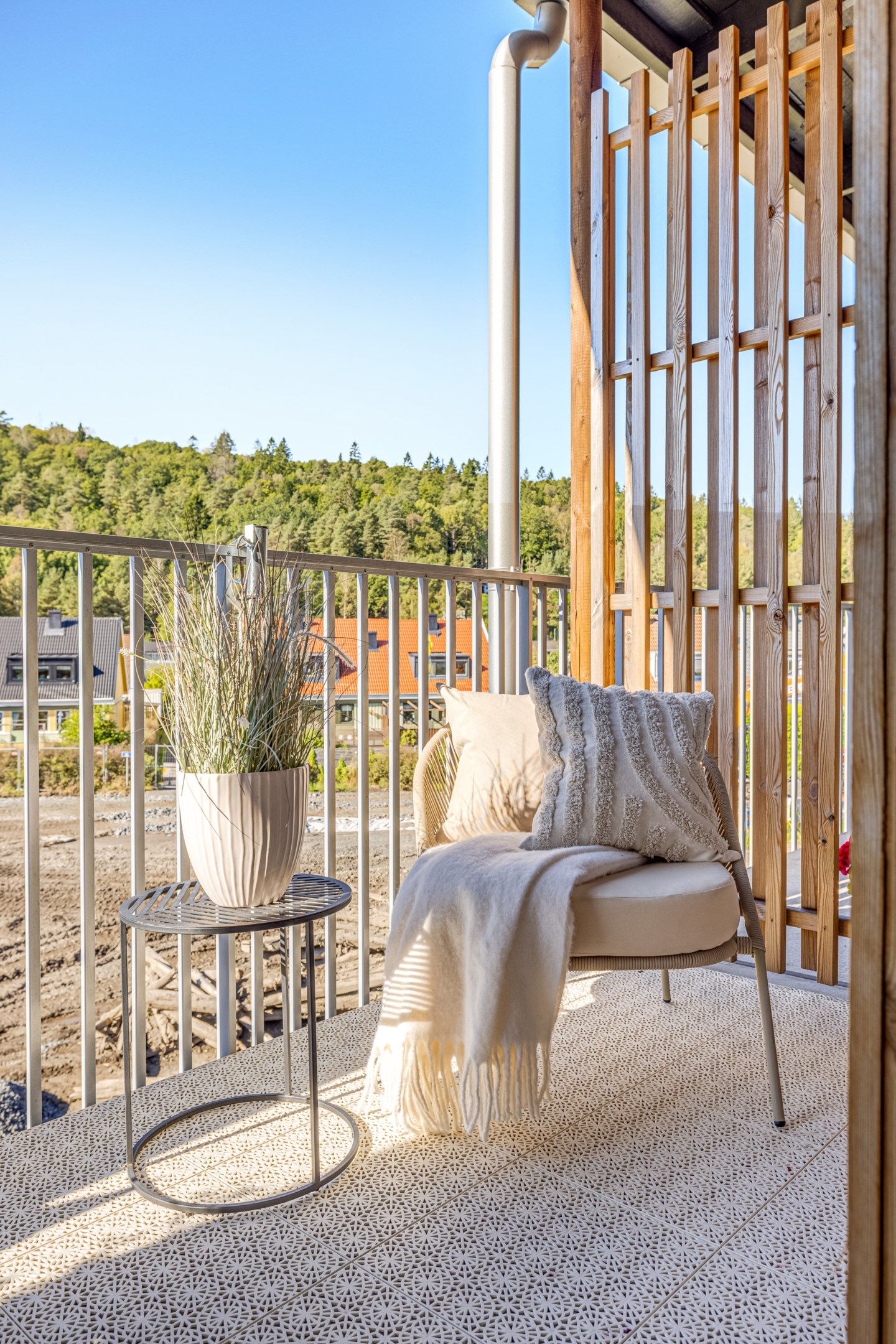 Via entré som ligger praktiskt under tak välkomnas du in i denna hemtrevliga bostad med genomgående planlösning. Interiört präglas bostaden av ett modernt formspråk med generös standard. Ljusa trägolv i ek och fönsterbrädor i kalksten samt kök från Marbodal, Tidaholm. Väggar, tak och innerdörrar går i vitt vilket skapar mycket ljus och rymd. Stor vikt har lagts på att utnyttja varje kvadratmeter på bästa sätt för att du ska få plats med allt som du behöver. Lägenheten har generösa ljusinsläpp med fri utsikt. Köket är skräddarsydd med målade luckor och matchande bänkskivor med tåliga arbetsytor. Stänkskydd i grått kakel. Underlimmad diskho i rostfritt. Bänkbelysning under väggskåp. Bostaden har rostfria vitvaror så som integrerad diskmaskin, induktionshäll, ugn, mikro och kolfilterfläkt. Här ges du gott om plats för att laga mat till både dig själv och dina gäster. Sällskapsytorna rymmer både soffa och matgrupp utan att det känns trångt. De smart planerade ytorna ger plats för att duka upp stort vid festligare tillfällen. Sommartid blir balkongen en mysig plats att umgås på. Ytan är generös och ger plats för två mindre utegrupper. Här erbjuds du möjlighet till rikligt med soltimmar. När den utanförliggande parken är klar blir vyn grönskande och fin. Badrummet är funktionellt och praktiskt med mörk grå klinker på golvet och vitt kakel på väggarna. Kommod, handfat, spegel, handdukstork och duschväggar i klarglas kommer från Svedbergs. Här finns elgolvvärme för bästa komfort. Ovan tvättmaskin och torktumlare finns bra arbetsytor på en bänkskiva i laminat och förvarning i vägghängda skåp. I hallen har du plats för att hänga av dig ytterkläder och skor. Gott om förvaringsutrymme finns i flertalet garderober och bakom skjutdörrar i vitt. Här finns även ett städskåp. Ett rogivande sovrum med plats för tillhörande möblemang når du från hallen. Här finns goda möjligheter till förvaring i två garderober. För dig som önskar mer förvaring finns det många olika smarta lösningar på att bygga upp en säng med byråar eller utdragbara halvgarderober under.