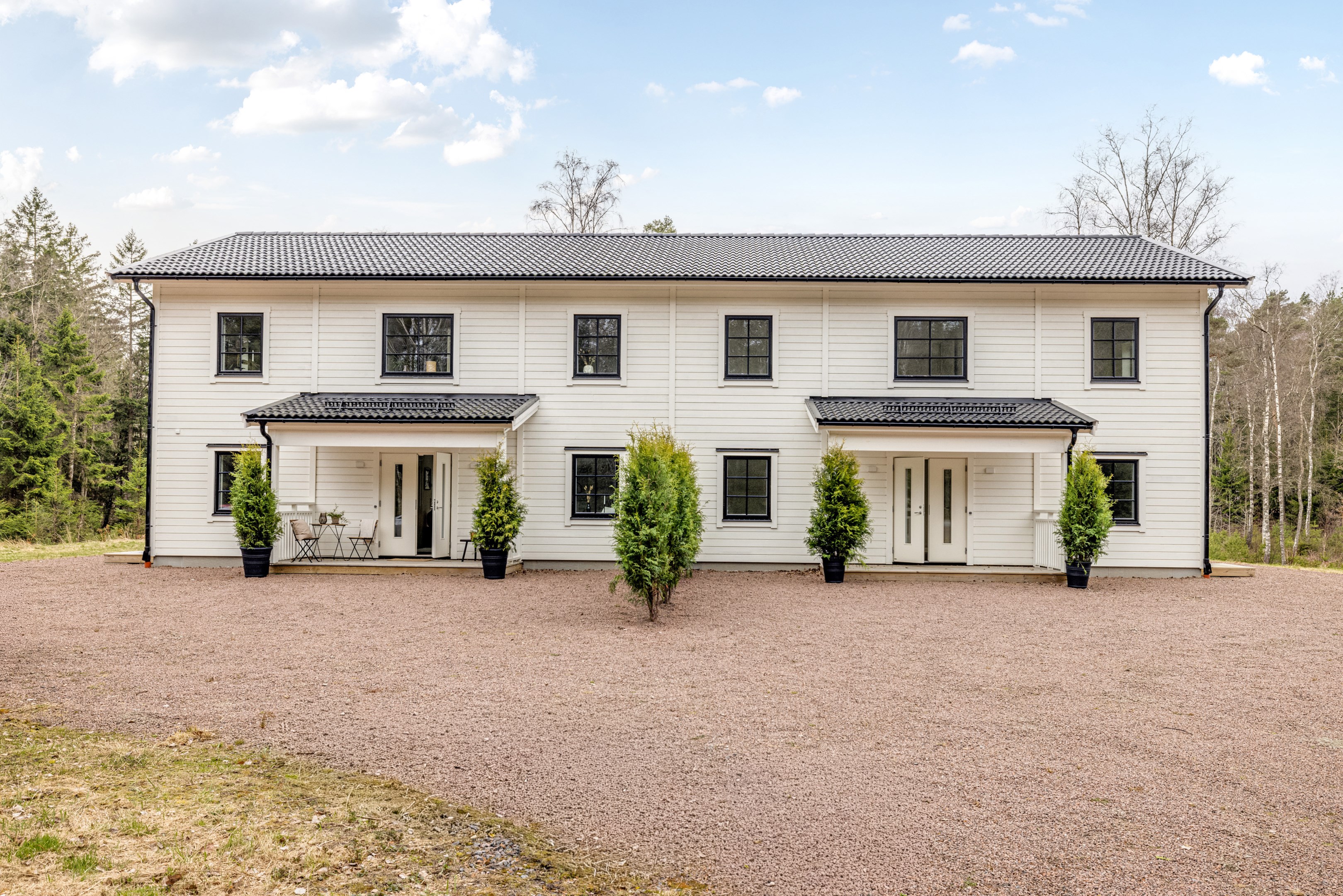 NYPRODUCERAT PARHUS FRÅN A-HUS MED HÖG STANDARD, MINIMALA DRIFTSKOSTNADER OCH UTSIKT ÖVER GLITTRANDE VATTEN För mer inomhusbilder, gå in på Benarebyvägen 181. Detta huset är identiskt med det andra parhuset men spegelvänt. Vill du köpa ett eget hus men bo nära bästa vännen eller någon i familjen? Då är denna fastigheten ett perfekt hus då båda parhusen är tillgängliga. Välkommen till ett stilrent parhus, där kvalitet, komfort och genomtänkt design möts i perfekt harmoni. Här erbjuds ett hem med generösa rumsvolymer, ett fantastiskt ljusflöde och en flexibel planlösning med upp till fem sovrum – eller kontor och 3 sovrum kombinerat med en lyxigt stor walk-in closet för dig som värdesätter extra förvaring och hotellkänsla i vardagen. Bostaden präglas av påkostade och enhetliga materialval. Vackra parkettgolv från Kährs löper genom hela huset och samspelar elegant med det moderna köket från Marbodal i stilfull grafitgrå kulör. Här finns en välutrustad maskinpark från Siemens som gör vardagen både smidig och bekväm. De öppna och lättmöblerade ytorna mellan kök och vardagsrum skapar en naturlig samlingsplats för familj och vänner. Förberett för kamin. De svarta kvalitetsfönstren från Traryd förstärker det moderna uttrycket och ramar in utsikten på ett smakfullt sätt. På entréplanet bidrar vattenburen golvvärme till en behaglig inomhuskomfort året om. På övre plan möts du av ett stort och inbjudande allrum med härligt ljusinsläpp, en perfekt plats för avkoppling eller familjens gemensamma stunder. Här finns även bostadens större sovrum samlade, vilket skapar en privat och lugn sovdel. Bostaden erbjuder två stilrena, helkaklade badrum samt en rymlig och praktisk tvättstuga med separat entré – en funktionell lösning som underlättar vardagen, särskilt för barnfamiljen eller den aktiva. Via helglasade dubbeldörrar öppnar du upp mot en stor altan i skyddat läge, där du kan njuta av solen större delen av dagen och en rogivande utsikt över Djurtjärn. Här skapas en perfekt plats för både avkoppling och sociala stunder i en lugn och naturskön miljö. Huset har inte bara minimalt med underhåll i många år, det är också energieffektivt och ekonomiskt och fick inte en enda anmärkning på besiktningen. Med energiklass B, ett effektivt värmesystem och ett modernt minireningsverk utan kemikalier hålls driftkostnaderna på en mycket låg nivå, vilket ger ett hållbart boende både för plånboken och miljön. Läget är optimalt för dig som vill kombinera natur och närhet till service. Här bor du i ett stillsamt område med naturen runt knuten, samtidigt som busshållplats finns några 100m från huset och med bil tar du dig till centrala Mölnlycke på cirka 9 minuter. I närområdet finns många fina badsjöar såsom Rådasjön, Stensjön och populära Finnsjön med fina motionsspår och otrolig natur. Även Bråtaskogens naturreservat erbjuder mäktiga naturupplevelser. Gunnebo slott, Wendelsberg och Råda säteri är populära utflyktsmål. Mölnlycke centrums växande utbud erbjuder matvaruaffärer, torghandel, restauranger, caféer, stenungsbageri, systembolag och flera mysiga små inredningsbutiker. För den aktive ligger padelanläggning, tennisbanor, gymkedjan SATS och golfbana i Öjersjö på bekvämt avstånd. Även den anrika innebandyföreningen Pixbo håller till i Mölnlycke. Mycket bra bussförbindelser både till Göteborg och Mölndal.