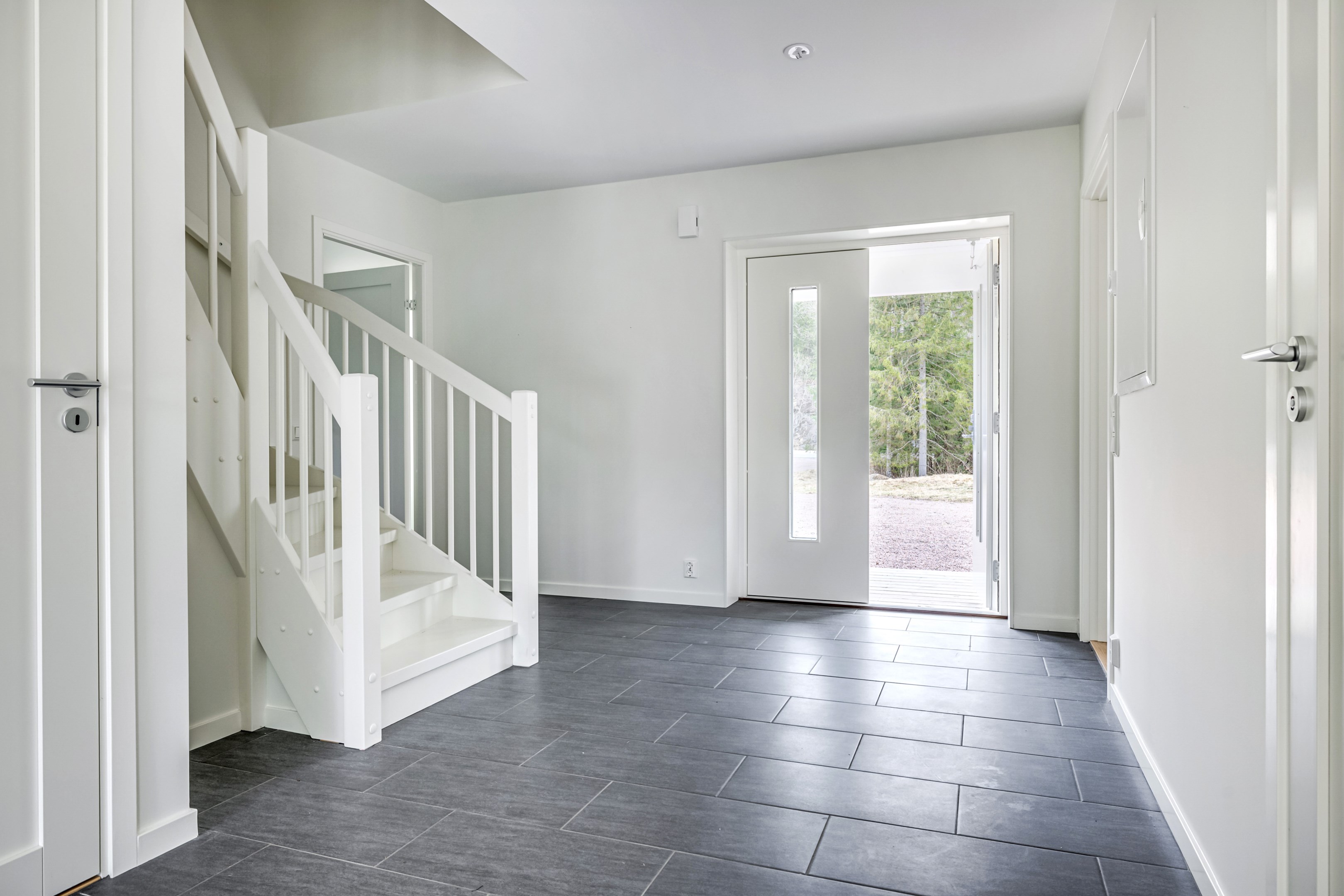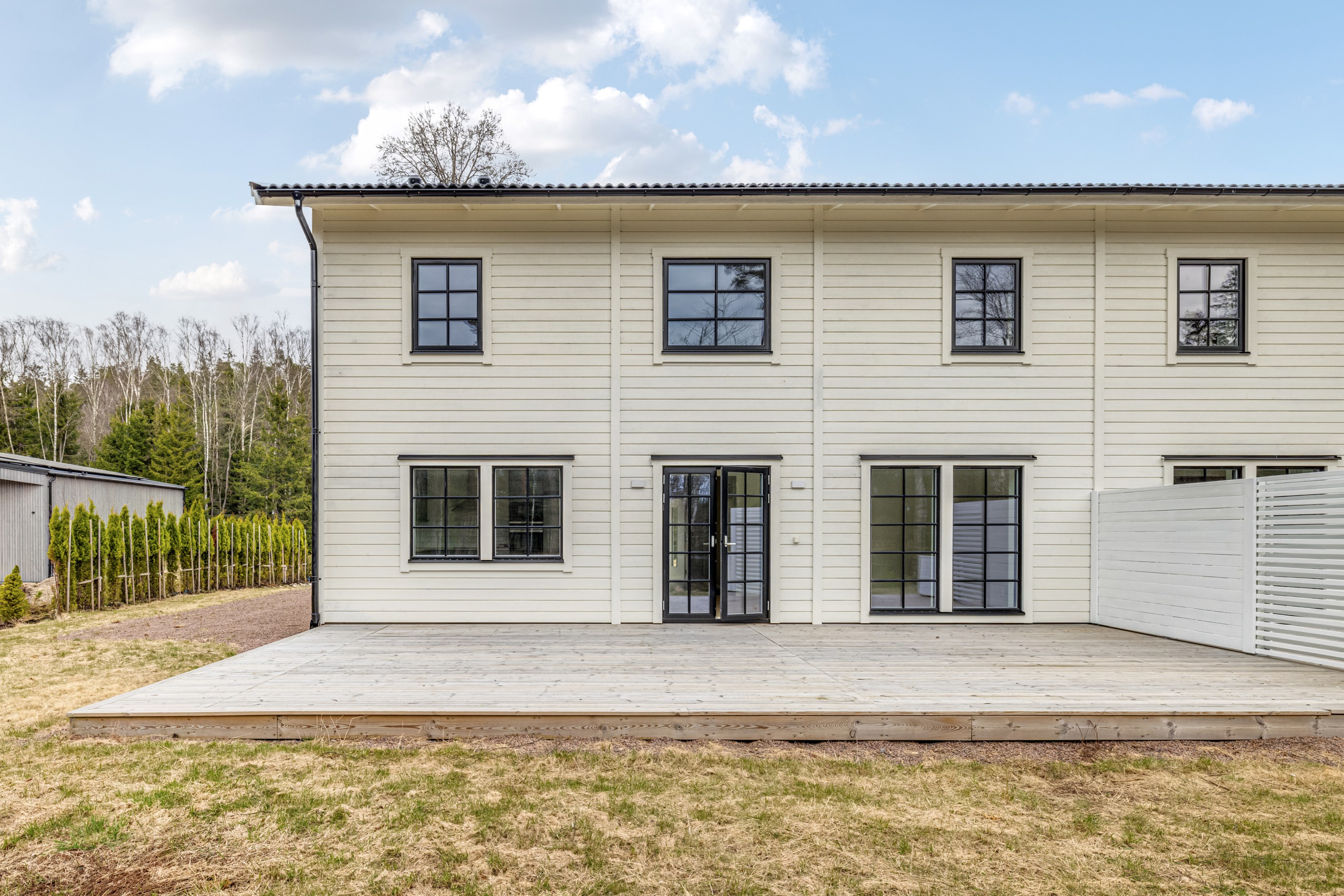 ENTRÉPLAN Du välkomnas in i detta väl tilltagna parhus via en veranda som har plats för en liten sittbänk eller cafégrupp. Skönt med entré under tak. I hallen finns plats för att hänga av dig ytterkläder och skor och bra ytor finns för att sätta in garderober. Hela entréplanet har vattenburen golvvärme. På alla golv i huset ligger en fin parkett i ek från Kährs, Abetone tjocklek 13 mm. Alla väggarna är genomgående målade i vitt för en ljus och enhetlig känsla. Entrén öppnar upp hemmet med en fri siktlinje genom huset och vidare ut mot uteplats och den grönskande skogen. Tvättstugan är rymlig och har både fönster och separat entré ut till trädgården. Förvaring finns i en tvättbänk med ho och arbetsytor på en grå bänkskiva i laminat ovanför tvättmaskin och torktumlare från energisnåla Siemens iQ300. Här står husets värmekälla, en frånluftsvärmepump Nibe F730 som har en färgdisplay med enkla menyer och tydligt symbolspråk som gör att du smidigt kan styra förbrukning och överblicka exempelvis drifttid, eller skapa egna, personliga inställningar. På golvet ligger en mörk klinker och väggarna är målad i vitt. Det helkaklade badrummet har inredning från Svedbergs. Duschväggar i klarglas Skoga Hörn Rak 90x90, handfat med kommod, Skuru spegelskåp med ledbelysning och wc-stol med dämpning i sitsen. Blandare och duschdel från Oras. I anslutning till hallen ligger ett rum att nyttja efter eget behov. Kontor, klädvård, gästrum eller kanske ett litet lekrum till barnen. Vidare in i huset ligger kök och vardagsrum i en öppen och lättmöblerad lösning. Köket som är i bra storlek erbjuder dig gott om förvaring i rikligt med skåp i fullhöjd och utdragbara lådor. Ovanför bänkskivan i laminat, Perito ljus, sitter ett vitt fasat kakel i halvförband. Trevligt med ett sidofönster ovanför kökshon vilket ger dig utsikt åt två håll. Köksblandare kommer från Oras. Den energisnåla maskinparken kommer från Siemens och är i rostfritt utförande. Vitvarorna består av en hel kyl och frys iQ500, induktionshäll IQ 100, varmluftsugn och mikro iQ700, köksfläkt och en helintegrerad diskmaskin. Intill det stora fönstret får matgruppen sin givna plats. Här finns gott om plats för att duka upp stort till festligare tillfällen. Vardagsrummet bjuder på ett härligt ljusinsläpp via stora fönsterpartier från golv till tak. Rummet upplevs rymligt och har gott om plats för både soffgrupp och tillhörande möblemang. Helglasade dubbeldörrar öppnar den generösa altanen som är som en egen liten privat oas sommartid. ÖVRE PLAN Under trapphuset som leder upp till övre plan finns bra förvaringsyta. På övre plan möts du av härliga rumsvolymer i en flexibel lösning. Allrummets öppna ytor ger ett fint ljusflöde till det övre planet. Ett härligt rum för samvaro, lek- spel och tv-tittande. Ljusinsläppet är påtagligt och utsikten är rogivande. Härifrån når du luckan till vinden som har plats för lite förvaring. Möjlighet finns att lägga golv på vinden för ytterligare förvaring. På vardera sida om allrummet ligger ett väl tilltaget sovrum. Båda rummen har plats för det mesta som önskas såsom säng, skrivbord, byråar och garderober. Det ena rummet har ljusinsläpp från två håll. Det största sovrummet har gott om plats för både dubbelsäng och garderober. Innanför ligger en stor klädkammare med fönster åt två håll. Rummet kan likaväl användas som kontor, sovrum eller kanske bebisrum. Det helkaklade badrummet har både dusch och badkar och inredning från Svedbergs. Duschväggar i klarglas Skoga Hörn Rak 90x90, handfat med kommod, Skuru spegelskåp med ledbelysning och wc-stol med dämpning i sitsen. Blandare och duschdel från Oras.