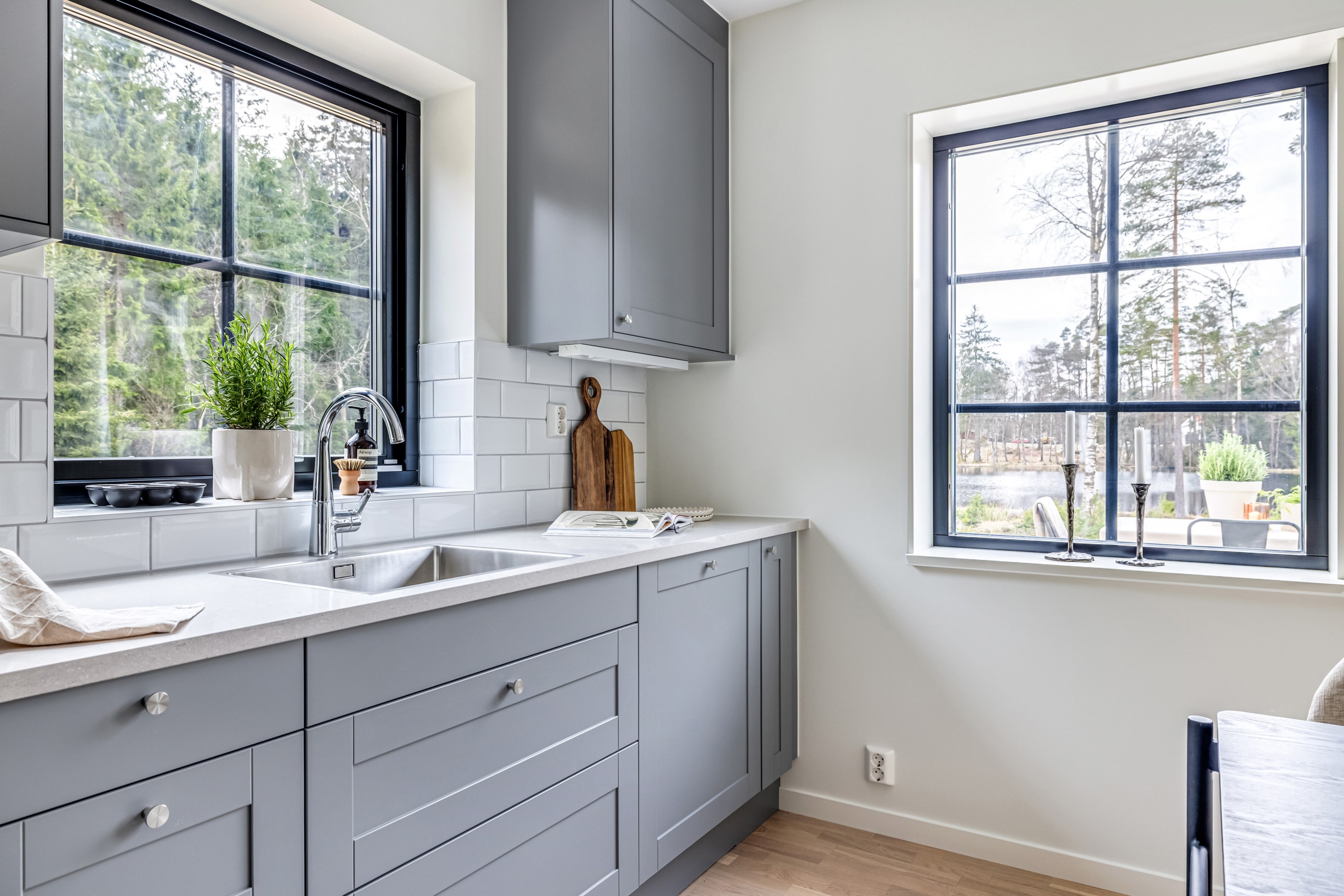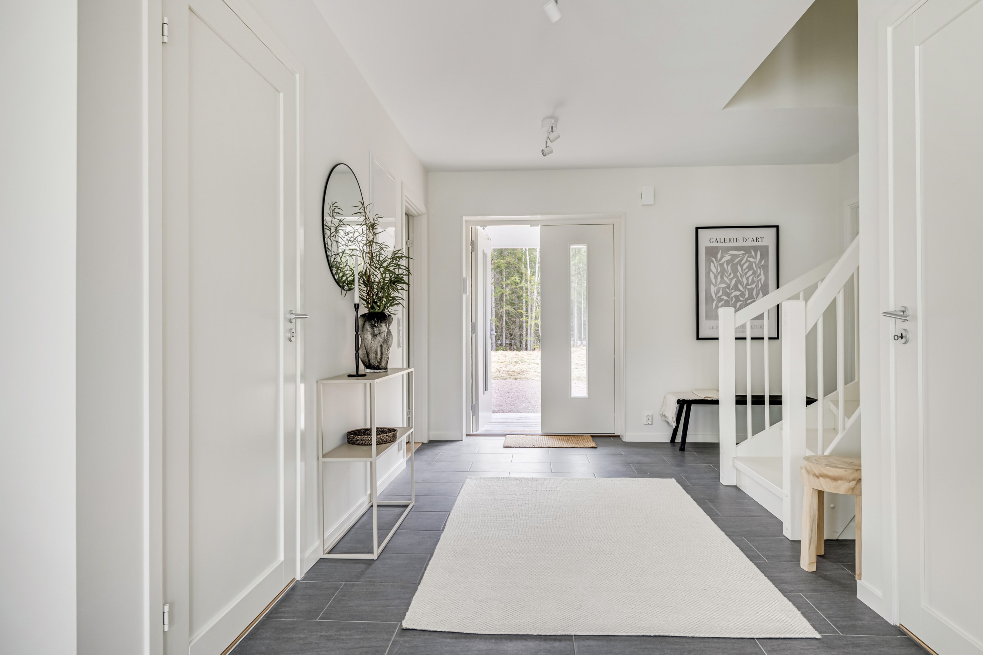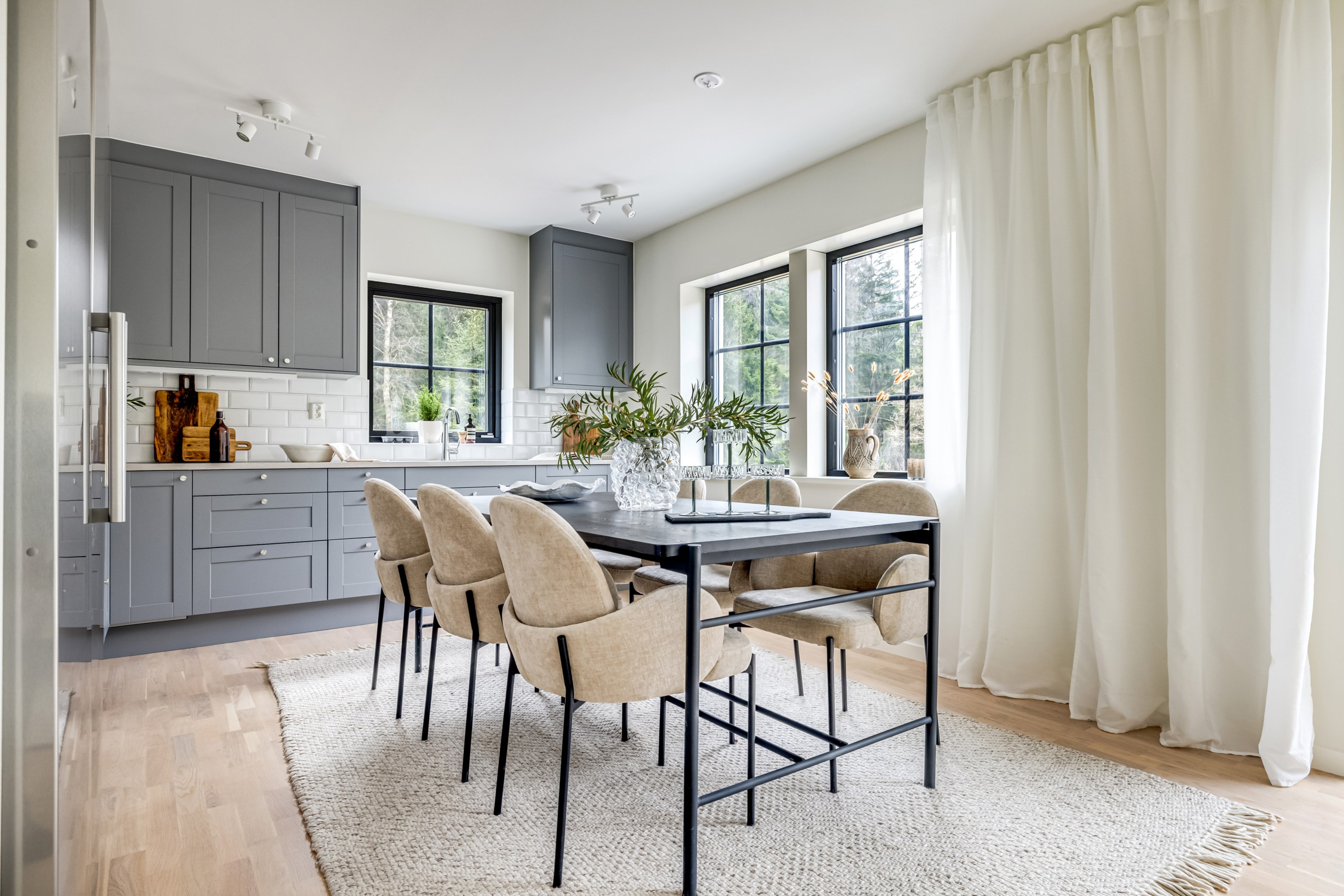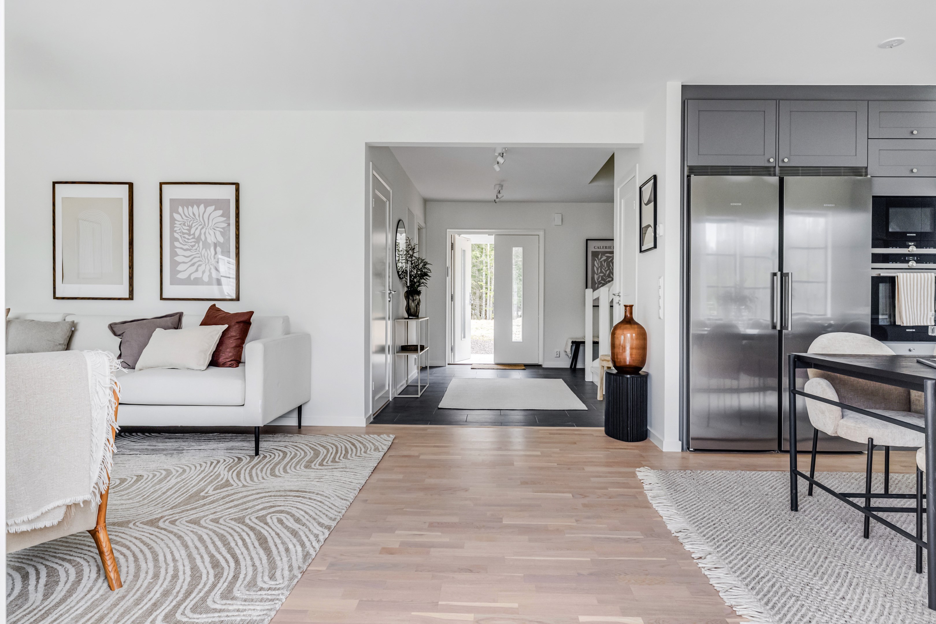 ENTRÉPLAN Du välkomnas in i detta väl tilltagna parhus via en veranda som har plats för en liten sittbänk eller cafégrupp. Skönt med entré under tak. I hallen finns plats för att hänga av dig ytterkläder och skor och bra ytor finns för att sätta in garderober. Hela entréplanet har vattenburen golvvärme. På alla golv i huset ligger en fin parkett i ek från Kährs, Abetone tjocklek 13 mm. Alla väggarna är genomgående målade i vitt för en ljus och enhetlig känsla. Entrén öppnar upp hemmet med en fri siktlinje genom huset och vidare ut mot uteplats och den grönskande skogen. Tvättstugan är rymlig och har både fönster och separat entré ut till trädgården. Förvaring finns i en tvättbänk med ho och arbetsytor på en grå bänkskiva i laminat ovanför tvättmaskin och torktumlare från energisnåla Siemens iQ300. Här står husets värmekälla, en frånluftsvärmepump Nibe F730 som har en färgdisplay med enkla menyer och tydligt symbolspråk som gör att du smidigt kan styra förbrukning och överblicka exempelvis drifttid, eller skapa egna, personliga inställningar. På golvet ligger en mörk klinker och väggarna är målad i vitt. Det helkaklade badrummet har inredning från Svedbergs. Duschväggar i klarglas Skoga Hörn Rak 90x90, handfat med kommod, Skuru spegelskåp med ledbelysning och wc-stol med dämpning i sitsen. Blandare och duschdel från Oras. I anslutning till hallen ligger ett rum att nyttja efter eget behov. Kontor, klädvård, gästrum eller kanske ett litet lekrum till barnen. Vidare in i huset ligger kök och vardagsrum i en öppen och lättmöblerad lösning. Köket som är i bra storlek erbjuder dig gott om förvaring i rikligt med skåp i fullhöjd och utdragbara lådor. Ovanför bänkskivan i laminat, Perito ljus, sitter ett vitt fasat kakel i halvförband. Trevligt med ett sidofönster ovanför kökshon vilket ger dig utsikt åt två håll. Köksblandare kommer från Oras. Den energisnåla maskinparken kommer från Siemens och är i rostfritt utförande. Vitvarorna består av en hel kyl och frys iQ500, induktionshäll IQ 100, varmluftsugn och mikro iQ700, köksfläkt och en helintegrerad diskmaskin. Intill det stora fönstret får matgruppen sin givna plats. Här finns gott om plats för att duka upp stort till festligare tillfällen. Vardagsrummet bjuder på ett härligt ljusinsläpp via stora fönsterpartier från golv till tak. Rummet upplevs rymligt och har gott om plats för både soffgrupp och tillhörande möblemang. Helglasade dubbeldörrar öppnar den generösa altanen som är som en egen liten privat oas sommartid. ÖVRE PLAN Under trapphuset som leder upp till övre plan finns bra förvaringsyta. På övre plan möts du av härliga rumsvolymer i en flexibel lösning. Allrummets öppna ytor ger ett fint ljusflöde till det övre planet. Ett härligt rum för samvaro, lek- spel och tv-tittande. Ljusinsläppet är påtagligt och utsikten är rogivande. Härifrån når du luckan till vinden som har plats för lite förvaring. Möjlighet finns att lägga golv på vinden för ytterligare förvaring. På vardera sida om allrummet ligger ett väl tilltaget sovrum. Båda rummen har plats för det mesta som önskas såsom säng, skrivbord, byråar och garderober. Det ena rummet har ljusinsläpp från två håll. Det största sovrummet har gott om plats för både dubbelsäng och garderober. Innanför ligger en stor klädkammare med fönster åt två håll. Rummet kan likaväl användas som kontor, sovrum eller kanske bebisrum. Det helkaklade badrummet har både dusch och badkar och inredning från Svedbergs. Duschväggar i klarglas Skoga Hörn Rak 90x90, handfat med kommod, Skuru spegelskåp med ledbelysning och wc-stol med dämpning i sitsen. Blandare och duschdel från Oras.