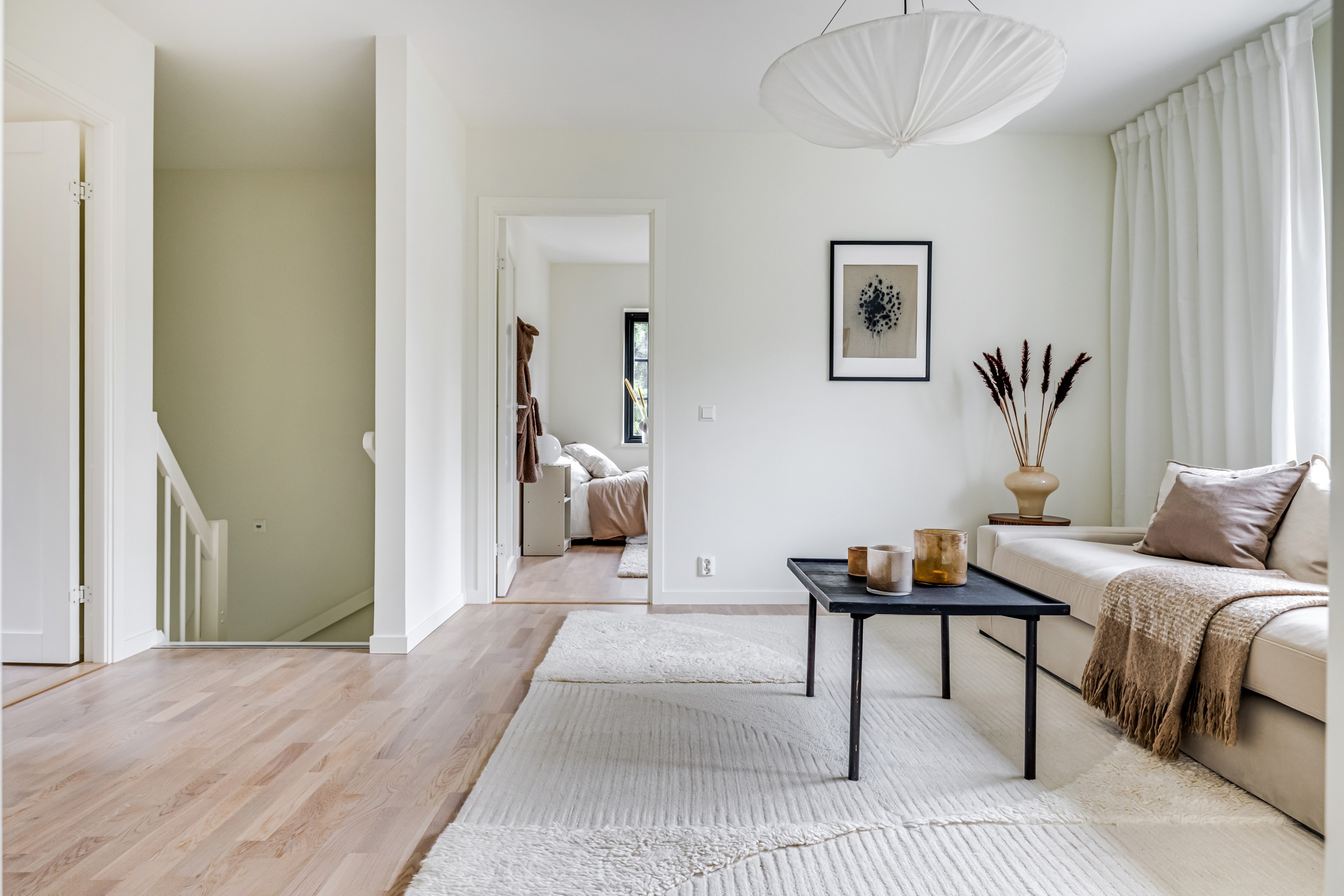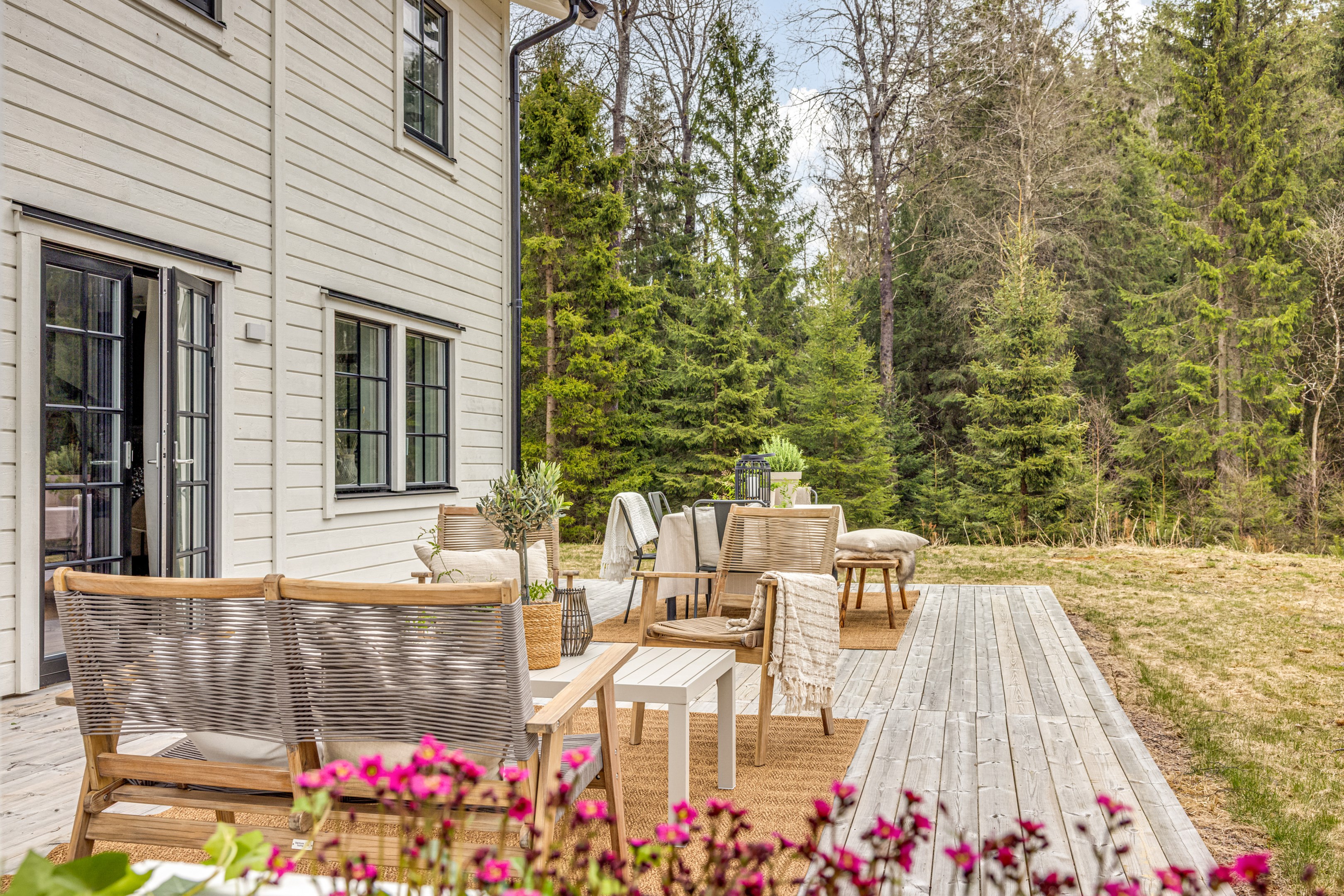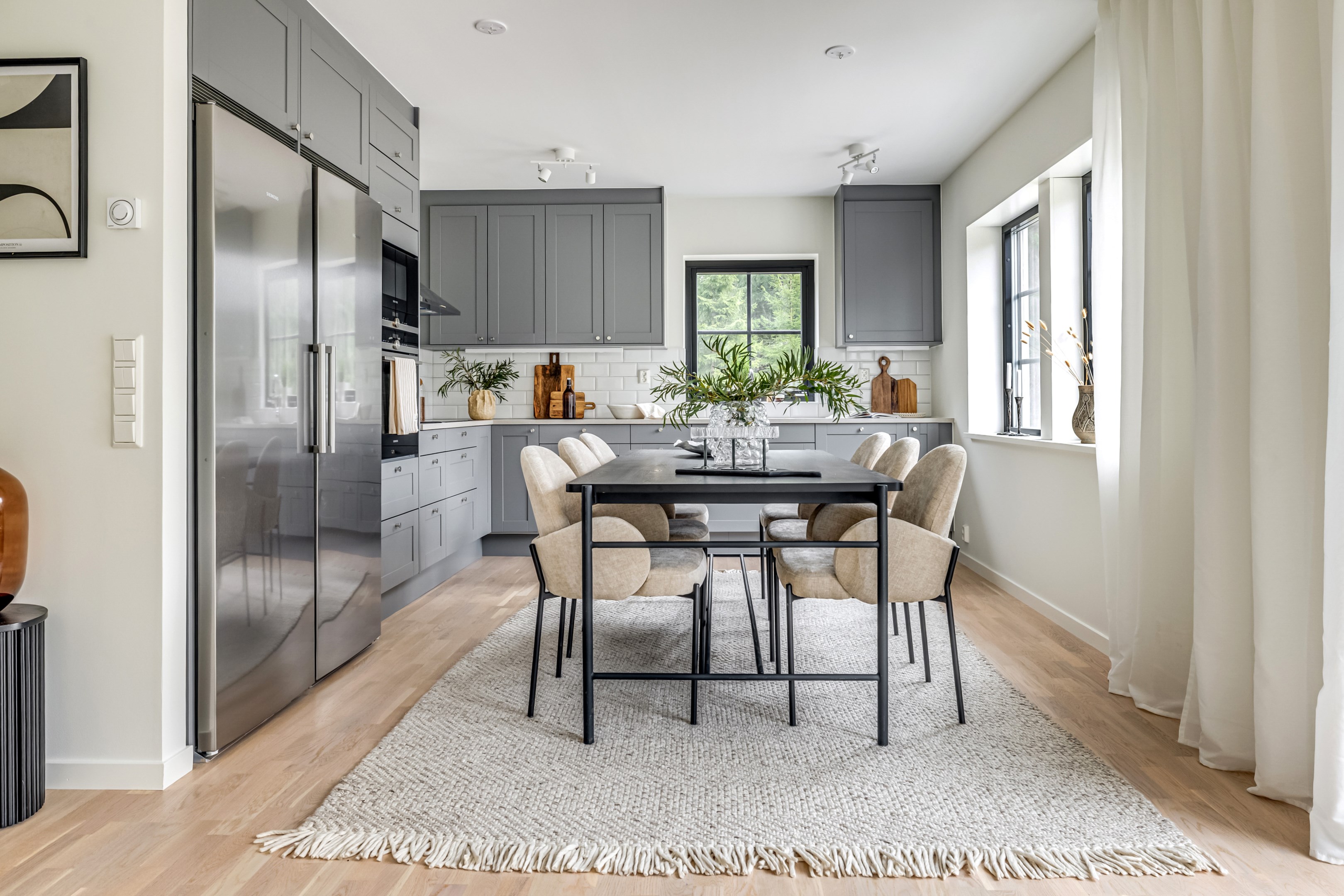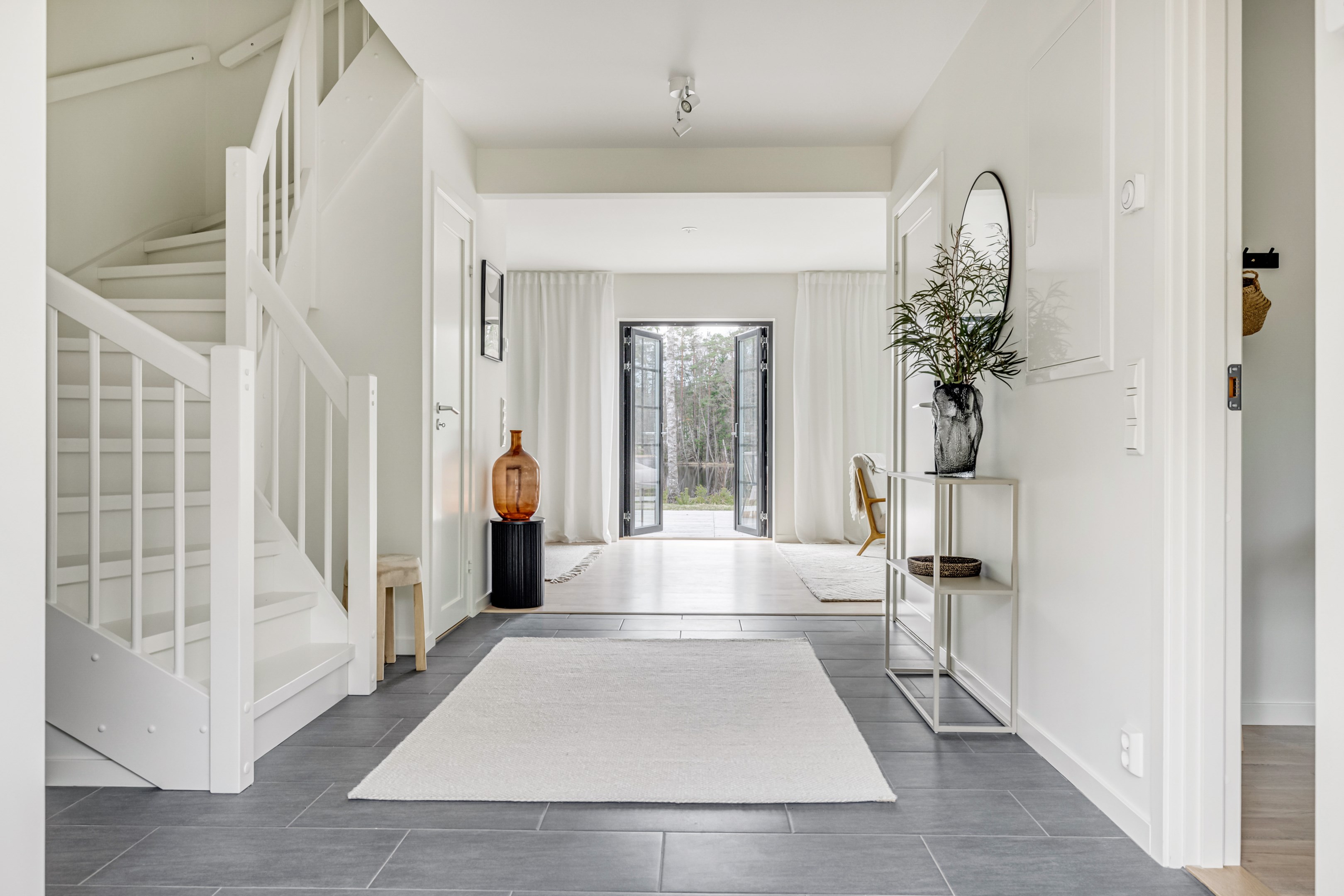 ENTRÉPLAN Du välkomnas in i detta väl tilltagna parhus via en veranda som har plats för en liten sittbänk eller cafégrupp. Skönt med entré under tak. I hallen finns plats för att hänga av dig ytterkläder och skor och bra ytor finns för att sätta in garderober. Hela entréplanet har vattenburen golvvärme. På alla golv i huset ligger en fin parkett i ek från Kährs, Abetone tjocklek 13 mm. Alla väggarna är genomgående målade i vitt för en ljus och enhetlig känsla. Entrén öppnar upp hemmet med en fri siktlinje genom huset och vidare ut mot uteplats och den grönskande skogen. Tvättstugan är rymlig och har både fönster och separat entré ut till trädgården. Förvaring finns i en tvättbänk med ho och arbetsytor på en grå bänkskiva i laminat ovanför tvättmaskin och torktumlare från energisnåla Siemens iQ300. Här står husets värmekälla, en frånluftsvärmepump Nibe F730 som har en färgdisplay med enkla menyer och tydligt symbolspråk som gör att du smidigt kan styra förbrukning och överblicka exempelvis drifttid, eller skapa egna, personliga inställningar. På golvet ligger en mörk klinker och väggarna är målad i vitt. Det helkaklade badrummet har inredning från Svedbergs. Duschväggar i klarglas Skoga Hörn Rak 90x90, handfat med kommod, Skuru spegelskåp med ledbelysning och wc-stol med dämpning i sitsen. Blandare och duschdel från Oras. I anslutning till hallen ligger ett rum att nyttja efter eget behov. Kontor, klädvård, gästrum eller kanske ett litet lekrum till barnen. Vidare in i huset ligger kök och vardagsrum i en öppen och lättmöblerad lösning. Köket som är i bra storlek erbjuder dig gott om förvaring i rikligt med skåp i fullhöjd och utdragbara lådor. Ovanför bänkskivan i laminat, Perito ljus, sitter ett vitt fasat kakel i halvförband. Trevligt med ett sidofönster ovanför kökshon vilket ger dig utsikt åt två håll. Köksblandare kommer från Oras. Den energisnåla maskinparken kommer från Siemens och är i rostfritt utförande. Vitvarorna består av en hel kyl och frys iQ500, induktionshäll IQ 100, varmluftsugn och mikro iQ700, köksfläkt och en helintegrerad diskmaskin. Intill det stora fönstret får matgruppen sin givna plats. Här finns gott om plats för att duka upp stort till festligare tillfällen. Vardagsrummet bjuder på ett härligt ljusinsläpp via stora fönsterpartier från golv till tak. Rummet upplevs rymligt och har gott om plats för både soffgrupp och tillhörande möblemang. Helglasade dubbeldörrar öppnar den generösa altanen som är som en egen liten privat oas sommartid. ÖVRE PLAN Under trapphuset som leder upp till övre plan finns bra förvaringsyta. På övre plan möts du av härliga rumsvolymer i en flexibel lösning. Allrummets öppna ytor ger ett fint ljusflöde till det övre planet. Ett härligt rum för samvaro, lek- spel och tv-tittande. Ljusinsläppet är påtagligt och utsikten är rogivande. Härifrån når du luckan till vinden som har plats för lite förvaring. Möjlighet finns att lägga golv på vinden för ytterligare förvaring. På vardera sida om allrummet ligger ett väl tilltaget sovrum. Båda rummen har plats för det mesta som önskas såsom säng, skrivbord, byråar och garderober. Det ena rummet har ljusinsläpp från två håll. Det största sovrummet har gott om plats för både dubbelsäng och garderober. Innanför ligger en stor klädkammare med fönster åt två håll. Rummet kan likaväl användas som kontor, sovrum eller kanske bebisrum. Det helkaklade badrummet har både dusch och badkar och inredning från Svedbergs. Duschväggar i klarglas Skoga Hörn Rak 90x90, handfat med kommod, Skuru spegelskåp med ledbelysning och wc-stol med dämpning i sitsen. Blandare och duschdel från Oras.