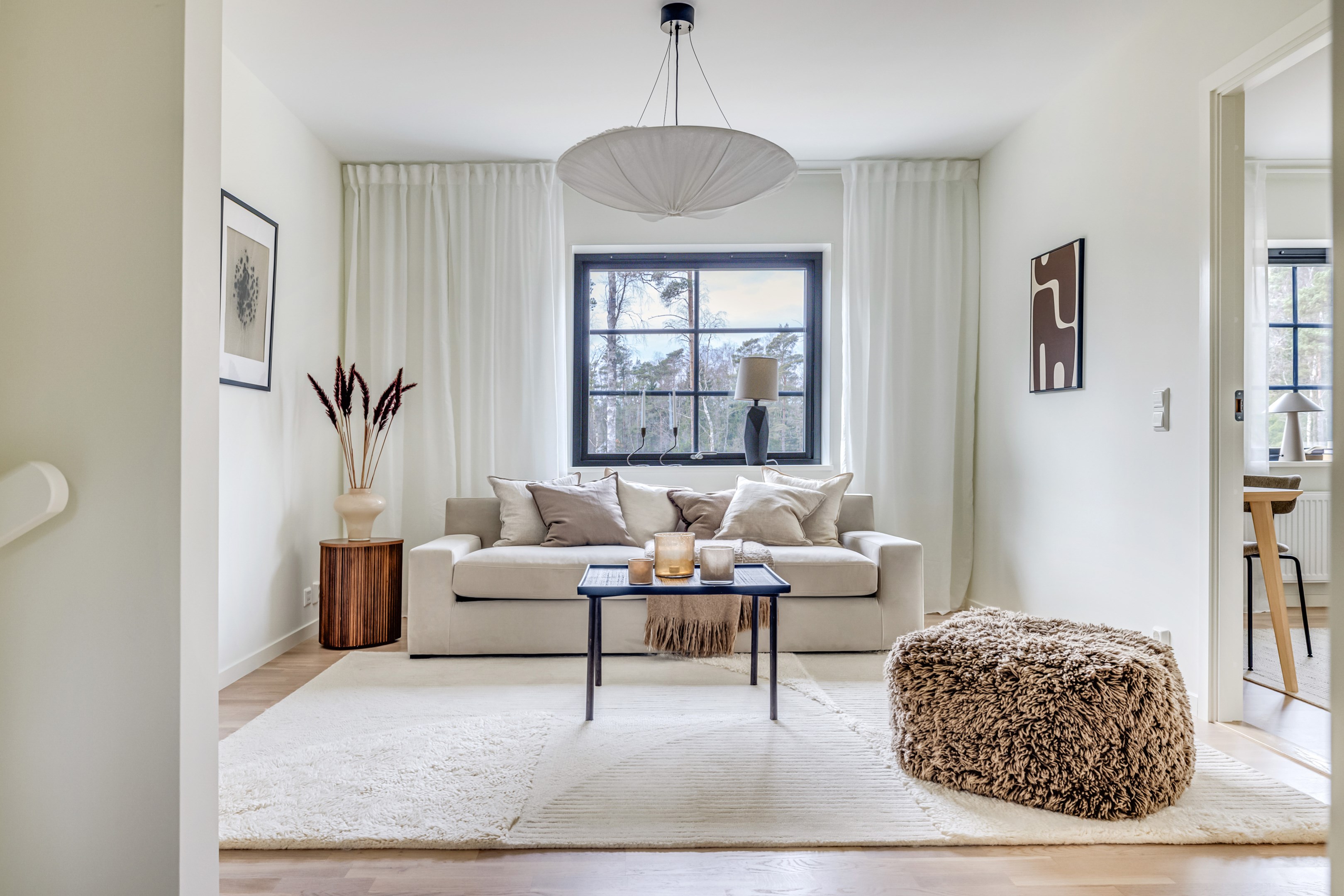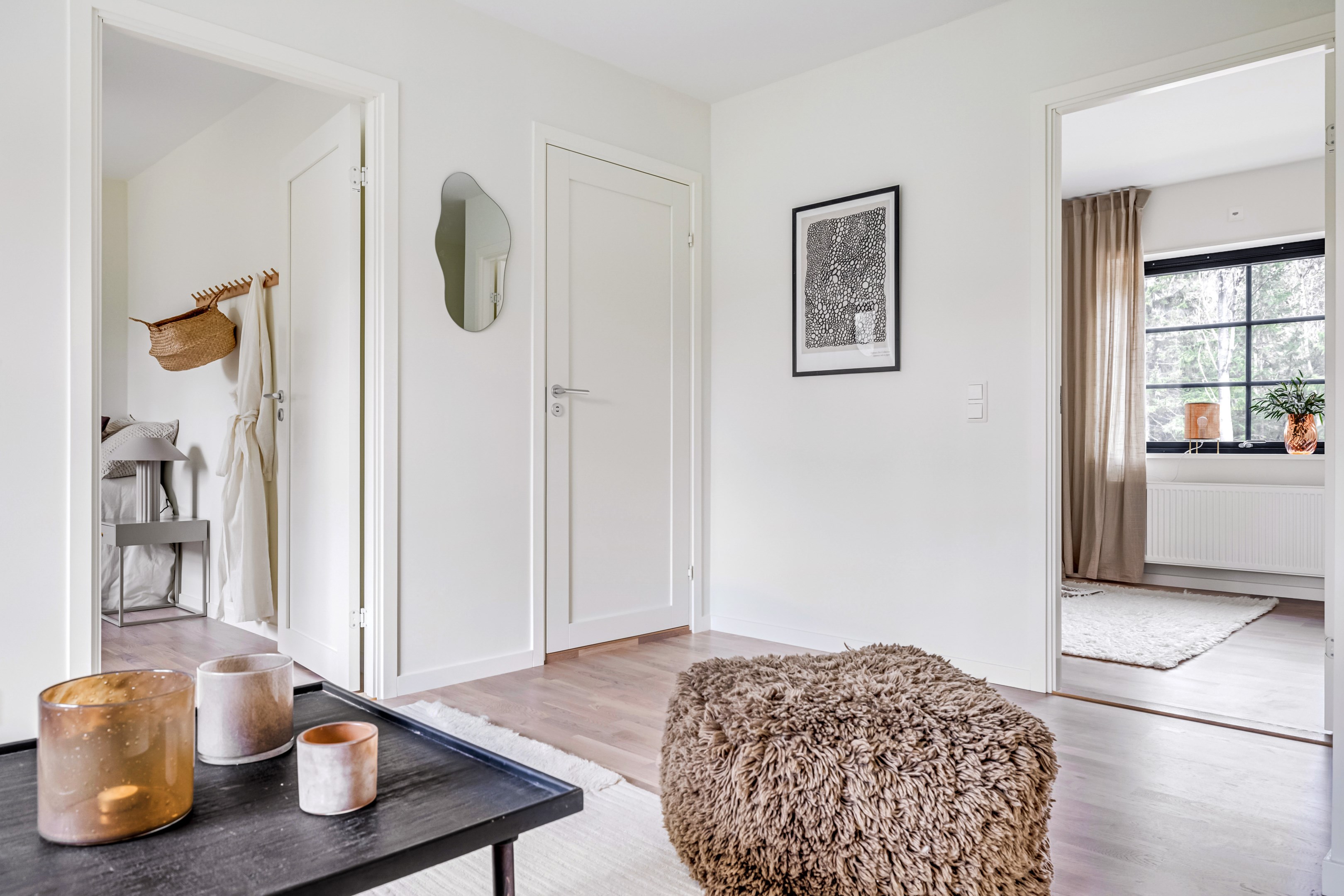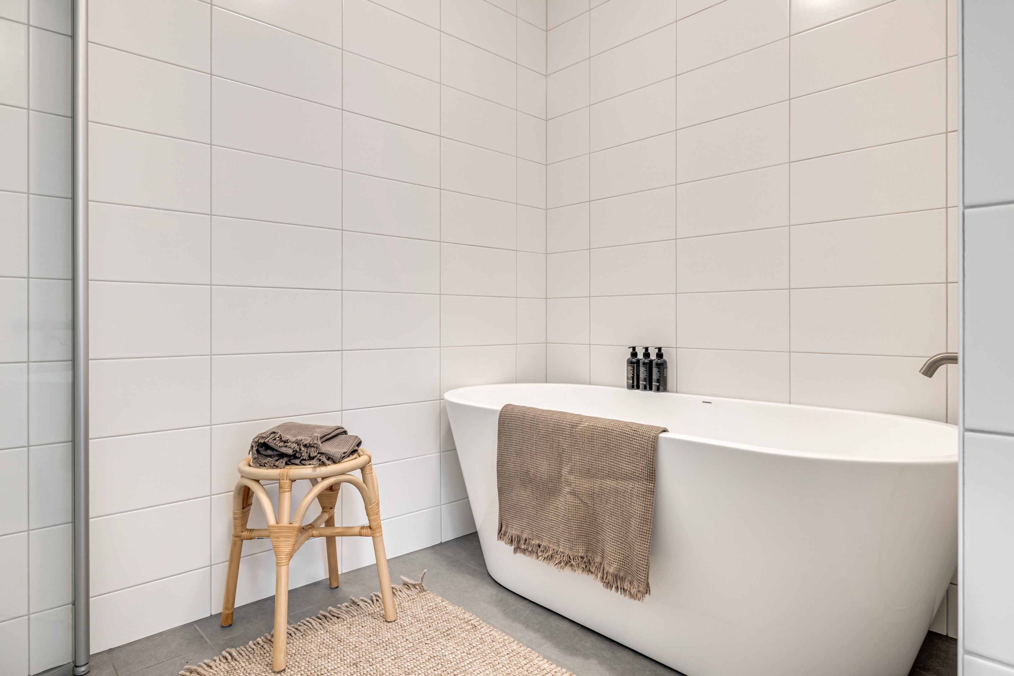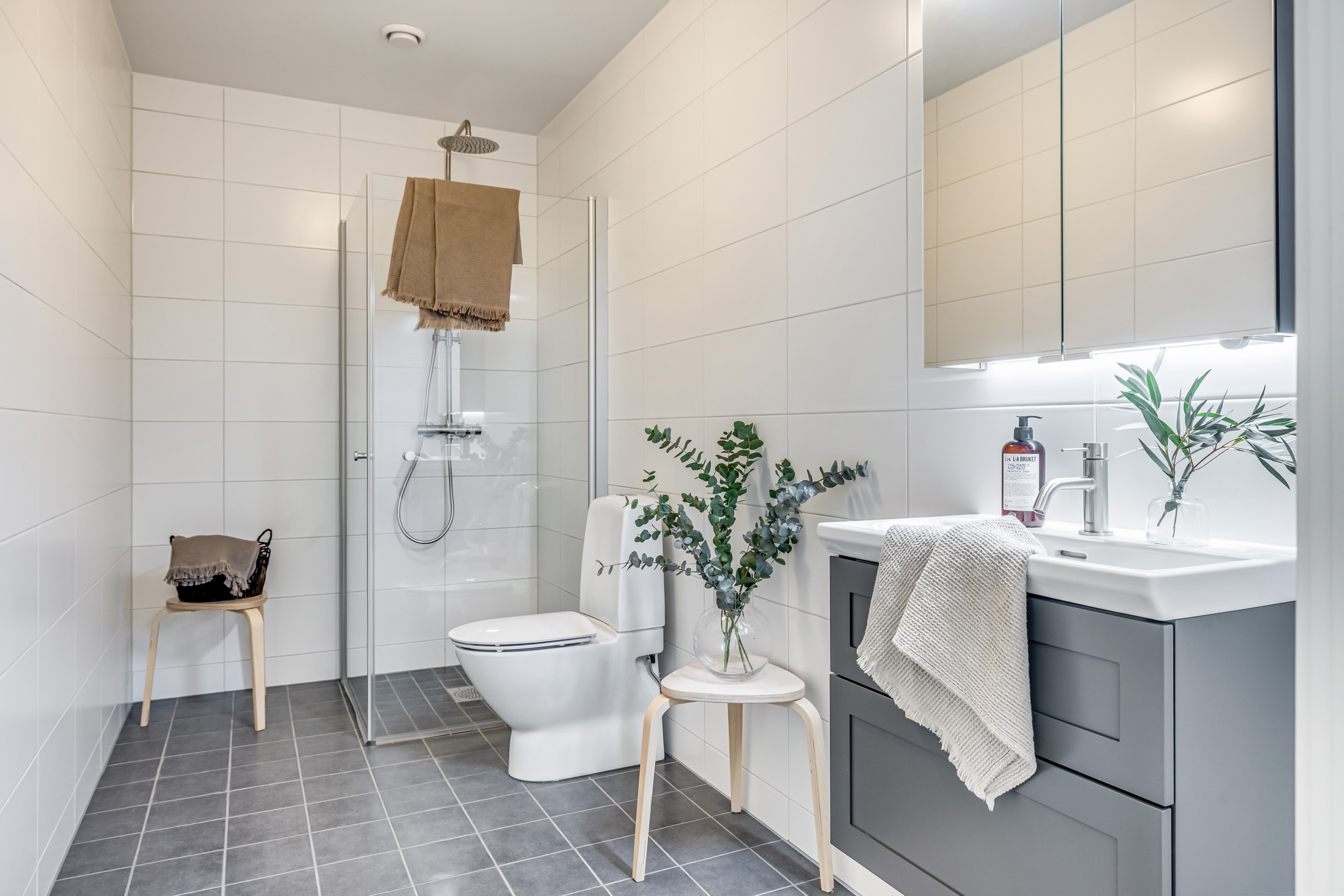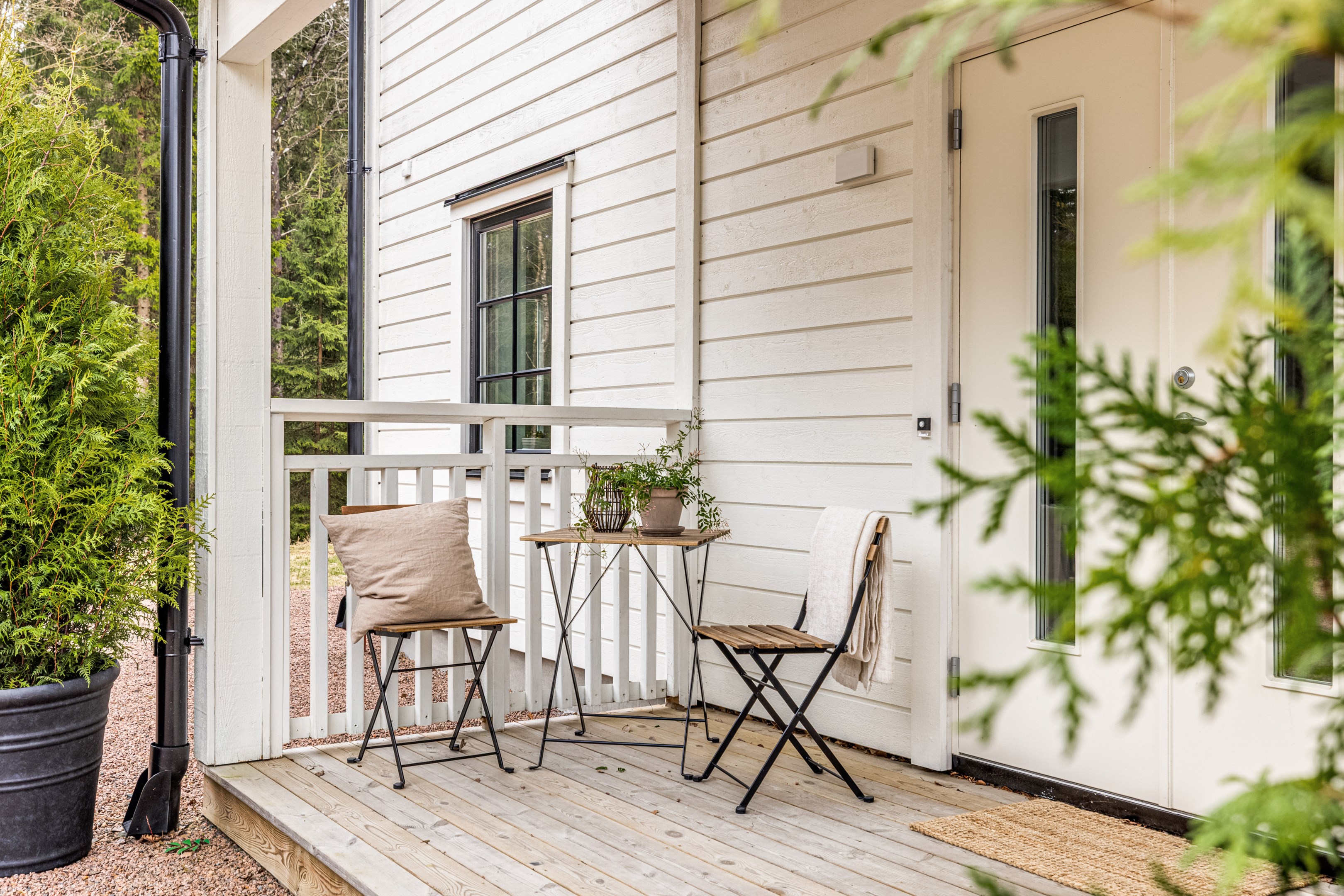 ENTRÉPLAN Du välkomnas in i detta väl tilltagna parhus via en veranda som har plats för en liten sittbänk eller cafégrupp. Skönt med entré under tak. I hallen finns plats för att hänga av dig ytterkläder och skor och bra ytor finns för att sätta in garderober. Hela entréplanet har vattenburen golvvärme. På alla golv i huset ligger en fin parkett i ek från Kährs, Abetone tjocklek 13 mm. Alla väggarna är genomgående målade i vitt för en ljus och enhetlig känsla. Entrén öppnar upp hemmet med en fri siktlinje genom huset och vidare ut mot uteplats och den grönskande skogen. Tvättstugan är rymlig och har både fönster och separat entré ut till trädgården. Förvaring finns i en tvättbänk med ho och arbetsytor på en grå bänkskiva i laminat ovanför tvättmaskin och torktumlare från energisnåla Siemens iQ300. Här står husets värmekälla, en frånluftsvärmepump Nibe F730 som har en färgdisplay med enkla menyer och tydligt symbolspråk som gör att du smidigt kan styra förbrukning och överblicka exempelvis drifttid, eller skapa egna, personliga inställningar. På golvet ligger en mörk klinker och väggarna är målad i vitt. Det helkaklade badrummet har inredning från Svedbergs. Duschväggar i klarglas Skoga Hörn Rak 90x90, handfat med kommod, Skuru spegelskåp med ledbelysning och wc-stol med dämpning i sitsen. Blandare och duschdel från Oras. I anslutning till hallen ligger ett rum att nyttja efter eget behov. Kontor, klädvård, gästrum eller kanske ett litet lekrum till barnen. Vidare in i huset ligger kök och vardagsrum i en öppen och lättmöblerad lösning. Köket som är i bra storlek erbjuder dig gott om förvaring i rikligt med skåp i fullhöjd och utdragbara lådor. Ovanför bänkskivan i laminat, Perito ljus, sitter ett vitt fasat kakel i halvförband. Trevligt med ett sidofönster ovanför kökshon vilket ger dig utsikt åt två håll. Köksblandare kommer från Oras. Den energisnåla maskinparken kommer från Siemens och är i rostfritt utförande. Vitvarorna består av en hel kyl och frys iQ500, induktionshäll IQ 100, varmluftsugn och mikro iQ700, köksfläkt och en helintegrerad diskmaskin. Intill det stora fönstret får matgruppen sin givna plats. Här finns gott om plats för att duka upp stort till festligare tillfällen. Vardagsrummet bjuder på ett härligt ljusinsläpp via stora fönsterpartier från golv till tak. Rummet upplevs rymligt och har gott om plats för både soffgrupp och tillhörande möblemang. Helglasade dubbeldörrar öppnar den generösa altanen som är som en egen liten privat oas sommartid. ÖVRE PLAN Under trapphuset som leder upp till övre plan finns bra förvaringsyta. På övre plan möts du av härliga rumsvolymer i en flexibel lösning. Allrummets öppna ytor ger ett fint ljusflöde till det övre planet. Ett härligt rum för samvaro, lek- spel och tv-tittande. Ljusinsläppet är påtagligt och utsikten är rogivande. Härifrån når du luckan till vinden som har plats för lite förvaring. Möjlighet finns att lägga golv på vinden för ytterligare förvaring. På vardera sida om allrummet ligger ett väl tilltaget sovrum. Båda rummen har plats för det mesta som önskas såsom säng, skrivbord, byråar och garderober. Det ena rummet har ljusinsläpp från två håll. Det största sovrummet har gott om plats för både dubbelsäng och garderober. Innanför ligger en stor klädkammare med fönster åt två håll. Rummet kan likaväl användas som kontor, sovrum eller kanske bebisrum. Det helkaklade badrummet har både dusch och badkar och inredning från Svedbergs. Duschväggar i klarglas Skoga Hörn Rak 90x90, handfat med kommod, Skuru spegelskåp med ledbelysning och wc-stol med dämpning i sitsen. Blandare och duschdel från Oras.