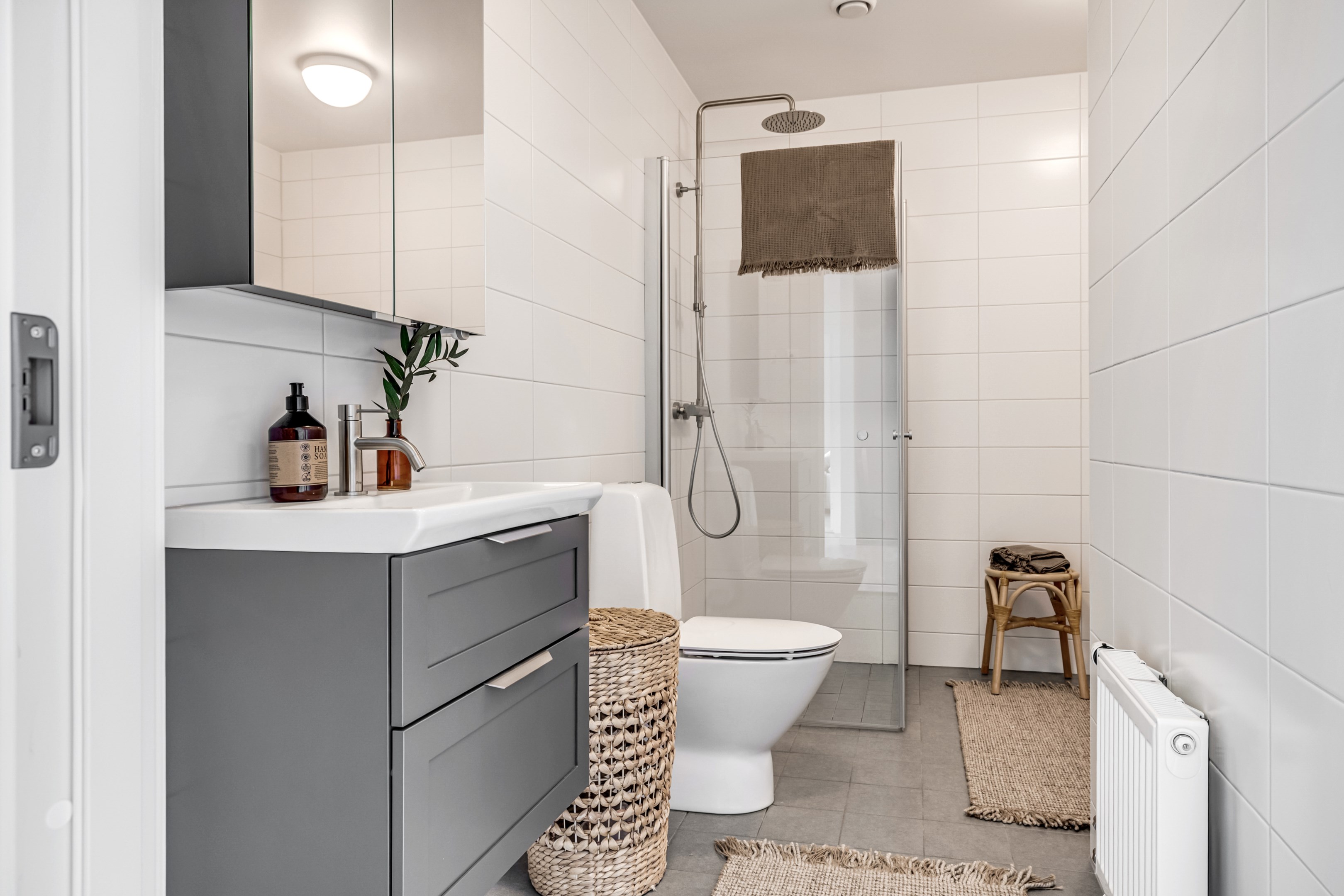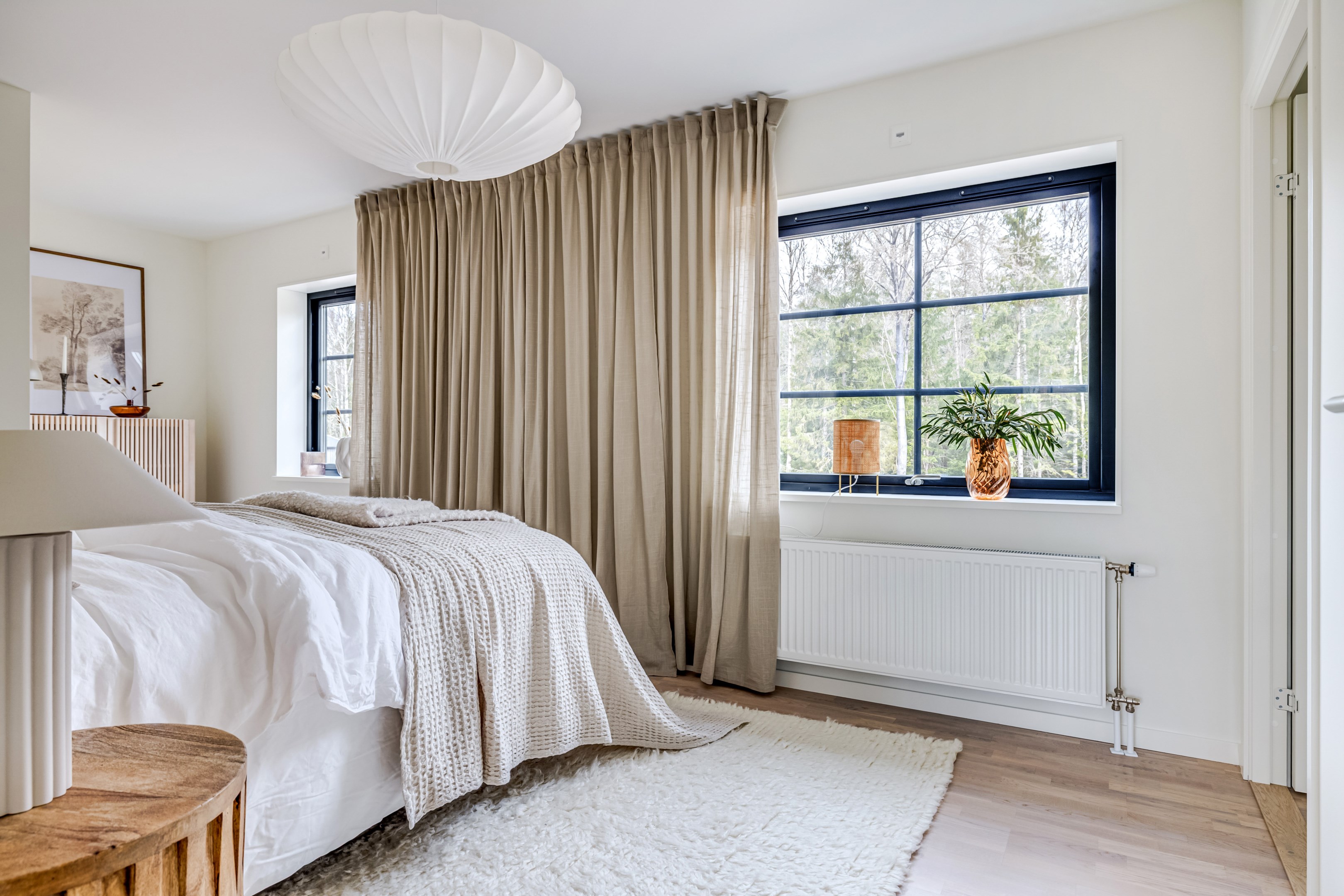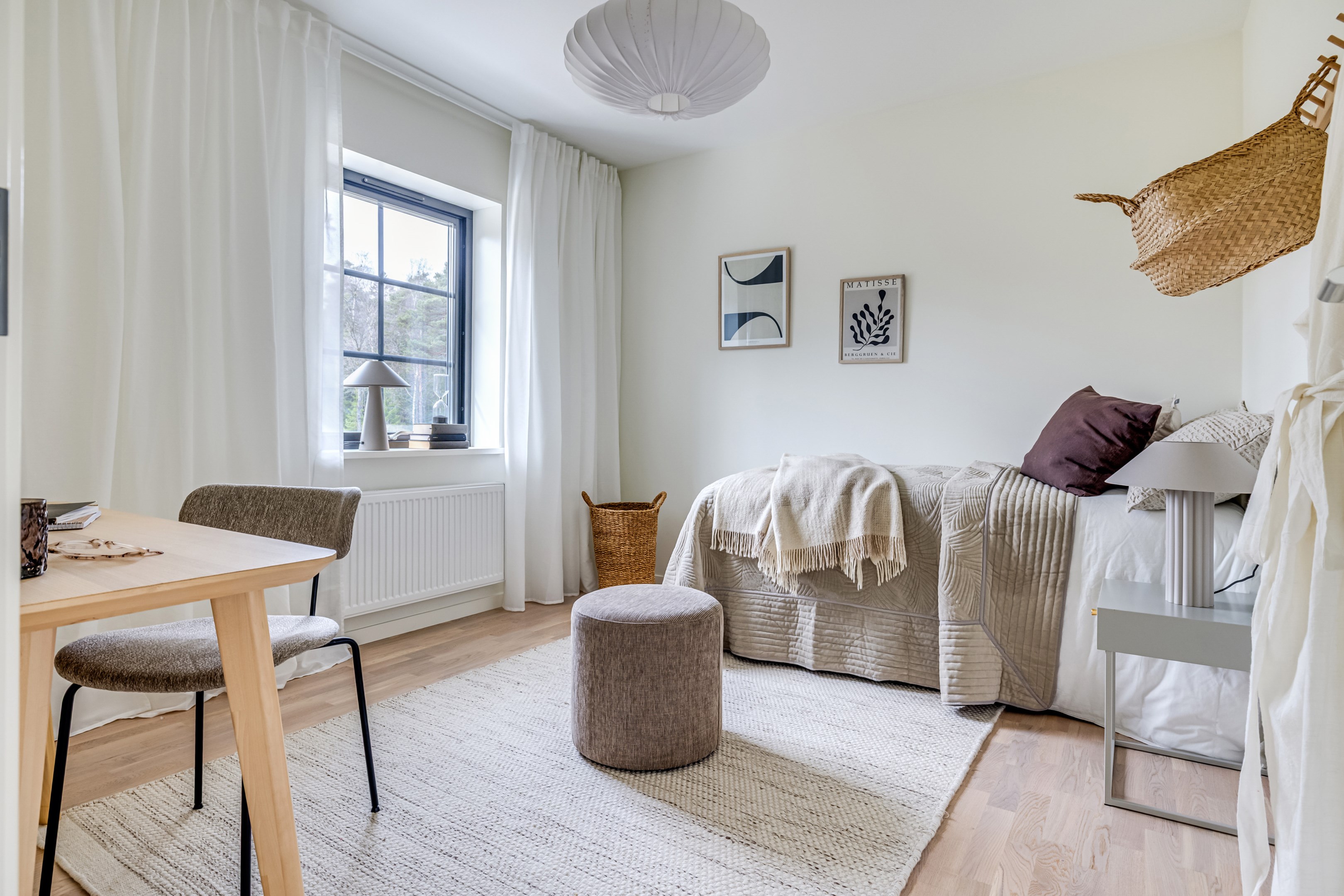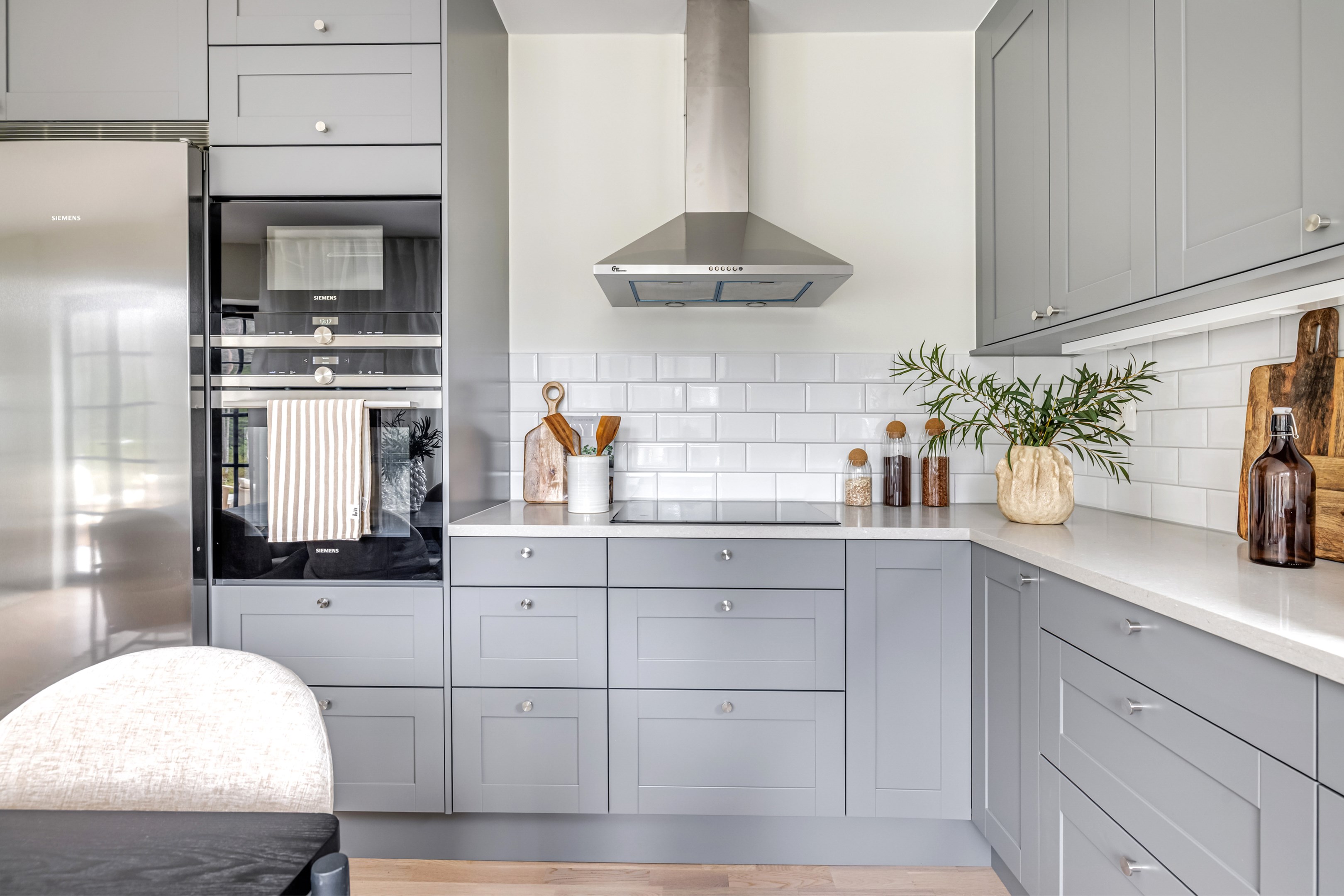 ENTRÉPLAN Du välkomnas in i detta väl tilltagna parhus via en veranda som har plats för en liten sittbänk eller cafégrupp. Skönt med entré under tak. I hallen finns plats för att hänga av dig ytterkläder och skor och bra ytor finns för att sätta in garderober. Hela entréplanet har vattenburen golvvärme. På alla golv i huset ligger en fin parkett i ek från Kährs, Abetone tjocklek 13 mm. Alla väggarna är genomgående målade i vitt för en ljus och enhetlig känsla. Entrén öppnar upp hemmet med en fri siktlinje genom huset och vidare ut mot uteplats och den grönskande skogen. Tvättstugan är rymlig och har både fönster och separat entré ut till trädgården. Förvaring finns i en tvättbänk med ho och arbetsytor på en grå bänkskiva i laminat ovanför tvättmaskin och torktumlare från energisnåla Siemens iQ300. Här står husets värmekälla, en frånluftsvärmepump Nibe F730 som har en färgdisplay med enkla menyer och tydligt symbolspråk som gör att du smidigt kan styra förbrukning och överblicka exempelvis drifttid, eller skapa egna, personliga inställningar. På golvet ligger en mörk klinker och väggarna är målad i vitt. Det helkaklade badrummet har inredning från Svedbergs. Duschväggar i klarglas Skoga Hörn Rak 90x90, handfat med kommod, Skuru spegelskåp med ledbelysning och wc-stol med dämpning i sitsen. Blandare och duschdel från Oras. I anslutning till hallen ligger ett rum att nyttja efter eget behov. Kontor, klädvård, gästrum eller kanske ett litet lekrum till barnen. Vidare in i huset ligger kök och vardagsrum i en öppen och lättmöblerad lösning. Köket som är i bra storlek erbjuder dig gott om förvaring i rikligt med skåp i fullhöjd och utdragbara lådor. Ovanför bänkskivan i laminat, Perito ljus, sitter ett vitt fasat kakel i halvförband. Trevligt med ett sidofönster ovanför kökshon vilket ger dig utsikt åt två håll. Köksblandare kommer från Oras. Den energisnåla maskinparken kommer från Siemens och är i rostfritt utförande. Vitvarorna består av en hel kyl och frys iQ500, induktionshäll IQ 100, varmluftsugn och mikro iQ700, köksfläkt och en helintegrerad diskmaskin. Intill det stora fönstret får matgruppen sin givna plats. Här finns gott om plats för att duka upp stort till festligare tillfällen. Vardagsrummet bjuder på ett härligt ljusinsläpp via stora fönsterpartier från golv till tak. Rummet upplevs rymligt och har gott om plats för både soffgrupp och tillhörande möblemang. Helglasade dubbeldörrar öppnar den generösa altanen som är som en egen liten privat oas sommartid. ÖVRE PLAN Under trapphuset som leder upp till övre plan finns bra förvaringsyta. På övre plan möts du av härliga rumsvolymer i en flexibel lösning. Allrummets öppna ytor ger ett fint ljusflöde till det övre planet. Ett härligt rum för samvaro, lek- spel och tv-tittande. Ljusinsläppet är påtagligt och utsikten är rogivande. Härifrån når du luckan till vinden som har plats för lite förvaring. Möjlighet finns att lägga golv på vinden för ytterligare förvaring. På vardera sida om allrummet ligger ett väl tilltaget sovrum. Båda rummen har plats för det mesta som önskas såsom säng, skrivbord, byråar och garderober. Det ena rummet har ljusinsläpp från två håll. Det största sovrummet har gott om plats för både dubbelsäng och garderober. Innanför ligger en stor klädkammare med fönster åt två håll. Rummet kan likaväl användas som kontor, sovrum eller kanske bebisrum. Det helkaklade badrummet har både dusch och badkar och inredning från Svedbergs. Duschväggar i klarglas Skoga Hörn Rak 90x90, handfat med kommod, Skuru spegelskåp med ledbelysning och wc-stol med dämpning i sitsen. Blandare och duschdel från Oras.