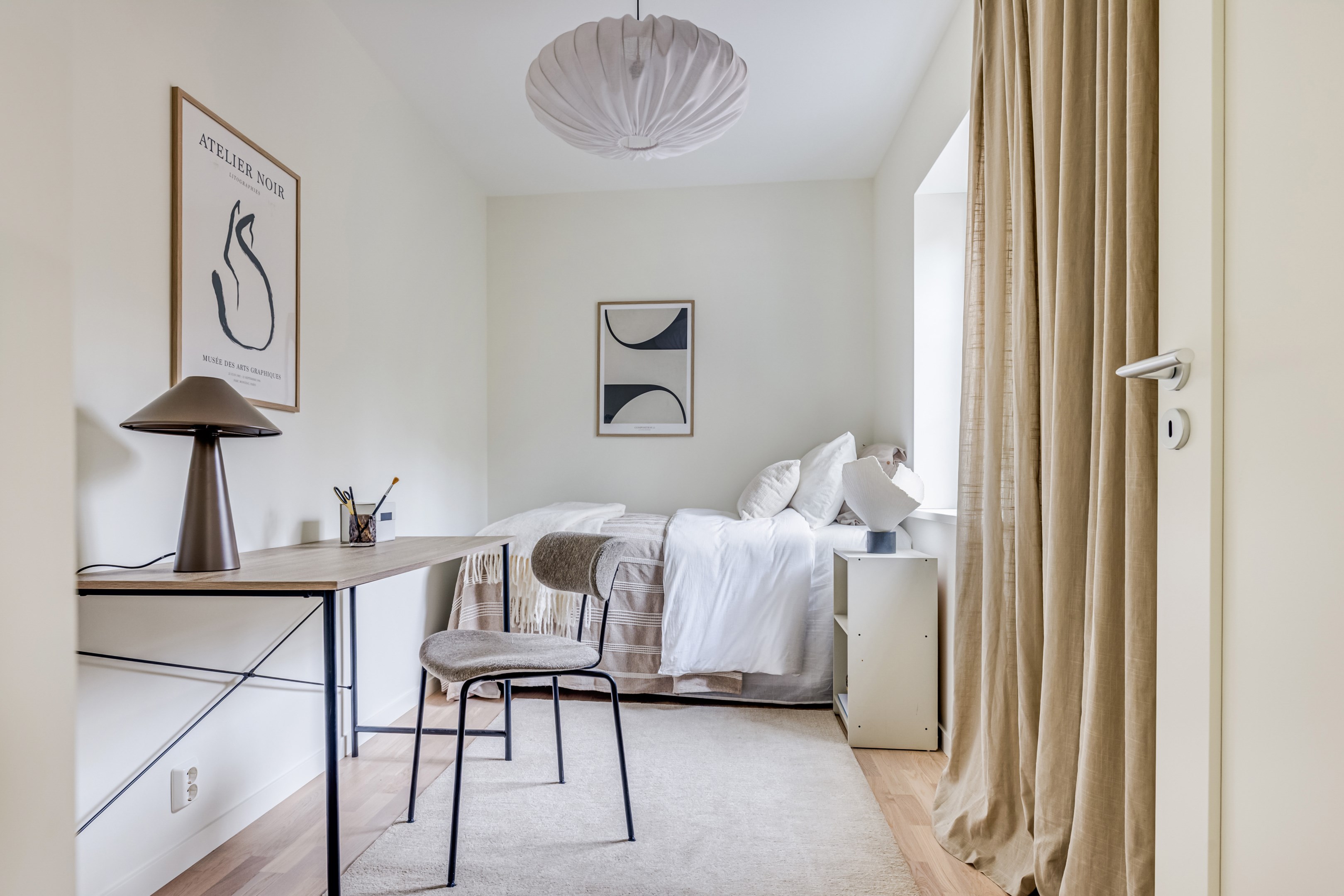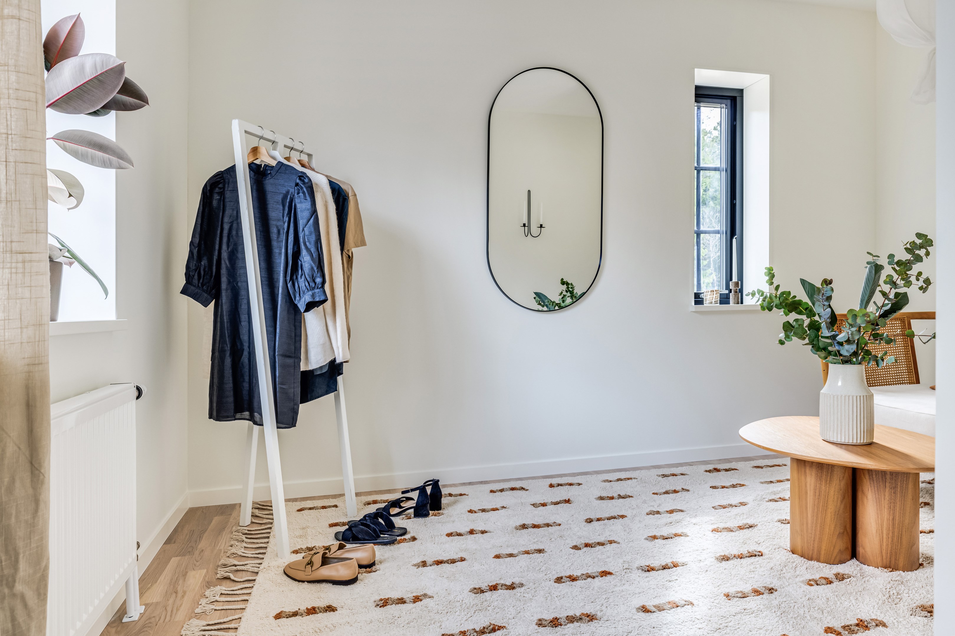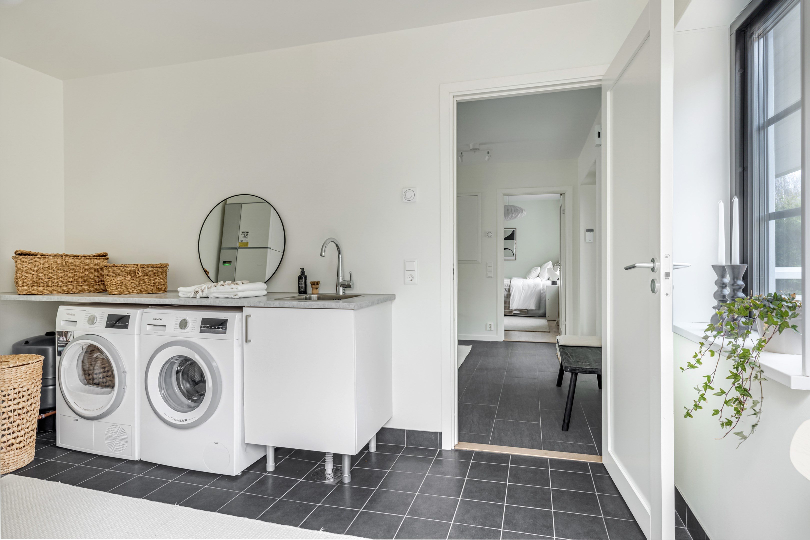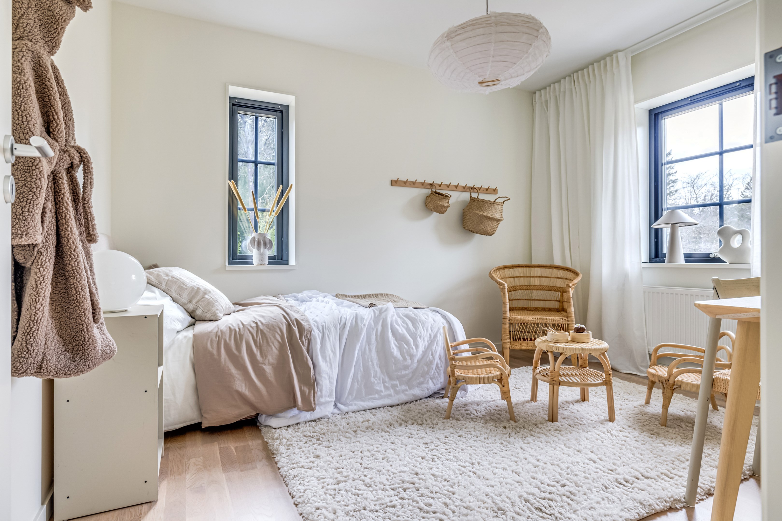 ENTRÉPLAN Du välkomnas in i detta väl tilltagna parhus via en veranda som har plats för en liten sittbänk eller cafégrupp. Skönt med entré under tak. I hallen finns plats för att hänga av dig ytterkläder och skor och bra ytor finns för att sätta in garderober. Hela entréplanet har vattenburen golvvärme. På alla golv i huset ligger en fin parkett i ek från Kährs, Abetone tjocklek 13 mm. Alla väggarna är genomgående målade i vitt för en ljus och enhetlig känsla. Entrén öppnar upp hemmet med en fri siktlinje genom huset och vidare ut mot uteplats och den grönskande skogen. Tvättstugan är rymlig och har både fönster och separat entré ut till trädgården. Förvaring finns i en tvättbänk med ho och arbetsytor på en grå bänkskiva i laminat ovanför tvättmaskin och torktumlare från energisnåla Siemens iQ300. Här står husets värmekälla, en frånluftsvärmepump Nibe F730 som har en färgdisplay med enkla menyer och tydligt symbolspråk som gör att du smidigt kan styra förbrukning och överblicka exempelvis drifttid, eller skapa egna, personliga inställningar. På golvet ligger en mörk klinker och väggarna är målad i vitt. Det helkaklade badrummet har inredning från Svedbergs. Duschväggar i klarglas Skoga Hörn Rak 90x90, handfat med kommod, Skuru spegelskåp med ledbelysning och wc-stol med dämpning i sitsen. Blandare och duschdel från Oras. I anslutning till hallen ligger ett rum att nyttja efter eget behov. Kontor, klädvård, gästrum eller kanske ett litet lekrum till barnen. Vidare in i huset ligger kök och vardagsrum i en öppen och lättmöblerad lösning. Köket som är i bra storlek erbjuder dig gott om förvaring i rikligt med skåp i fullhöjd och utdragbara lådor. Ovanför bänkskivan i laminat, Perito ljus, sitter ett vitt fasat kakel i halvförband. Trevligt med ett sidofönster ovanför kökshon vilket ger dig utsikt åt två håll. Köksblandare kommer från Oras. Den energisnåla maskinparken kommer från Siemens och är i rostfritt utförande. Vitvarorna består av en hel kyl och frys iQ500, induktionshäll IQ 100, varmluftsugn och mikro iQ700, köksfläkt och en helintegrerad diskmaskin. Intill det stora fönstret får matgruppen sin givna plats. Här finns gott om plats för att duka upp stort till festligare tillfällen. Vardagsrummet bjuder på ett härligt ljusinsläpp via stora fönsterpartier från golv till tak. Rummet upplevs rymligt och har gott om plats för både soffgrupp och tillhörande möblemang. Helglasade dubbeldörrar öppnar den generösa altanen som är som en egen liten privat oas sommartid. ÖVRE PLAN Under trapphuset som leder upp till övre plan finns bra förvaringsyta. På övre plan möts du av härliga rumsvolymer i en flexibel lösning. Allrummets öppna ytor ger ett fint ljusflöde till det övre planet. Ett härligt rum för samvaro, lek- spel och tv-tittande. Ljusinsläppet är påtagligt och utsikten är rogivande. Härifrån når du luckan till vinden som har plats för lite förvaring. Möjlighet finns att lägga golv på vinden för ytterligare förvaring. På vardera sida om allrummet ligger ett väl tilltaget sovrum. Båda rummen har plats för det mesta som önskas såsom säng, skrivbord, byråar och garderober. Det ena rummet har ljusinsläpp från två håll. Det största sovrummet har gott om plats för både dubbelsäng och garderober. Innanför ligger en stor klädkammare med fönster åt två håll. Rummet kan likaväl användas som kontor, sovrum eller kanske bebisrum. Det helkaklade badrummet har både dusch och badkar och inredning från Svedbergs. Duschväggar i klarglas Skoga Hörn Rak 90x90, handfat med kommod, Skuru spegelskåp med ledbelysning och wc-stol med dämpning i sitsen. Blandare och duschdel från Oras.