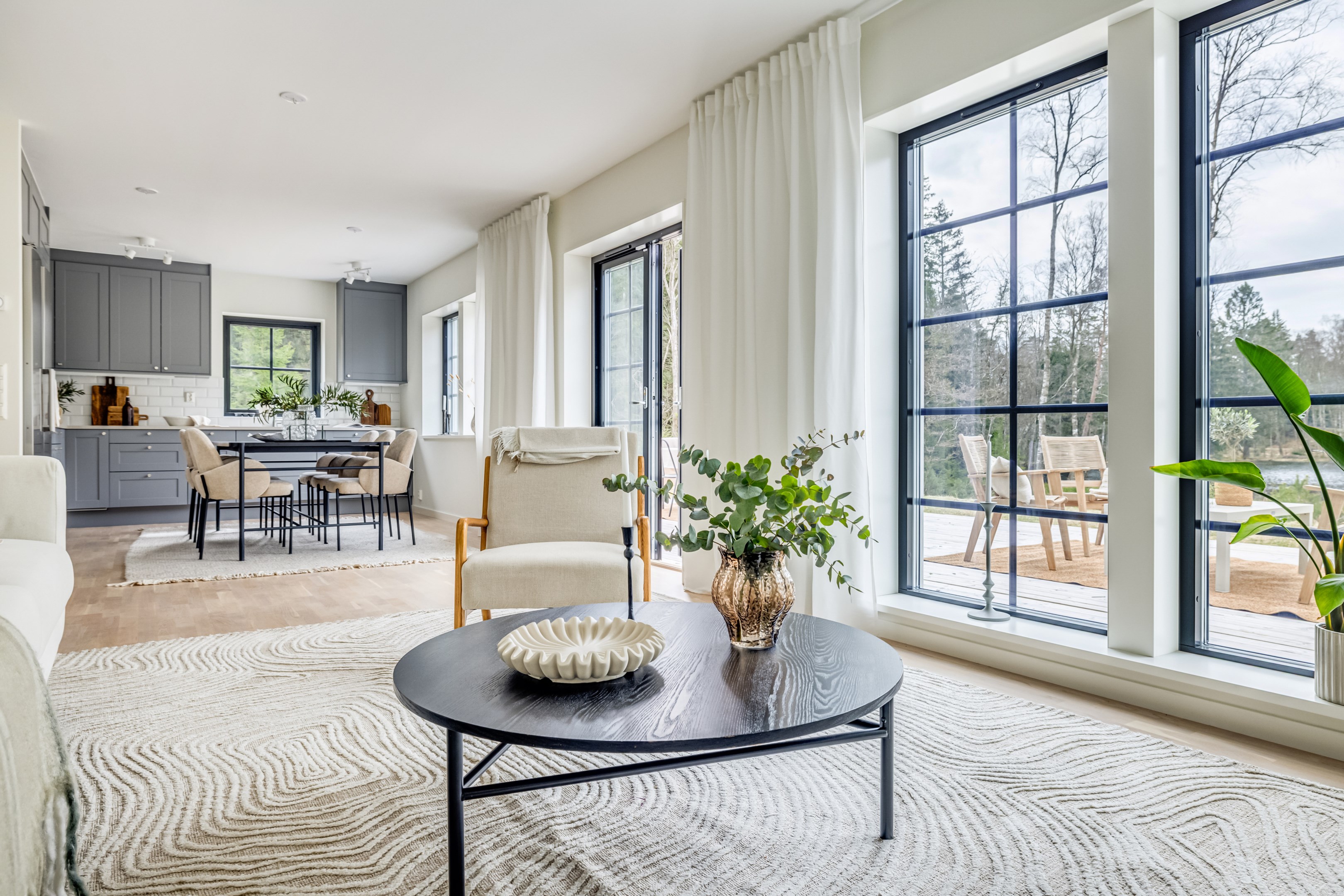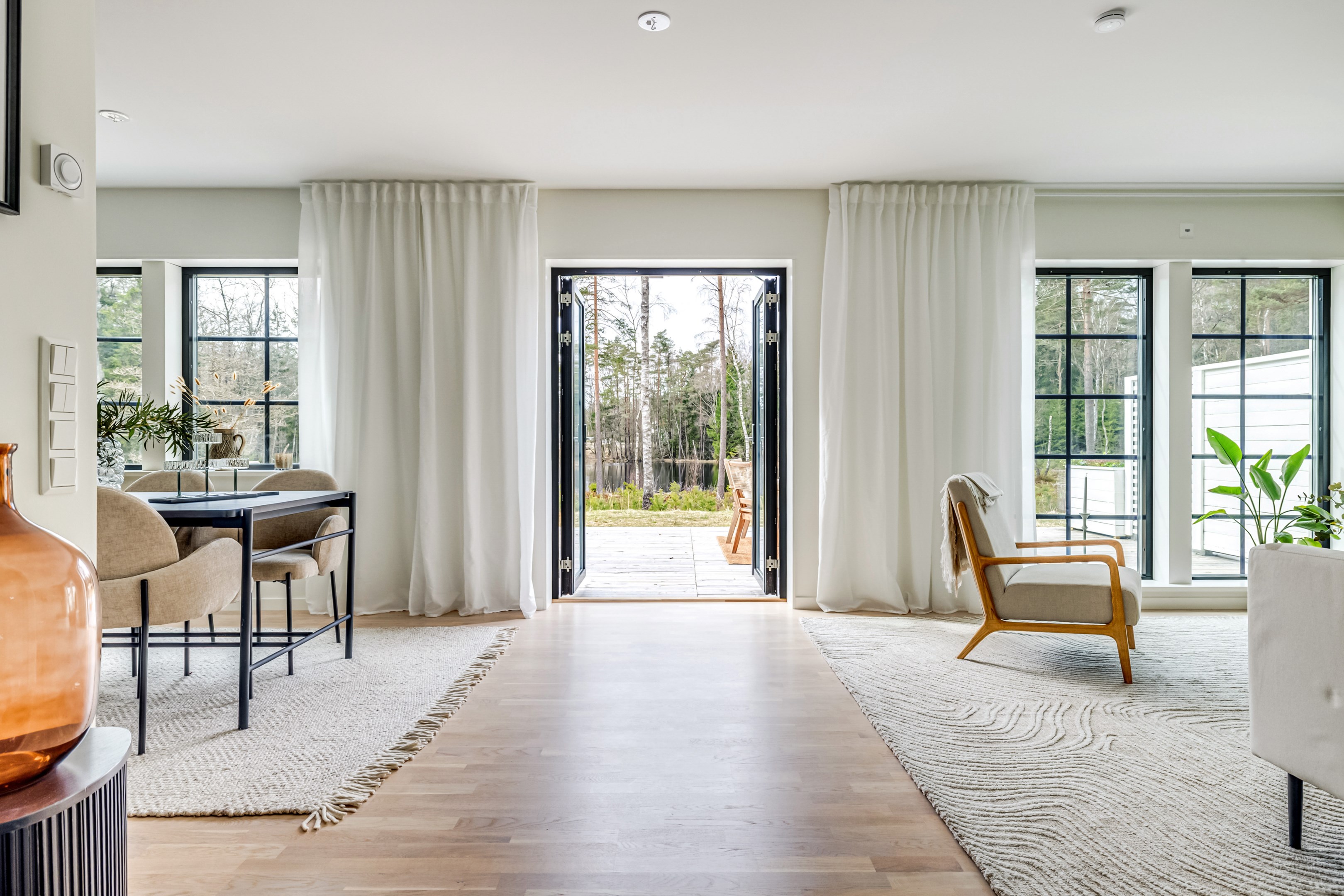 NYPRODUCERAT PARHUS FRÅN A-HUS MED HÖG STANDARD, MINIMALA DRIFTSKOSTNADER OCH UTSIKT ÖVER GLITTRANDE VATTEN Välkommen till ett stilrent parhus, där kvalitet, komfort och genomtänkt design möts i perfekt harmoni. Här erbjuds ett hem med generösa rumsvolymer, ett fantastiskt ljusflöde och en flexibel planlösning med upp till fem sovrum – eller kontor och 3 sovrum kombinerat med en lyxigt stor walk-in closet för dig som värdesätter extra förvaring och hotellkänsla i vardagen. Bostaden präglas av påkostade och enhetliga materialval. Vackra parkettgolv från Kährs löper genom hela huset och samspelar elegant med det moderna köket från Marbodal i stilfull grafitgrå kulör. Här finns en välutrustad maskinpark från Siemens som gör vardagen både smidig och bekväm. De öppna och lättmöblerade ytorna mellan kök och vardagsrum skapar en naturlig samlingsplats för familj och vänner. Förberett för kamin. De svarta kvalitetsfönstren från Traryd förstärker det moderna uttrycket och ramar in utsikten på ett smakfullt sätt. På entréplanet bidrar vattenburen golvvärme till en behaglig inomhuskomfort året om. På övre plan möts du av ett stort och inbjudande allrum med härligt ljusinsläpp, en perfekt plats för avkoppling eller familjens gemensamma stunder. Här finns även bostadens större sovrum samlade, vilket skapar en privat och lugn sovdel. Bostaden erbjuder två stilrena, helkaklade badrum samt en rymlig och praktisk tvättstuga med separat entré – en funktionell lösning som underlättar vardagen, särskilt för barnfamiljen eller den aktiva. Via helglasade dubbeldörrar öppnar du upp mot en stor altan i skyddat läge, där du kan njuta av solen större delen av dagen och en rogivande utsikt över Djurtjärn. Här skapas en perfekt plats för både avkoppling och sociala stunder i en lugn och naturskön miljö. Huset har inte bara minimalt med underhåll i många år, det är också energieffektivt och ekonomiskt och fick inte en enda anmärkning på besiktningen. Med energiklass B, ett effektivt värmesystem och ett modernt minireningsverk utan kemikalier hålls driftkostnaderna på en mycket låg nivå, vilket ger ett hållbart boende både för plånboken och miljön. Läget är optimalt för dig som vill kombinera natur och närhet till service. Här bor du i ett stillsamt område med naturen runt knuten, samtidigt som busshållplats finns några 100m från huset och med bil tar du dig till centrala Mölnlycke på cirka 9 minuter. I närområdet finns många fina badsjöar såsom Rådasjön, Stensjön och populära Finnsjön med fina motionsspår och otrolig natur. Även Bråtaskogens naturreservat erbjuder mäktiga naturupplevelser. Gunnebo slott, Wendelsberg och Råda säteri är populära utflyktsmål. Mölnlycke centrums växande utbud erbjuder matvaruaffärer, torghandel, restauranger, caféer, stenungsbageri, systembolag och flera mysiga små inredningsbutiker. För den aktive ligger padelanläggning, tennisbanor, gymkedjan SATS och golfbana i Öjersjö på bekvämt avstånd. Även den anrika innebandyföreningen Pixbo håller till i Mölnlycke. Mycket bra bussförbindelser både till Göteborg och Mölndal.