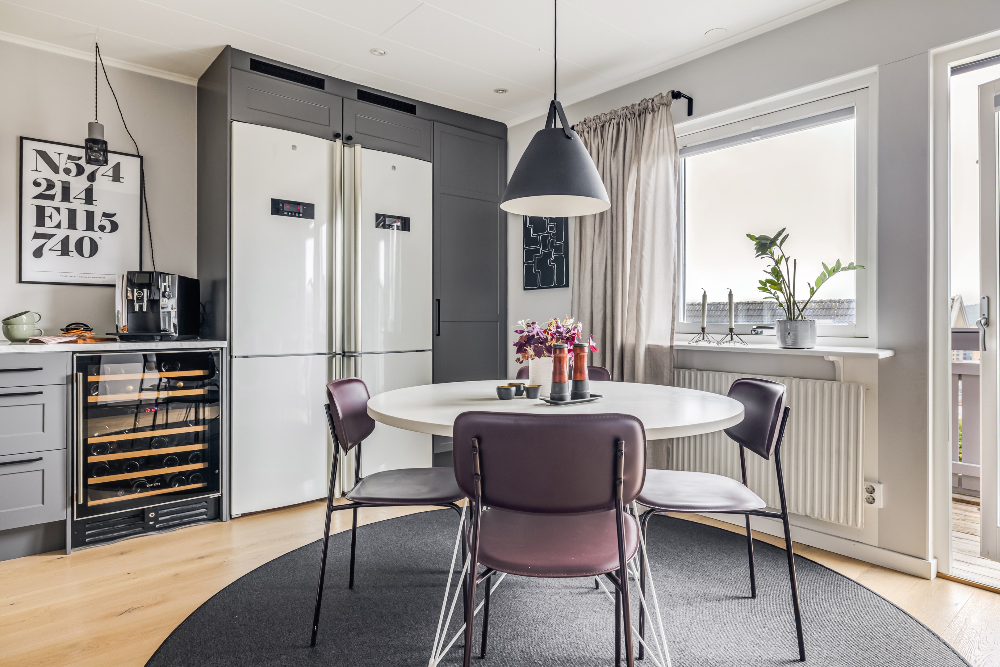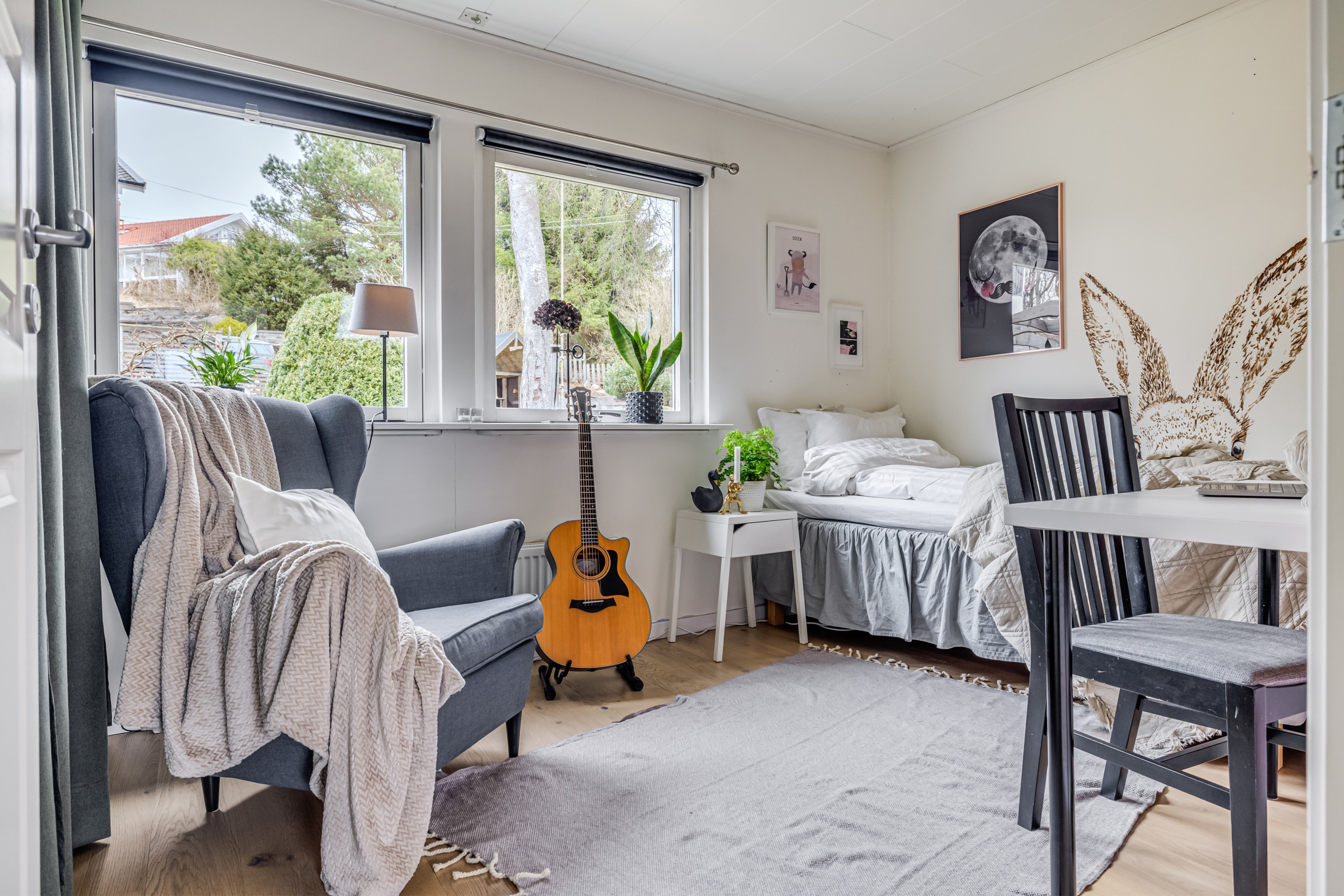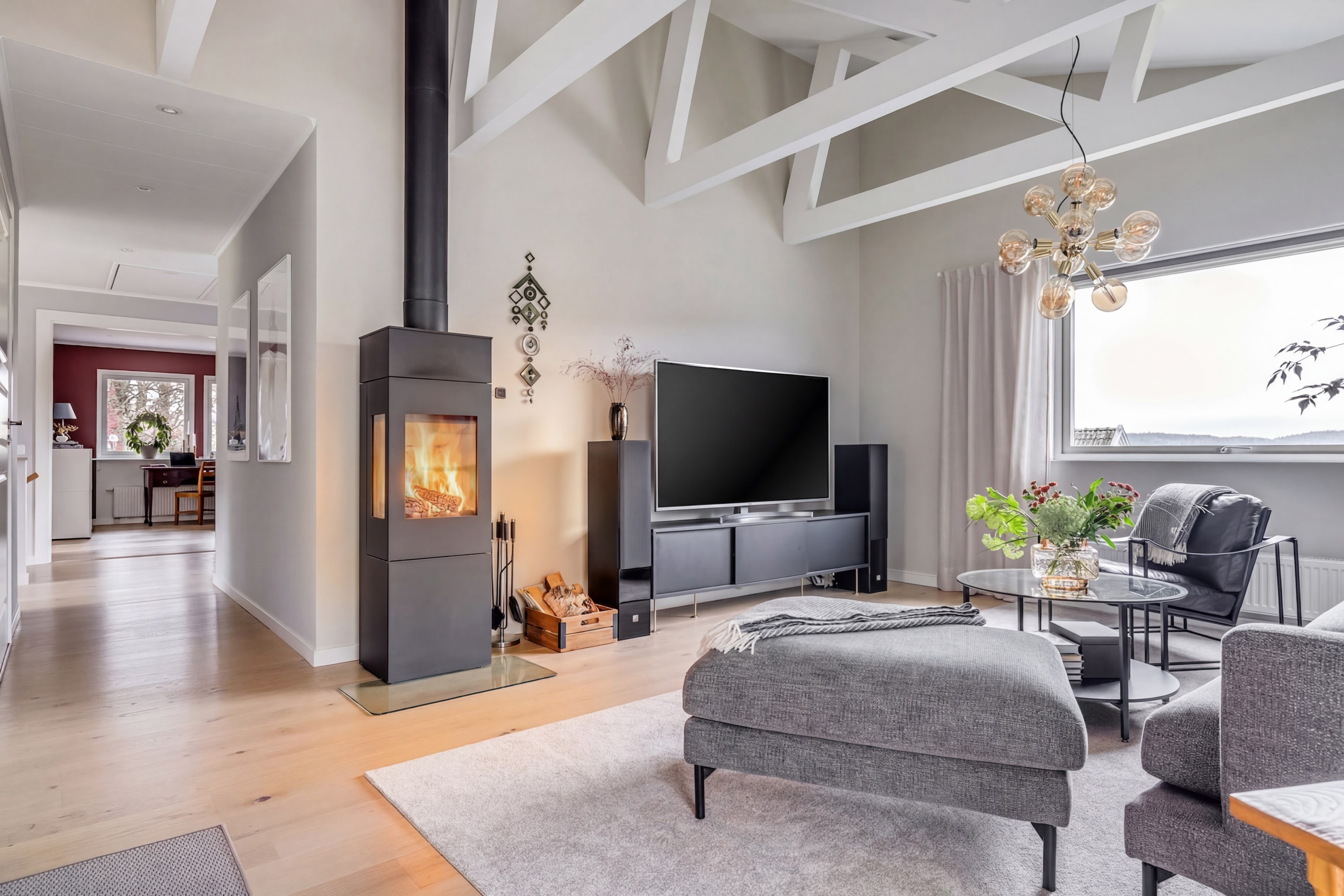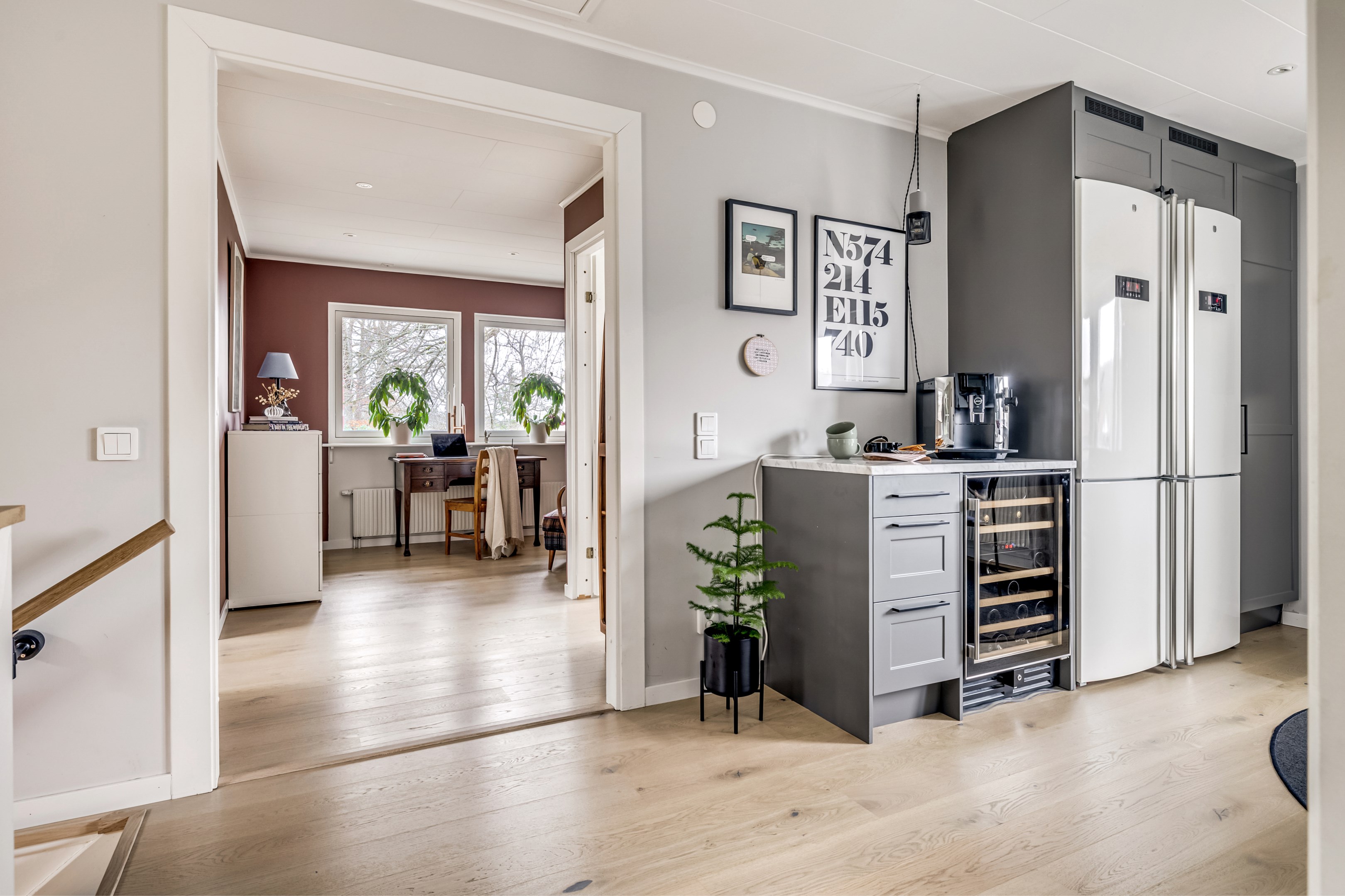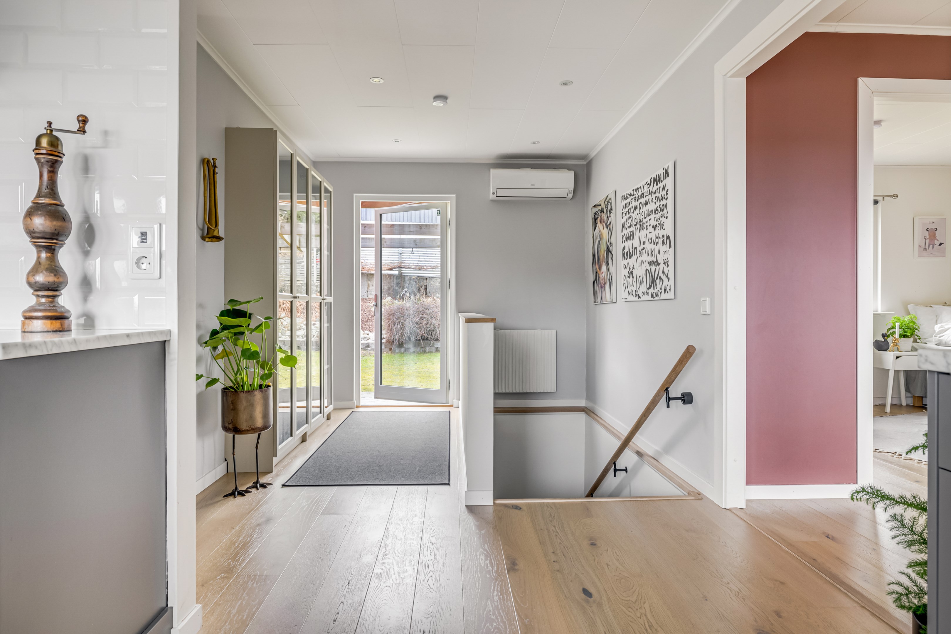 ENTRÉPLAN Praktiskt med entré under tak. När du kliver in via farstun möts du av en rymlig och välkomnande hall. Entrédörren har Yale Doorman lås och på vardera sida om dörren sitter ett högsmalt fönster som släpper in ljus. Rikligt med förvaring finns i en generös garderobslösning med skjutdörrar. Möjlighet finns att sätta in en dörr ut mot garagedelen. Gott om plats för ytterkläder och skor finns längs med ena väggen. Den väggen är målad i en ljusgrå nyans och övriga väggar är målade i vitt. Från hallen fortsätter parkettgolvet i ek vidare in i sovrum och klädkammare. Sovrummet är väl tilltaget och har en klädkammare. Ett rogivande rum som vetter mot den lugna återvändsgatan. Plats finns för garderober och byråar. Väggarna är målade i en mörk, grön nyans Jotun Balans. I klädkammaren finns mycket bra förvaring och en garderob. Här är väggarna målade i vitt. Vidare in i hallen ligger ett flexibelt allrum som av ägarna används som kombinerat gästrum, kontor och musikstudio. Rummet kan likväl användas som ett mysigt sällskapsrum, gym och som en lyxigt stor förvaringsyta. På det isolerade betonggolvet ligger en heltäckningsmatta. Väggarna är målade i vitt och utanpåliggandes spotlights i taket lyser upp med ett stämningsfullt sken. Denna ytan var tidigare en del av garaget och ett förråd. Önskar du större garage kan du ta bort väggen ut mot garagedelen igen. I anslutning till hallen ligger ett helkaklat duschrum. Väggarna pryds av ett vitt kakel och på golvet ligger en mörk klinker. Här finns handfat med kommod, spegel och wc. Under 2021 sattes ett högskåp in och duschväggarna byttes ut mot nya. Vägg i vägg har du en rymlig tvättstuga med tätskikt i original utförande. Här finns mycket bra arbetsytor och gott om plats för ytterligare klädvård. Ovan tvättmaskin från 2019 och torktumlare från 2022 finns en bänkskiva i laminat. Under 2021 målades golvet om, garderober sattes in, bänkskivan byttes ut och nya skåp sattes upp. Väggarna är målade i vitt och betonggolvet är målat i en grå nyans. Innanför tvättstugan ligger pannrummet och här står husets bergvärmeanläggning. Här finns smarta förvaringslösningar och gott om plats för att förvara ytterkläder och skor. ÖVRE PLAN På det övre planet möts du direkt av det fina ljusinsläppet och det trendiga köket. De genomtänkta fönsterplaceringarna på detta plan ger dig direkt ovanför trappan ett unikt ljusflöde från fyra väderstreck. På alla golv ligger en enstavs parkett i ek, Tarkett Prestige, som är laserad i en ljusare nyans. I hallen och köket är väggarna målade i en behaglig grå nyans, Jotun Morgondis. Från hallen når du via en helglasad balkongdörr uteplatser och trädgård. Köket som är signerat Woodrich är en svensk kökstillverkare som specialiserar sig på måttanpassade kökslösningar och utbytesluckor med fokus på att kombinera personlig design med hantverksmässig kvalitet. Köket har skåp i fullhöjd och luckor i en snygg antracitgrå nyans. Här finns generöst med förvaring. Ett belyst vitrinskåp blir en trevlig detalj. Vitvarorna består av induktionshäll, fläktkåpa i rostfritt, varmluftsugn och mikro från 2016. Kyl och frys är från 2015 och diskmaskin från 2014. En extra front i samma färg som köket finns om man vill sätta in en integrerad diskmaskin. Vid kyl och frys finns en smart placerad avställningsbänk. Här finns även en vinkyl. Ovanför påkostade bänkskivor i vit Carraramarmor sitter ett vitt fasat kakel i halvförband som vid fläkten går hela vägen upp till taket. Infällda spotlights i taket lyser upp med ett fint sken. Matplatsen fullkomligt badar i ljus. Från köket har du fantastiskt utsikt och via en helglasad balkongdörr når du den soldränkta balkongen. En flexibel sällskapsyta finns i anslutning till kök och hall. Har i dagsläget används som kontor men lämpar sig lika väl till ett litet tv-rum till barnen. Väggarna är målade i en en dov röd nyans, Jotun Sophisticated Red. På vardera sida om rummet ligger två sovrum. Det största rummet har en generös garderobslösning bakom ett draperi längs med hela ena väggen. Väggarna är målade i vitt. Det andra rummet ligger i vinkel och rymmer det mesta som behövs såsom säng, skrivbord och byrå. Detta rummet har en målad fond och övriga väggar är målade i vitt. Det eleganta badrummet erbjuder en harmonisk kombination av stil och komfort där varje detalj är noggrant genomtänkt. Här möts du av en påkostad interiör med rena linjer och materialval av högsta kvalitet som skapar en tidlös och lyxig känsla. Bakom stora glasdörrar väntar generösa dubbelduschar. De infällda nischerna ger praktisk förvaring. Den rejäla kommoden med dubbla handfat erbjuder gott om utrymme och bekvämlighet. Ovanför löper en stor spegel längs väggen som förstärker rymden och reflekterar ljuset på ett vackert sätt. Ett fönster släpper in naturligt dagsljus medan infällda spotlights i taket ger en behaglig och stämningsfull belysning under dygnets alla timmar. Den behagliga elgolvvärmen gör varje steg varmt och komfortabelt. Både vägghängd toalett och komod gör det enkelt att städa. Vidare in i huset öppnar sig vardagsrummet som med sina synliga balkar och generösa takhöjd ger en härlig rymd. Rummet som är både luftigt och ljust har stora fönsterpartier som släpper in rikligt med naturligt ljus och skapar en öppen och välkomnande känsla. Rummets generösa ytor erbjuder dig goda möjligheter att skapa en trivsam och funktionell möblering. Kaminen ger hög mysfaktor och skönt värmetillskott under kallare dagar. Väggarna är målade i en greige nyans, Jotun Kalk. Rummet kan delas av till ett extra sovrum om behovet finns. En balkongdörr leder dig ut till uterummet utanför som blir som ett extra vardagsrum. Den perfekta platsen för avkoppling, gemenskap och underhållning u