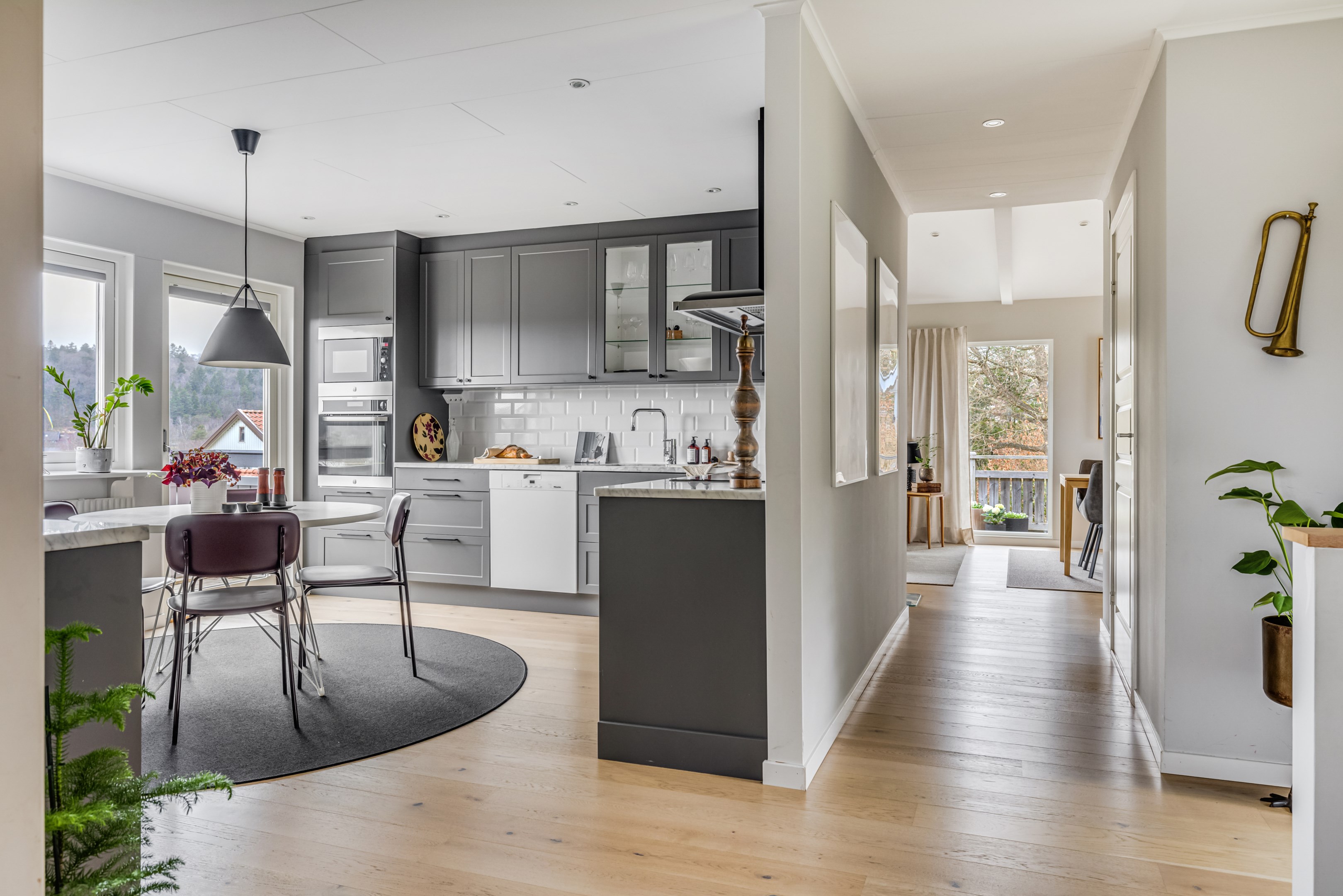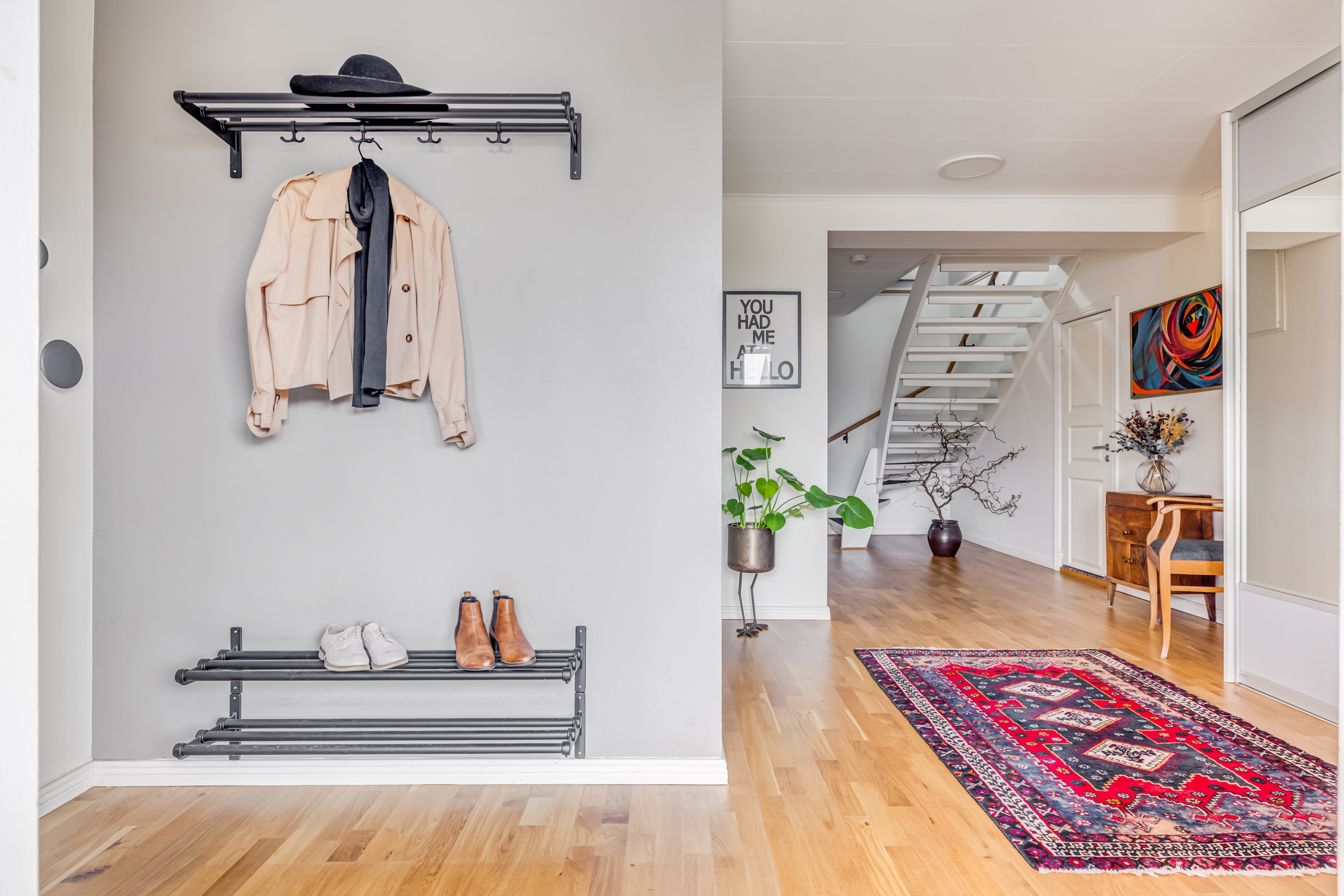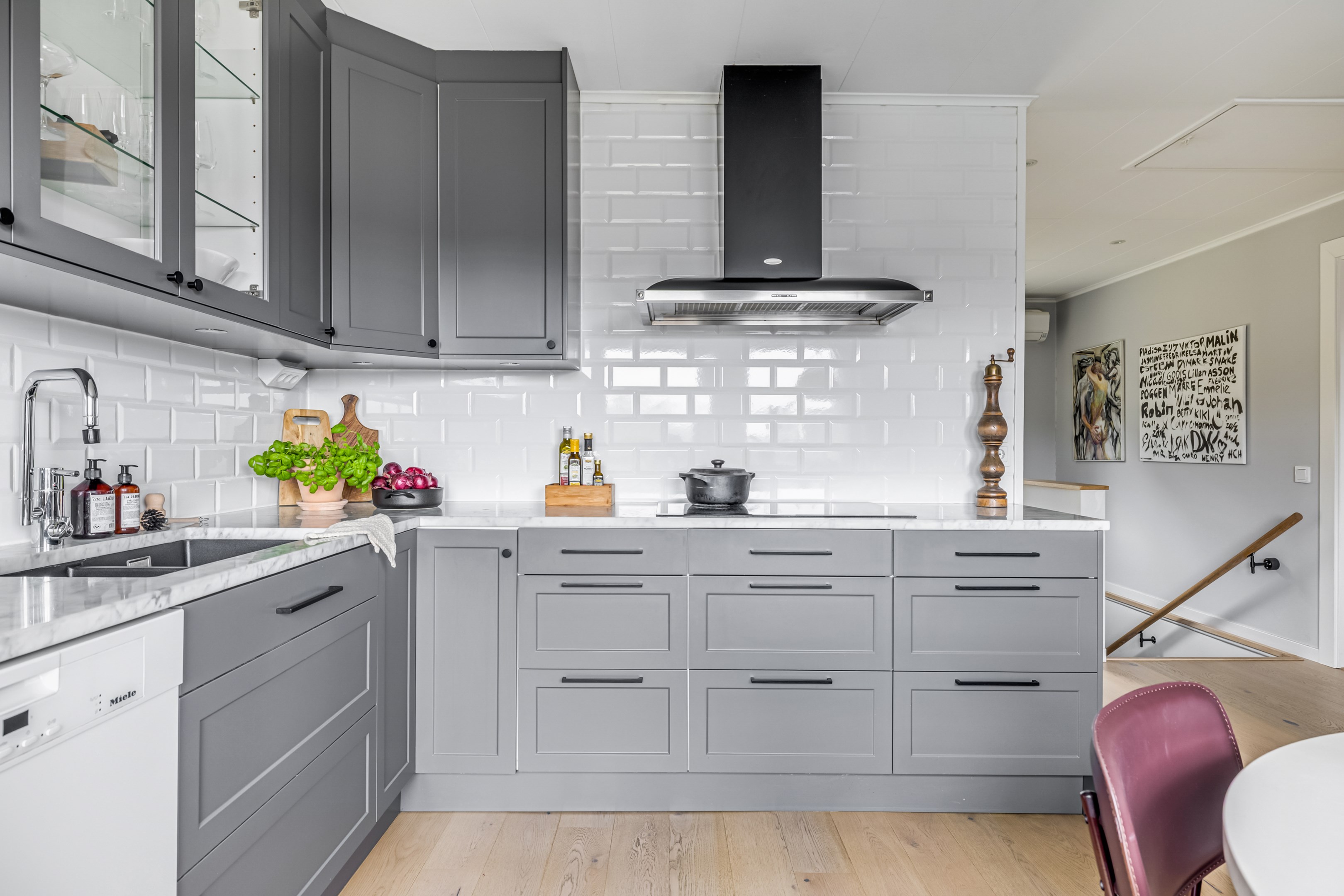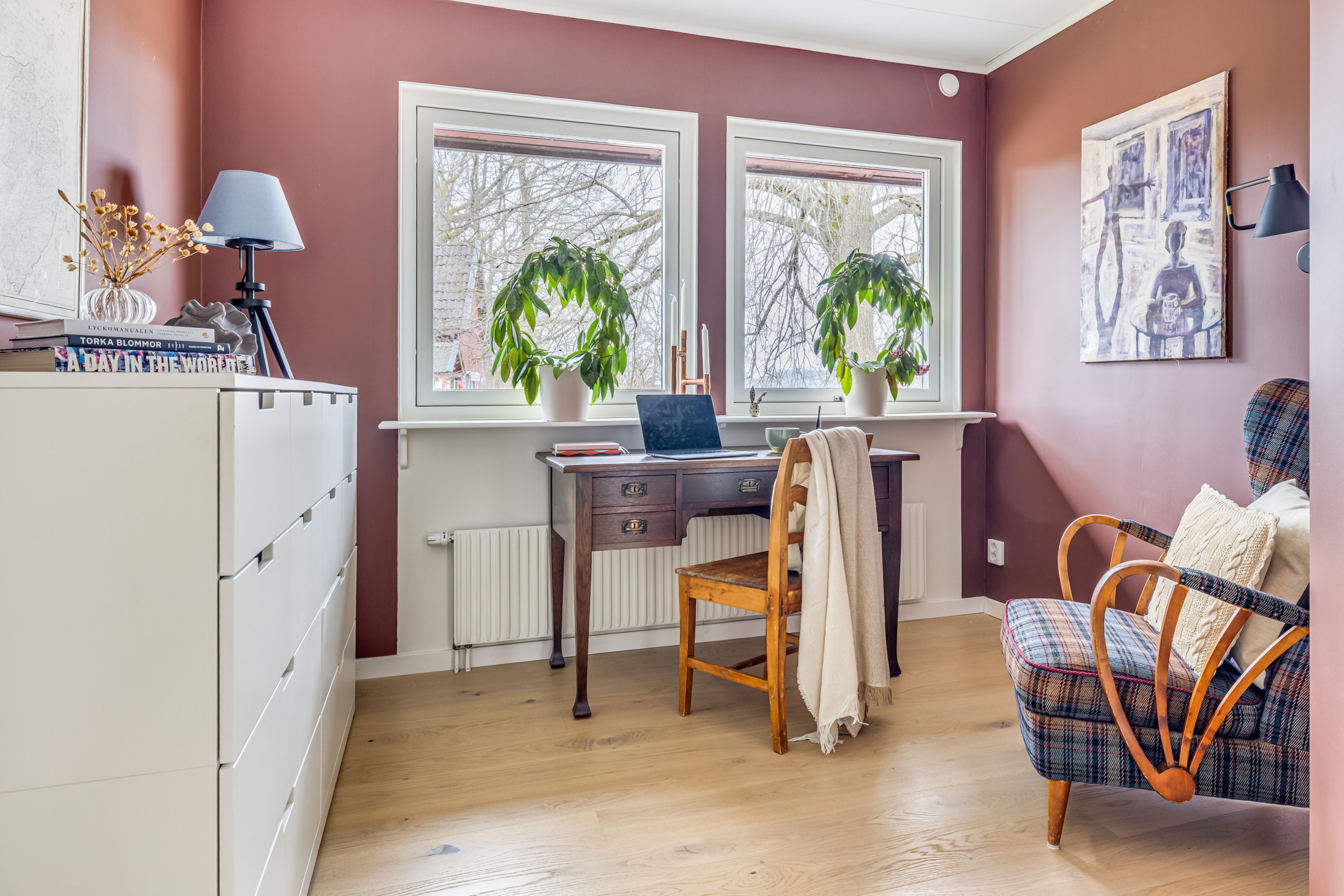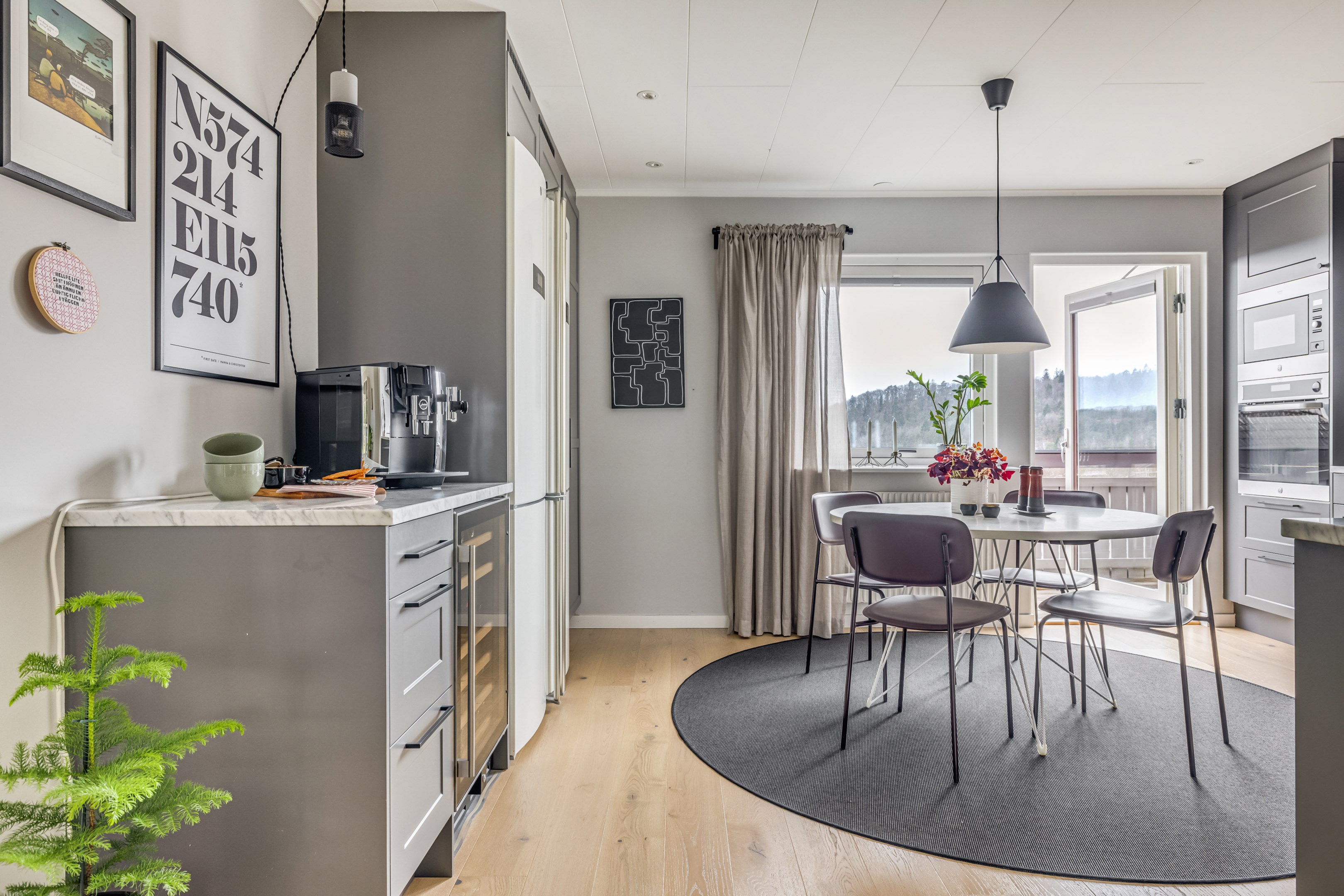 ENTRÉPLAN Praktiskt med entré under tak. När du kliver in via farstun möts du av en rymlig och välkomnande hall. Entrédörren har Yale Doorman lås och på vardera sida om dörren sitter ett högsmalt fönster som släpper in ljus. Rikligt med förvaring finns i en generös garderobslösning med skjutdörrar. Möjlighet finns att sätta in en dörr ut mot garagedelen. Gott om plats för ytterkläder och skor finns längs med ena väggen. Den väggen är målad i en ljusgrå nyans och övriga väggar är målade i vitt. Från hallen fortsätter parkettgolvet i ek vidare in i sovrum och klädkammare. Sovrummet är väl tilltaget och har en klädkammare. Ett rogivande rum som vetter mot den lugna återvändsgatan. Plats finns för garderober och byråar. Väggarna är målade i en mörk, grön nyans Jotun Balans. I klädkammaren finns mycket bra förvaring och en garderob. Här är väggarna målade i vitt. Vidare in i hallen ligger ett flexibelt allrum som av ägarna används som kombinerat gästrum, kontor och musikstudio. Rummet kan likväl användas som ett mysigt sällskapsrum, gym och som en lyxigt stor förvaringsyta. På det isolerade betonggolvet ligger en heltäckningsmatta. Väggarna är målade i vitt och utanpåliggandes spotlights i taket lyser upp med ett stämningsfullt sken. Denna ytan var tidigare en del av garaget och ett förråd. Önskar du större garage kan du ta bort väggen ut mot garagedelen igen. I anslutning till hallen ligger ett helkaklat duschrum. Väggarna pryds av ett vitt kakel och på golvet ligger en mörk klinker. Här finns handfat med kommod, spegel och wc. Under 2021 sattes ett högskåp in och duschväggarna byttes ut mot nya. Vägg i vägg har du en rymlig tvättstuga med tätskikt i original utförande. Här finns mycket bra arbetsytor och gott om plats för ytterligare klädvård. Ovan tvättmaskin från 2019 och torktumlare från 2022 finns en bänkskiva i laminat. Under 2021 målades golvet om, garderober sattes in, bänkskivan byttes ut och nya skåp sattes upp. Väggarna är målade i vitt och betonggolvet är målat i en grå nyans. Innanför tvättstugan ligger pannrummet och här står husets bergvärmeanläggning. Här finns smarta förvaringslösningar och gott om plats för att förvara ytterkläder och skor. ÖVRE PLAN På det övre planet möts du direkt av det fina ljusinsläppet och det trendiga köket. De genomtänkta fönsterplaceringarna på detta plan ger dig direkt ovanför trappan ett unikt ljusflöde från fyra väderstreck. På alla golv ligger en enstavs parkett i ek, Tarkett Prestige, som är laserad i en ljusare nyans. I hallen och köket är väggarna målade i en behaglig grå nyans, Jotun Morgondis. Från hallen når du via en helglasad balkongdörr uteplatser och trädgård. Köket som är signerat Woodrich är en svensk kökstillverkare som specialiserar sig på måttanpassade kökslösningar och utbytesluckor med fokus på att kombinera personlig design med hantverksmässig kvalitet. Köket har skåp i fullhöjd och luckor i en snygg antracitgrå nyans. Här finns generöst med förvaring. Ett belyst vitrinskåp blir en trevlig detalj. Vitvarorna består av induktionshäll, fläktkåpa i rostfritt, varmluftsugn och mikro från 2016. Kyl och frys är från 2015 och diskmaskin från 2014. En extra front i samma färg som köket finns om man vill sätta in en integrerad diskmaskin. Vid kyl och frys finns en smart placerad avställningsbänk. Här finns även en vinkyl. Ovanför påkostade bänkskivor i vit Carraramarmor sitter ett vitt fasat kakel i halvförband som vid fläkten går hela vägen upp till taket. Infällda spotlights i taket lyser upp med ett fint sken. Matplatsen fullkomligt badar i ljus. Från köket har du fantastiskt utsikt och via en helglasad balkongdörr når du den soldränkta balkongen. En flexibel sällskapsyta finns i anslutning till kök och hall. Har i dagsläget används som kontor men lämpar sig lika väl till ett litet tv-rum till barnen. Väggarna är målade i en en dov röd nyans, Jotun Sophisticated Red. På vardera sida om rummet ligger två sovrum. Det största rummet har en generös garderobslösning bakom ett draperi längs med hela ena väggen. Väggarna är målade i vitt. Det andra rummet ligger i vinkel och rymmer det mesta som behövs såsom säng, skrivbord och byrå. Detta rummet har en målad fond och övriga väggar är målade i vitt. Det eleganta badrummet erbjuder en harmonisk kombination av stil och komfort där varje detalj är noggrant genomtänkt. Här möts du av en påkostad interiör med rena linjer och materialval av högsta kvalitet som skapar en tidlös och lyxig känsla. Bakom stora glasdörrar väntar generösa dubbelduschar. De infällda nischerna ger praktisk förvaring. Den rejäla kommoden med dubbla handfat erbjuder gott om utrymme och bekvämlighet. Ovanför löper en stor spegel längs väggen som förstärker rymden och reflekterar ljuset på ett vackert sätt. Ett fönster släpper in naturligt dagsljus medan infällda spotlights i taket ger en behaglig och stämningsfull belysning under dygnets alla timmar. Den behagliga elgolvvärmen gör varje steg varmt och komfortabelt. Både vägghängd toalett och komod gör det enkelt att städa. Vidare in i huset öppnar sig vardagsrummet som med sina synliga balkar och generösa takhöjd ger en härlig rymd. Rummet som är både luftigt och ljust har stora fönsterpartier som släpper in rikligt med naturligt ljus och skapar en öppen och välkomnande känsla. Rummets generösa ytor erbjuder dig goda möjligheter att skapa en trivsam och funktionell möblering. Kaminen ger hög mysfaktor och skönt värmetillskott under kallare dagar. Väggarna är målade i en greige nyans, Jotun Kalk. Rummet kan delas av till ett extra sovrum om behovet finns. En balkongdörr leder dig ut till uterummet utanför som blir som ett extra vardagsrum. Den perfekta platsen för avkoppling, gemenskap och underhållning u