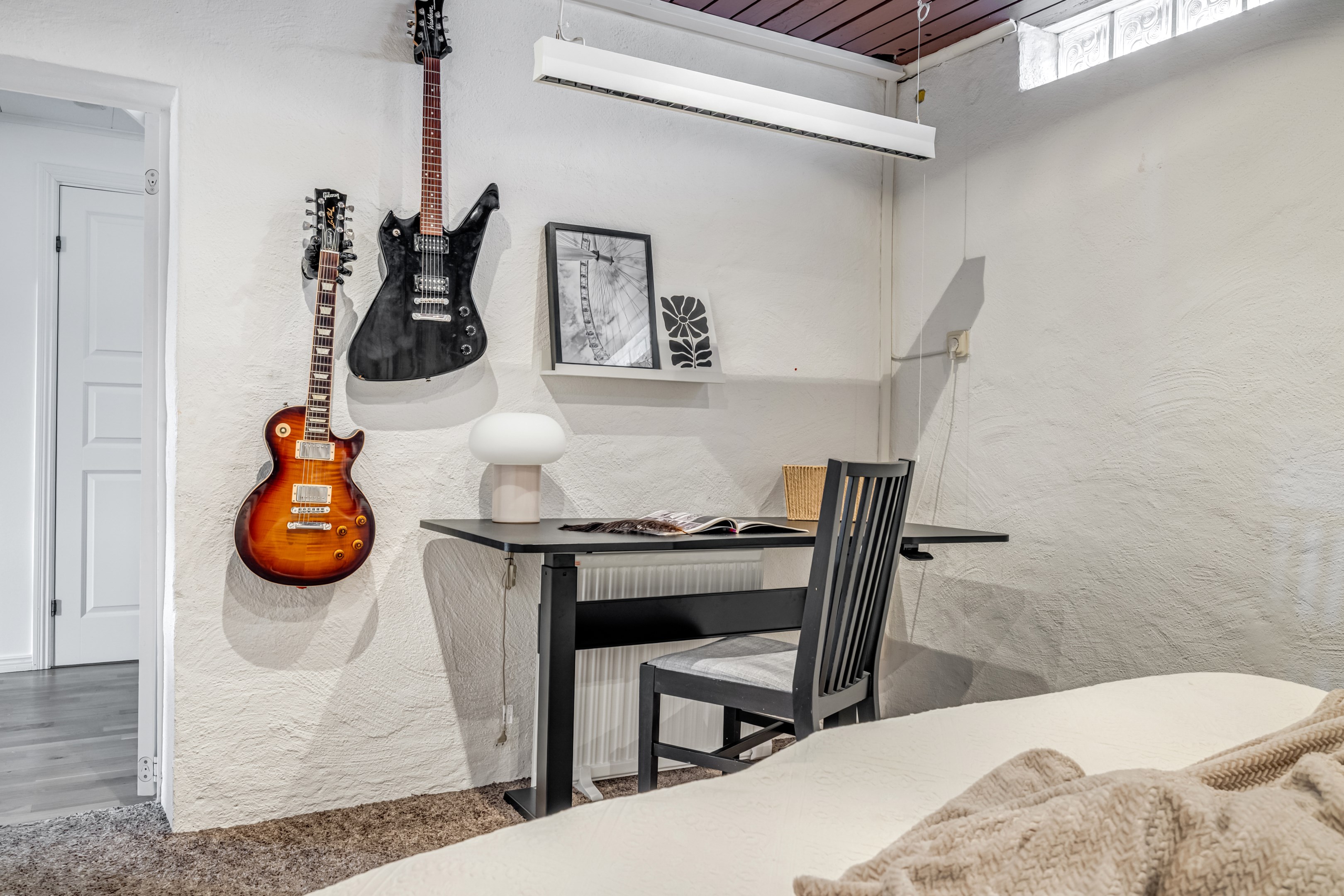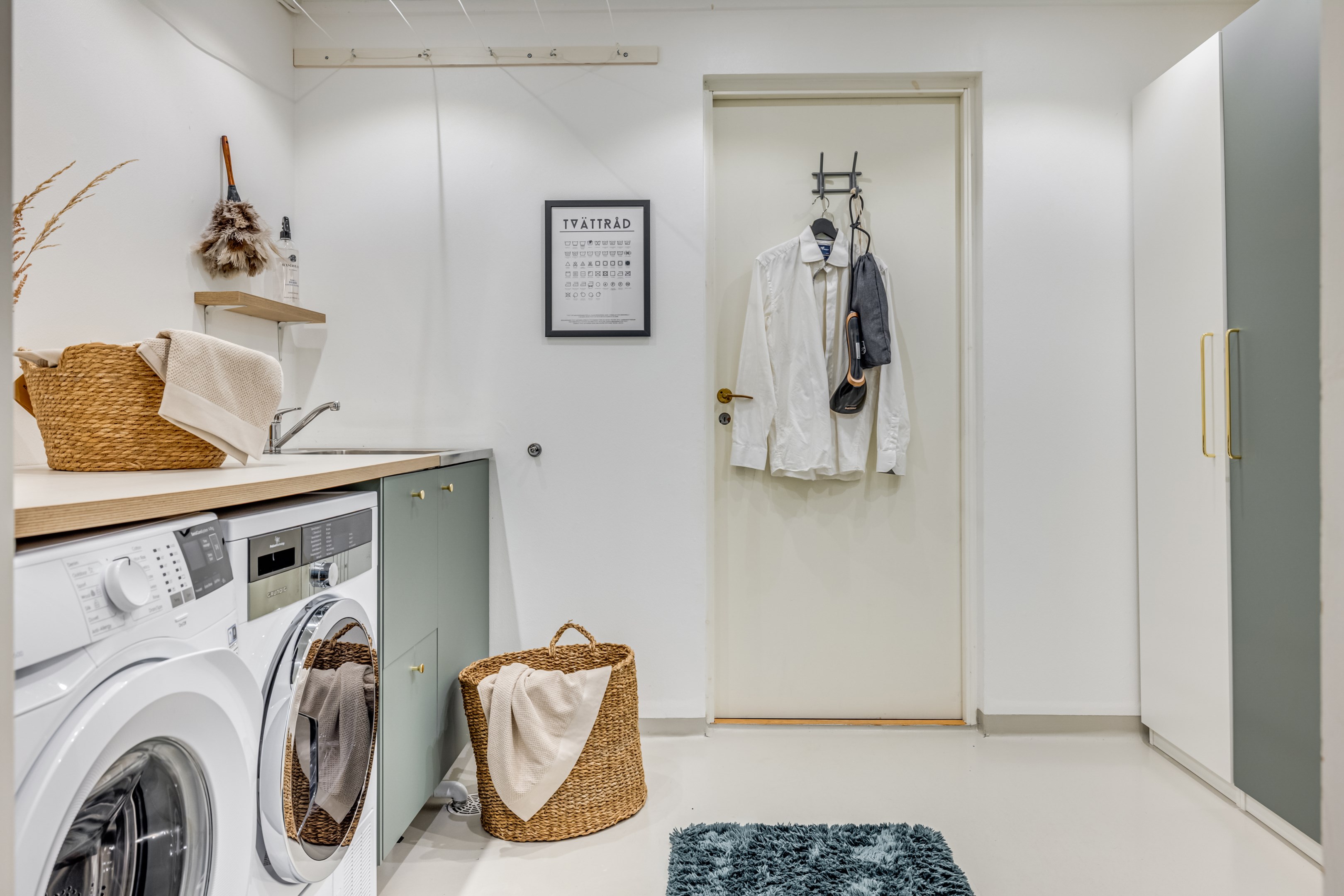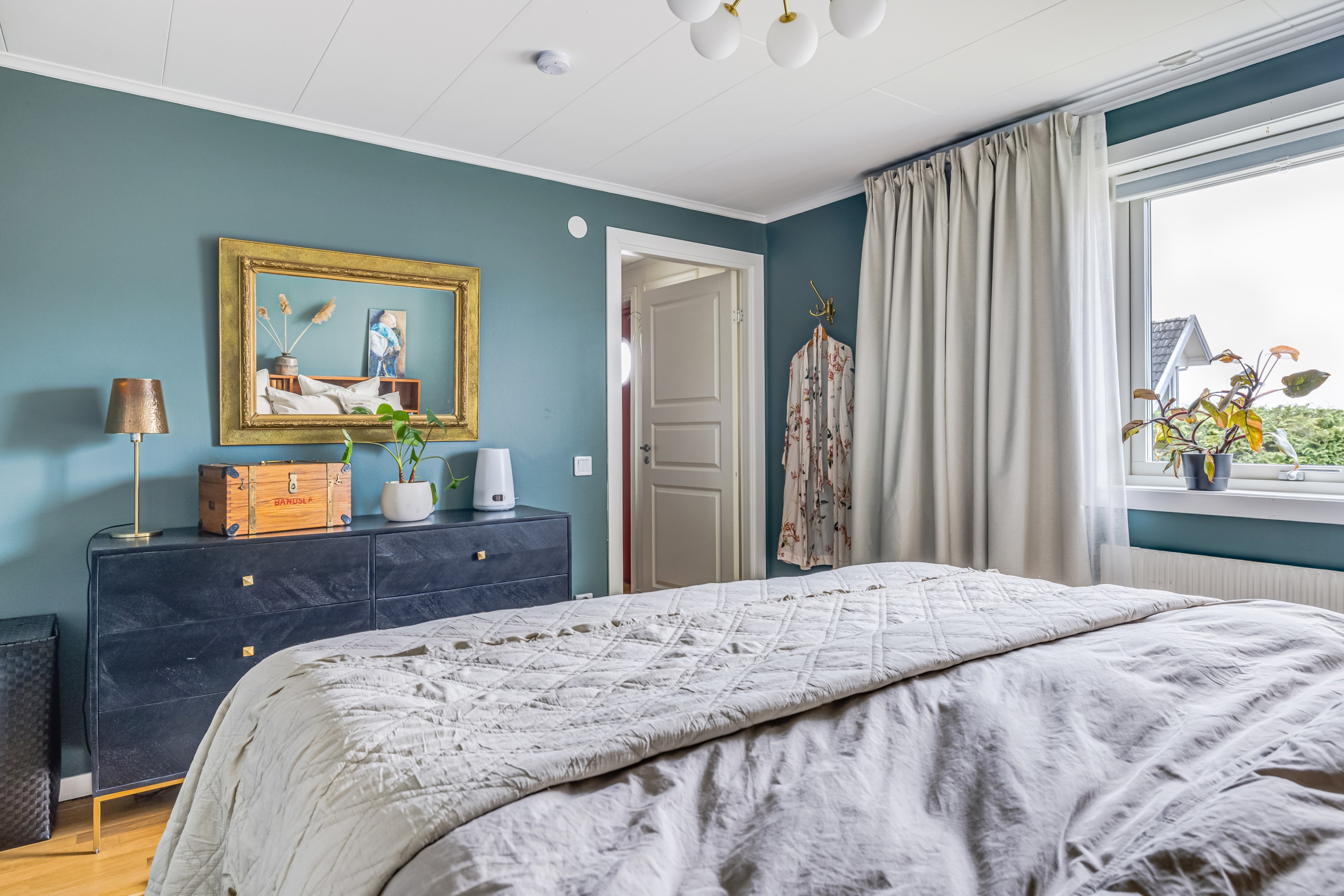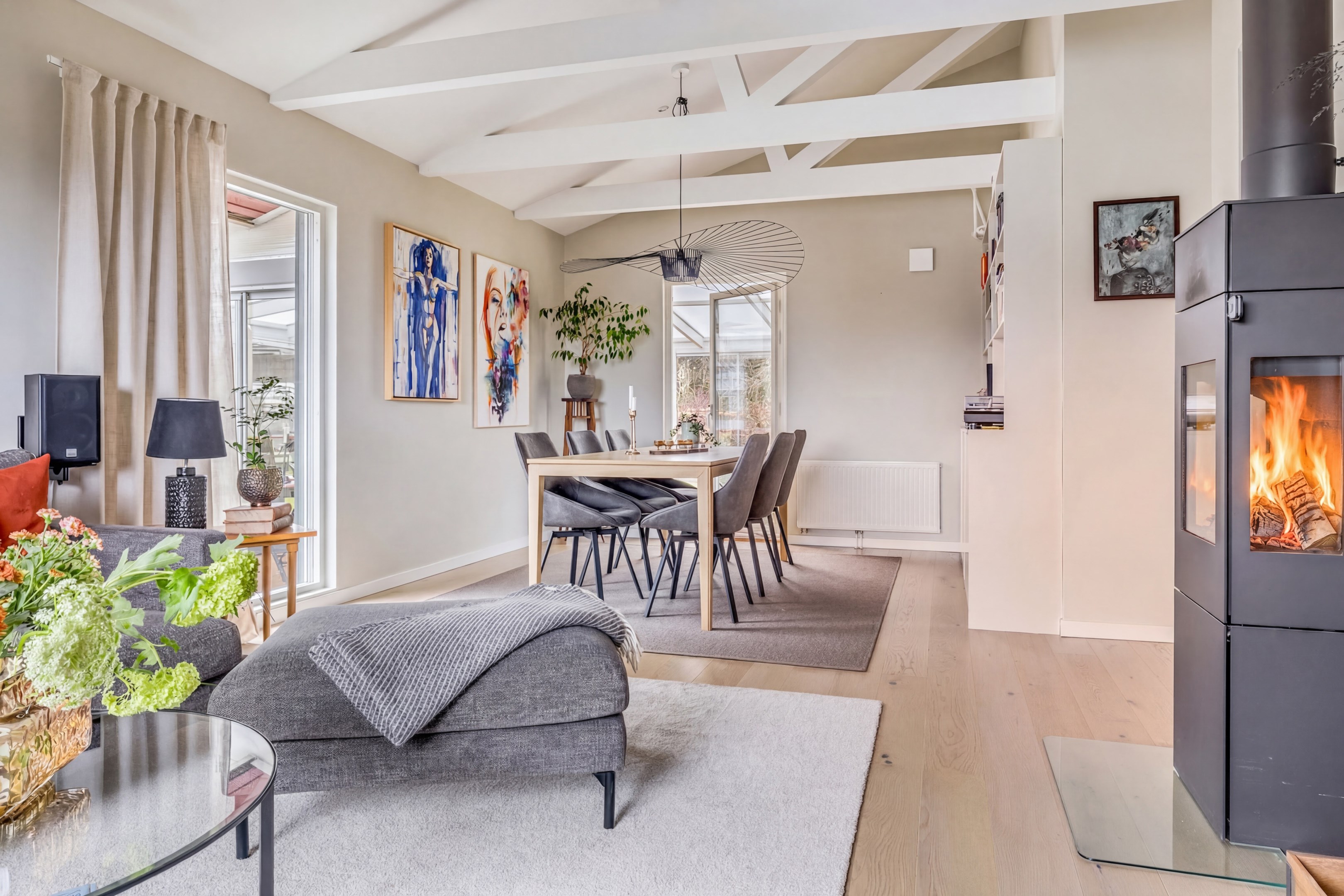 ENTRÉPLAN Praktiskt med entré under tak. När du kliver in via farstun möts du av en rymlig och välkomnande hall. Entrédörren har Yale Doorman lås och på vardera sida om dörren sitter ett högsmalt fönster som släpper in ljus. Rikligt med förvaring finns i en generös garderobslösning med skjutdörrar. Möjlighet finns att sätta in en dörr ut mot garagedelen. Gott om plats för ytterkläder och skor finns längs med ena väggen. Den väggen är målad i en ljusgrå nyans och övriga väggar är målade i vitt. Från hallen fortsätter parkettgolvet i ek vidare in i sovrum och klädkammare. Sovrummet är väl tilltaget och har en klädkammare. Ett rogivande rum som vetter mot den lugna återvändsgatan. Plats finns för garderober och byråar. Väggarna är målade i en mörk, grön nyans Jotun Balans. I klädkammaren finns mycket bra förvaring och en garderob. Här är väggarna målade i vitt. Vidare in i hallen ligger ett flexibelt allrum som av ägarna används som kombinerat gästrum, kontor och musikstudio. Rummet kan likväl användas som ett mysigt sällskapsrum, gym och som en lyxigt stor förvaringsyta. På det isolerade betonggolvet ligger en heltäckningsmatta. Väggarna är målade i vitt och utanpåliggandes spotlights i taket lyser upp med ett stämningsfullt sken. Denna ytan var tidigare en del av garaget och ett förråd. Önskar du större garage kan du ta bort väggen ut mot garagedelen igen. I anslutning till hallen ligger ett helkaklat duschrum. Väggarna pryds av ett vitt kakel och på golvet ligger en mörk klinker. Här finns handfat med kommod, spegel och wc. Under 2021 sattes ett högskåp in och duschväggarna byttes ut mot nya. Vägg i vägg har du en rymlig tvättstuga med tätskikt i original utförande. Här finns mycket bra arbetsytor och gott om plats för ytterligare klädvård. Ovan tvättmaskin från 2019 och torktumlare från 2022 finns en bänkskiva i laminat. Under 2021 målades golvet om, garderober sattes in, bänkskivan byttes ut och nya skåp sattes upp. Väggarna är målade i vitt och betonggolvet är målat i en grå nyans. Innanför tvättstugan ligger pannrummet och här står husets bergvärmeanläggning. Här finns smarta förvaringslösningar och gott om plats för att förvara ytterkläder och skor. ÖVRE PLAN På det övre planet möts du direkt av det fina ljusinsläppet och det trendiga köket. De genomtänkta fönsterplaceringarna på detta plan ger dig direkt ovanför trappan ett unikt ljusflöde från fyra väderstreck. På alla golv ligger en enstavs parkett i ek, Tarkett Prestige, som är laserad i en ljusare nyans. I hallen och köket är väggarna målade i en behaglig grå nyans, Jotun Morgondis. Från hallen når du via en helglasad balkongdörr uteplatser och trädgård. Köket som är signerat Woodrich är en svensk kökstillverkare som specialiserar sig på måttanpassade kökslösningar och utbytesluckor med fokus på att kombinera personlig design med hantverksmässig kvalitet. Köket har skåp i fullhöjd och luckor i en snygg antracitgrå nyans. Här finns generöst med förvaring. Ett belyst vitrinskåp blir en trevlig detalj. Vitvarorna består av induktionshäll, fläktkåpa i rostfritt, varmluftsugn och mikro från 2016. Kyl och frys är från 2015 och diskmaskin från 2014. En extra front i samma färg som köket finns om man vill sätta in en integrerad diskmaskin. Vid kyl och frys finns en smart placerad avställningsbänk. Här finns även en vinkyl. Ovanför påkostade bänkskivor i vit Carraramarmor sitter ett vitt fasat kakel i halvförband som vid fläkten går hela vägen upp till taket. Infällda spotlights i taket lyser upp med ett fint sken. Matplatsen fullkomligt badar i ljus. Från köket har du fantastiskt utsikt och via en helglasad balkongdörr når du den soldränkta balkongen. En flexibel sällskapsyta finns i anslutning till kök och hall. Har i dagsläget används som kontor men lämpar sig lika väl till ett litet tv-rum till barnen. Väggarna är målade i en en dov röd nyans, Jotun Sophisticated Red. På vardera sida om rummet ligger två sovrum. Det största rummet har en generös garderobslösning bakom ett draperi längs med hela ena väggen. Väggarna är målade i vitt. Det andra rummet ligger i vinkel och rymmer det mesta som behövs såsom säng, skrivbord och byrå. Detta rummet har en målad fond och övriga väggar är målade i vitt. Det eleganta badrummet erbjuder en harmonisk kombination av stil och komfort där varje detalj är noggrant genomtänkt. Här möts du av en påkostad interiör med rena linjer och materialval av högsta kvalitet som skapar en tidlös och lyxig känsla. Bakom stora glasdörrar väntar generösa dubbelduschar. De infällda nischerna ger praktisk förvaring. Den rejäla kommoden med dubbla handfat erbjuder gott om utrymme och bekvämlighet. Ovanför löper en stor spegel längs väggen som förstärker rymden och reflekterar ljuset på ett vackert sätt. Ett fönster släpper in naturligt dagsljus medan infällda spotlights i taket ger en behaglig och stämningsfull belysning under dygnets alla timmar. Den behagliga elgolvvärmen gör varje steg varmt och komfortabelt. Både vägghängd toalett och komod gör det enkelt att städa. Vidare in i huset öppnar sig vardagsrummet som med sina synliga balkar och generösa takhöjd ger en härlig rymd. Rummet som är både luftigt och ljust har stora fönsterpartier som släpper in rikligt med naturligt ljus och skapar en öppen och välkomnande känsla. Rummets generösa ytor erbjuder dig goda möjligheter att skapa en trivsam och funktionell möblering. Kaminen ger hög mysfaktor och skönt värmetillskott under kallare dagar. Väggarna är målade i en greige nyans, Jotun Kalk. Rummet kan delas av till ett extra sovrum om behovet finns. En balkongdörr leder dig ut till uterummet utanför som blir som ett extra vardagsrum. Den perfekta platsen för avkoppling, gemenskap och underhållning u