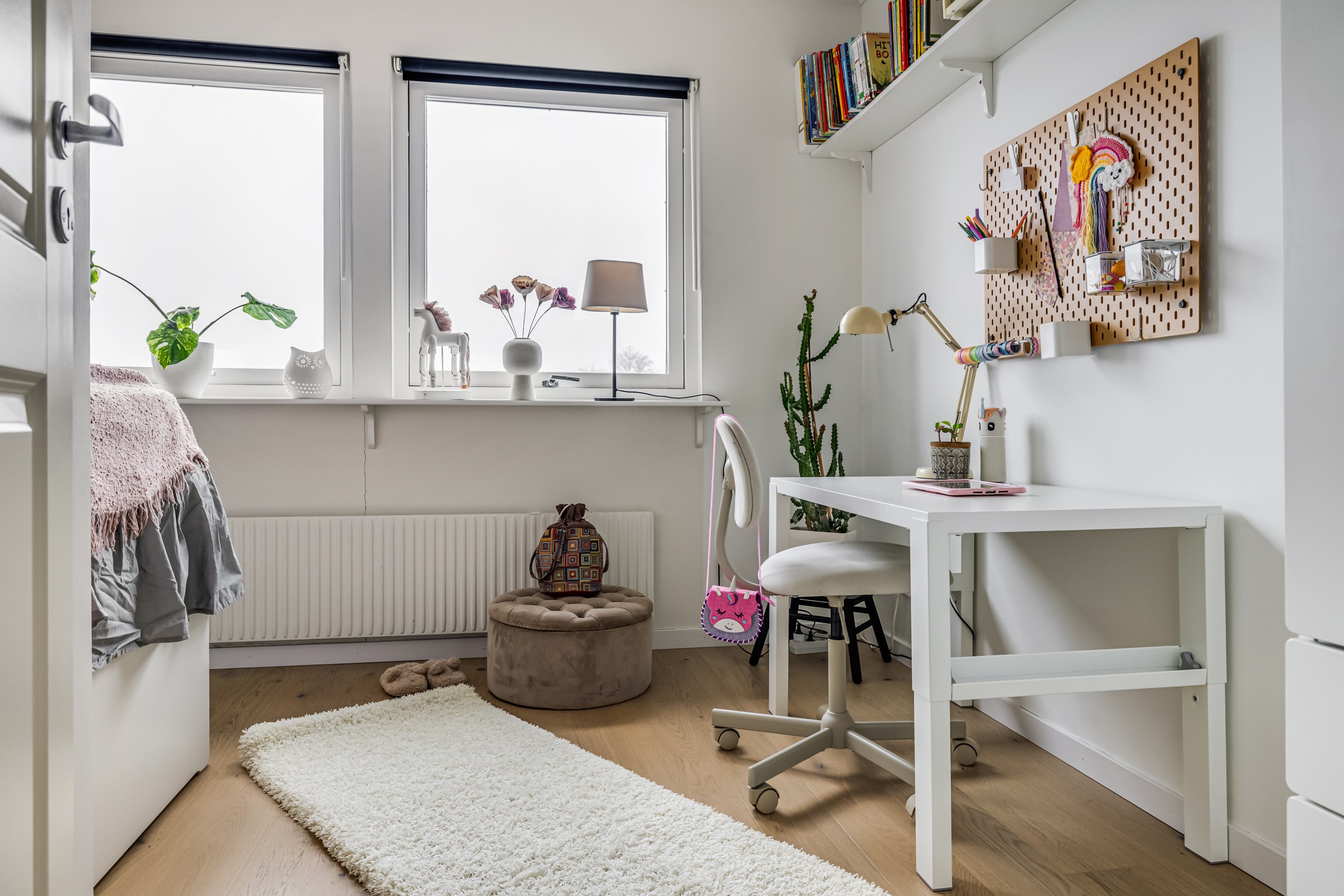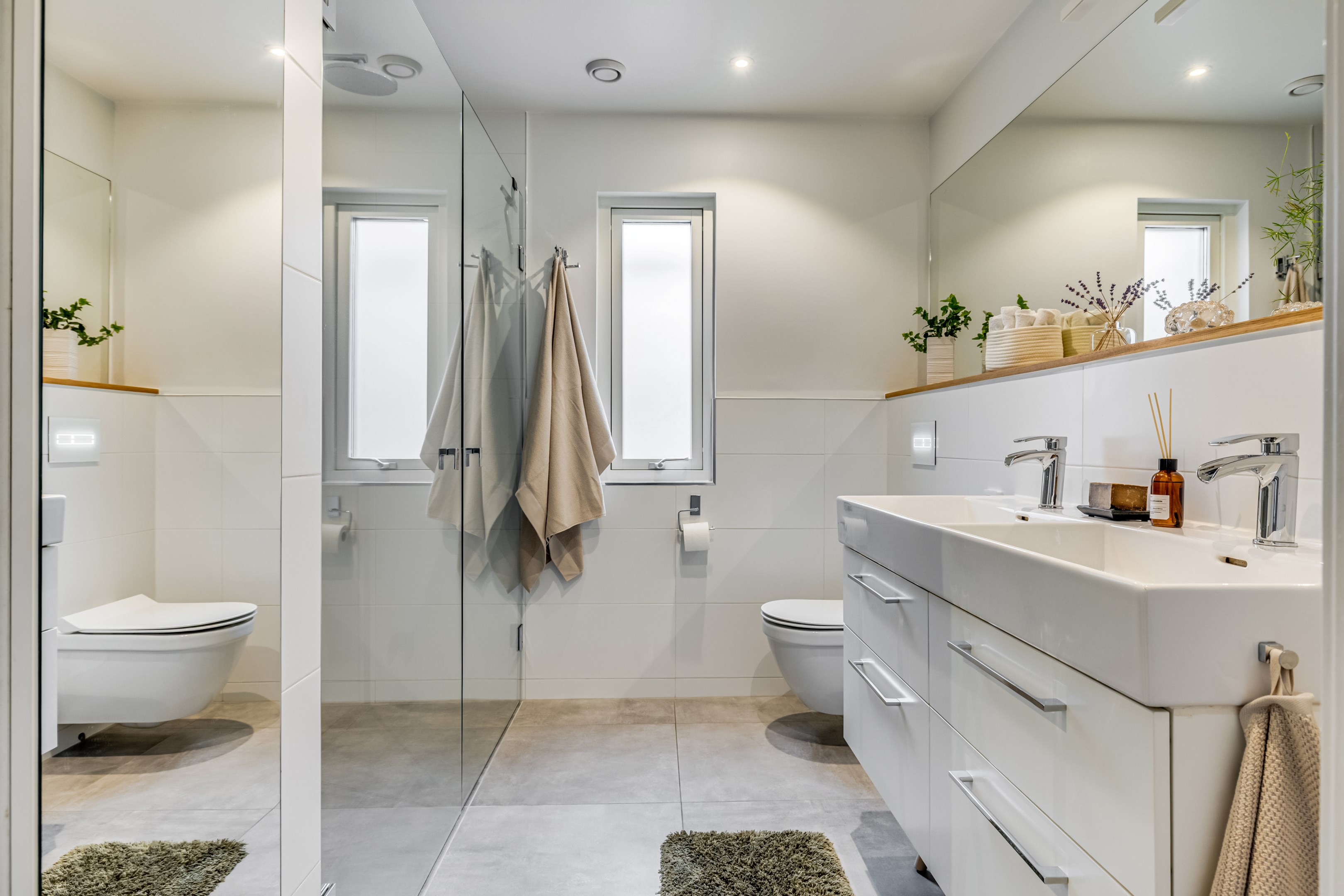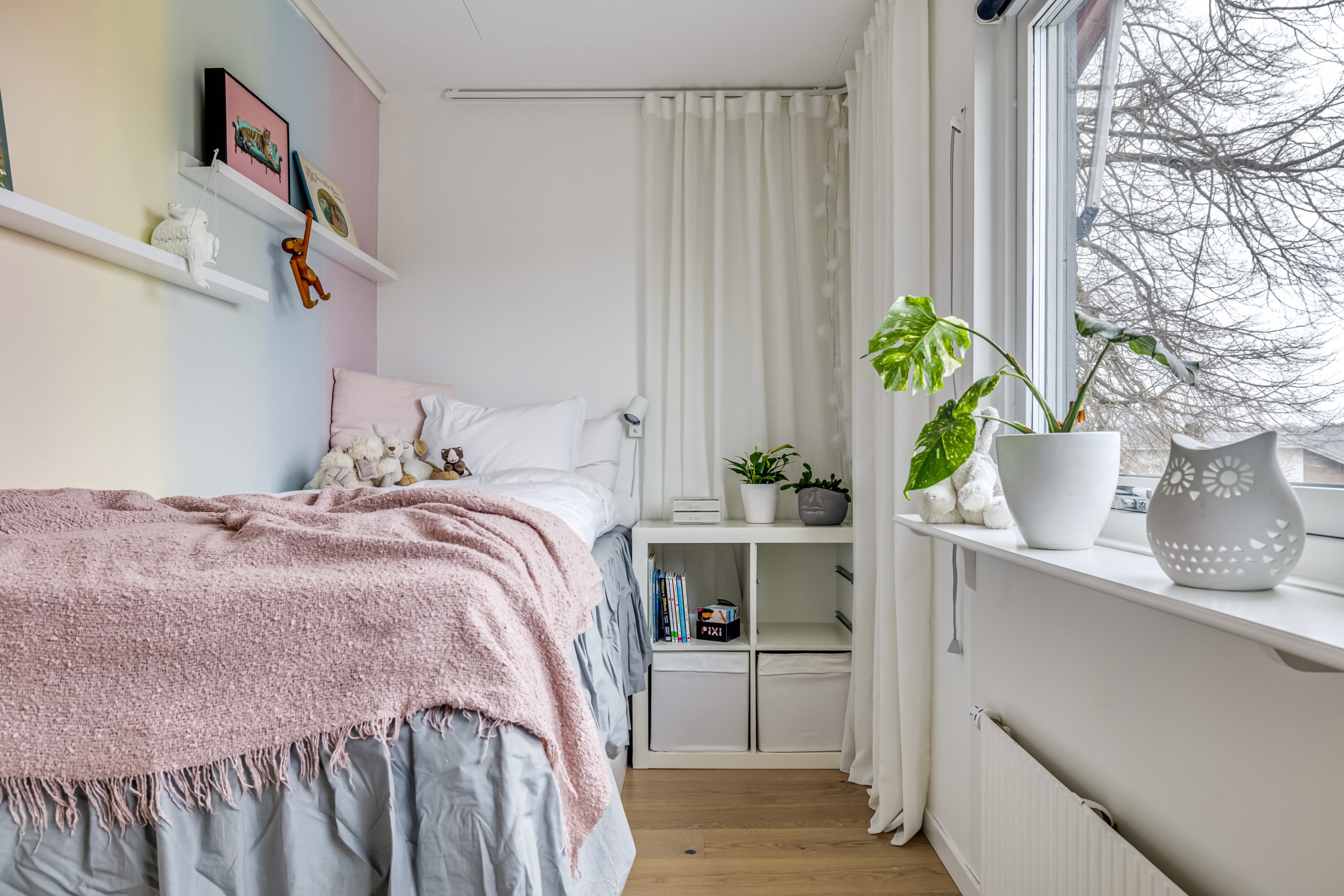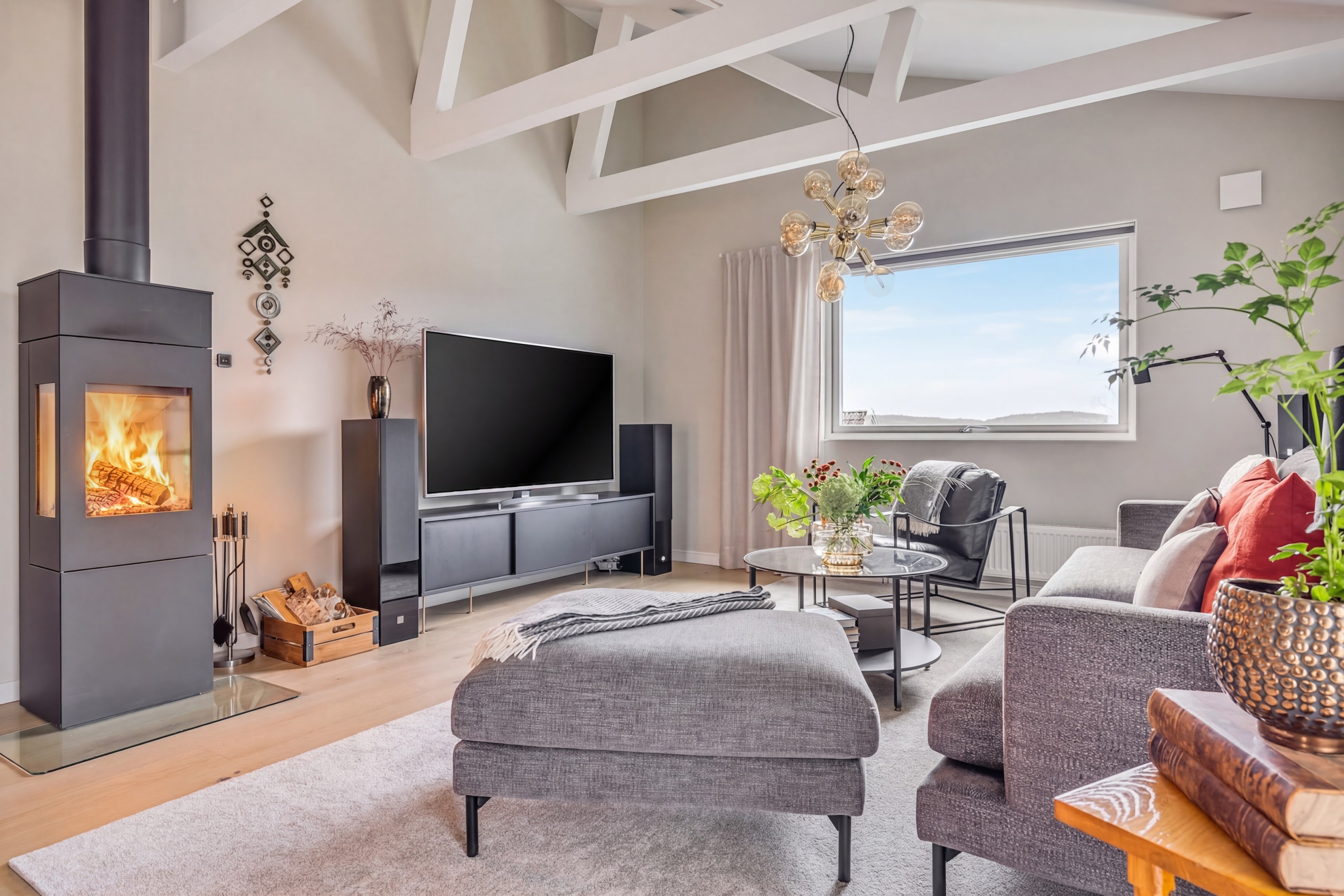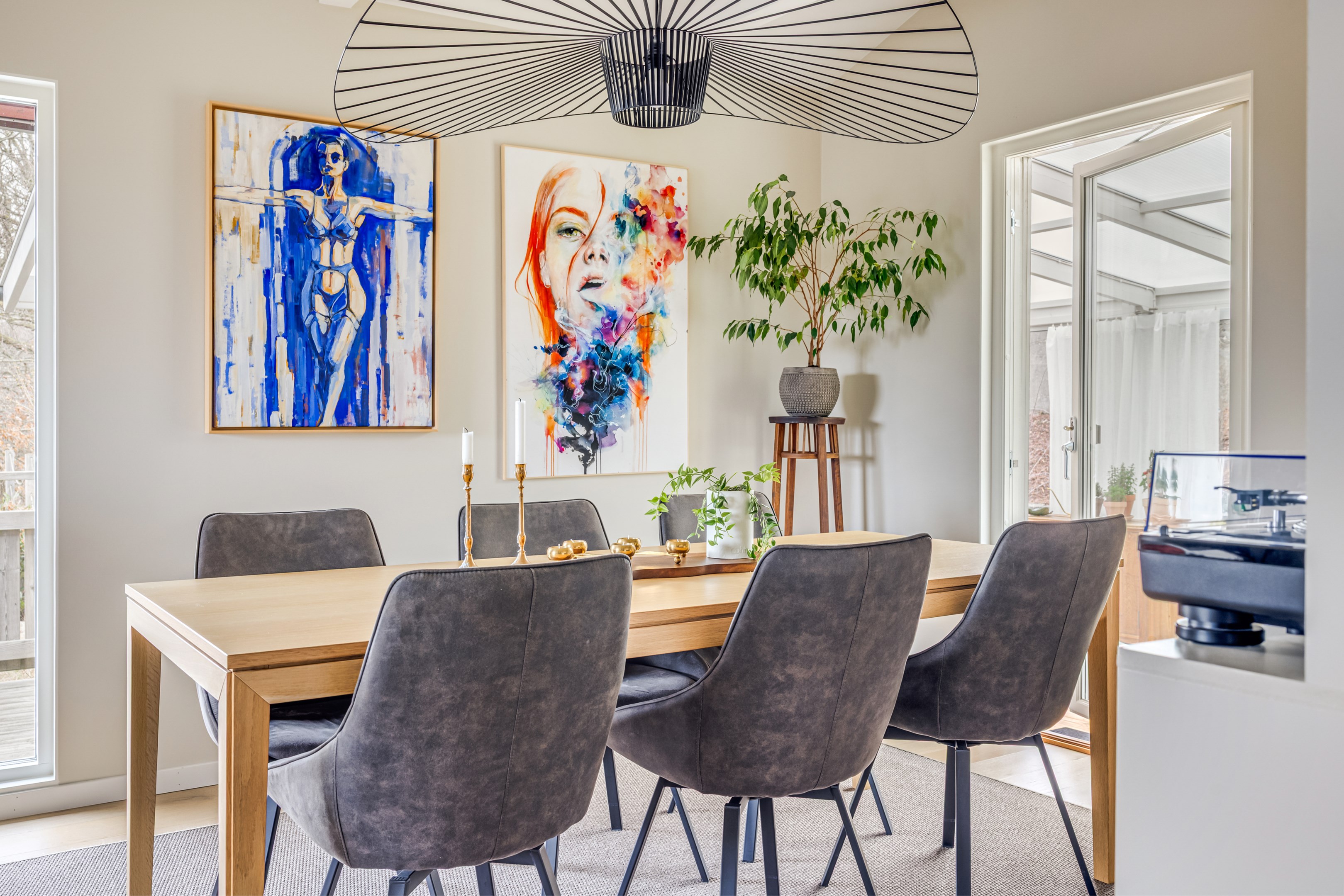 ENTRÉPLAN Praktiskt med entré under tak. När du kliver in via farstun möts du av en rymlig och välkomnande hall. Entrédörren har Yale Doorman lås och på vardera sida om dörren sitter ett högsmalt fönster som släpper in ljus. Rikligt med förvaring finns i en generös garderobslösning med skjutdörrar. Möjlighet finns att sätta in en dörr ut mot garagedelen. Gott om plats för ytterkläder och skor finns längs med ena väggen. Den väggen är målad i en ljusgrå nyans och övriga väggar är målade i vitt. Från hallen fortsätter parkettgolvet i ek vidare in i sovrum och klädkammare. Sovrummet är väl tilltaget och har en klädkammare. Ett rogivande rum som vetter mot den lugna återvändsgatan. Plats finns för garderober och byråar. Väggarna är målade i en mörk, grön nyans Jotun Balans. I klädkammaren finns mycket bra förvaring och en garderob. Här är väggarna målade i vitt. Vidare in i hallen ligger ett flexibelt allrum som av ägarna används som kombinerat gästrum, kontor och musikstudio. Rummet kan likväl användas som ett mysigt sällskapsrum, gym och som en lyxigt stor förvaringsyta. På det isolerade betonggolvet ligger en heltäckningsmatta. Väggarna är målade i vitt och utanpåliggandes spotlights i taket lyser upp med ett stämningsfullt sken. Denna ytan var tidigare en del av garaget och ett förråd. Önskar du större garage kan du ta bort väggen ut mot garagedelen igen. I anslutning till hallen ligger ett helkaklat duschrum. Väggarna pryds av ett vitt kakel och på golvet ligger en mörk klinker. Här finns handfat med kommod, spegel och wc. Under 2021 sattes ett högskåp in och duschväggarna byttes ut mot nya. Vägg i vägg har du en rymlig tvättstuga med tätskikt i original utförande. Här finns mycket bra arbetsytor och gott om plats för ytterligare klädvård. Ovan tvättmaskin från 2019 och torktumlare från 2022 finns en bänkskiva i laminat. Under 2021 målades golvet om, garderober sattes in, bänkskivan byttes ut och nya skåp sattes upp. Väggarna är målade i vitt och betonggolvet är målat i en grå nyans. Innanför tvättstugan ligger pannrummet och här står husets bergvärmeanläggning. Här finns smarta förvaringslösningar och gott om plats för att förvara ytterkläder och skor. ÖVRE PLAN På det övre planet möts du direkt av det fina ljusinsläppet och det trendiga köket. De genomtänkta fönsterplaceringarna på detta plan ger dig direkt ovanför trappan ett unikt ljusflöde från fyra väderstreck. På alla golv ligger en enstavs parkett i ek, Tarkett Prestige, som är laserad i en ljusare nyans. I hallen och köket är väggarna målade i en behaglig grå nyans, Jotun Morgondis. Från hallen når du via en helglasad balkongdörr uteplatser och trädgård. Köket som är signerat Woodrich är en svensk kökstillverkare som specialiserar sig på måttanpassade kökslösningar och utbytesluckor med fokus på att kombinera personlig design med hantverksmässig kvalitet. Köket har skåp i fullhöjd och luckor i en snygg antracitgrå nyans. Här finns generöst med förvaring. Ett belyst vitrinskåp blir en trevlig detalj. Vitvarorna består av induktionshäll, fläktkåpa i rostfritt, varmluftsugn och mikro från 2016. Kyl och frys är från 2015 och diskmaskin från 2014. En extra front i samma färg som köket finns om man vill sätta in en integrerad diskmaskin. Vid kyl och frys finns en smart placerad avställningsbänk. Här finns även en vinkyl. Ovanför påkostade bänkskivor i vit Carraramarmor sitter ett vitt fasat kakel i halvförband som vid fläkten går hela vägen upp till taket. Infällda spotlights i taket lyser upp med ett fint sken. Matplatsen fullkomligt badar i ljus. Från köket har du fantastiskt utsikt och via en helglasad balkongdörr når du den soldränkta balkongen. En flexibel sällskapsyta finns i anslutning till kök och hall. Har i dagsläget används som kontor men lämpar sig lika väl till ett litet tv-rum till barnen. Väggarna är målade i en en dov röd nyans, Jotun Sophisticated Red. På vardera sida om rummet ligger två sovrum. Det största rummet har en generös garderobslösning bakom ett draperi längs med hela ena väggen. Väggarna är målade i vitt. Det andra rummet ligger i vinkel och rymmer det mesta som behövs såsom säng, skrivbord och byrå. Detta rummet har en målad fond och övriga väggar är målade i vitt. Det eleganta badrummet erbjuder en harmonisk kombination av stil och komfort där varje detalj är noggrant genomtänkt. Här möts du av en påkostad interiör med rena linjer och materialval av högsta kvalitet som skapar en tidlös och lyxig känsla. Bakom stora glasdörrar väntar generösa dubbelduschar. De infällda nischerna ger praktisk förvaring. Den rejäla kommoden med dubbla handfat erbjuder gott om utrymme och bekvämlighet. Ovanför löper en stor spegel längs väggen som förstärker rymden och reflekterar ljuset på ett vackert sätt. Ett fönster släpper in naturligt dagsljus medan infällda spotlights i taket ger en behaglig och stämningsfull belysning under dygnets alla timmar. Den behagliga elgolvvärmen gör varje steg varmt och komfortabelt. Både vägghängd toalett och komod gör det enkelt att städa. Vidare in i huset öppnar sig vardagsrummet som med sina synliga balkar och generösa takhöjd ger en härlig rymd. Rummet som är både luftigt och ljust har stora fönsterpartier som släpper in rikligt med naturligt ljus och skapar en öppen och välkomnande känsla. Rummets generösa ytor erbjuder dig goda möjligheter att skapa en trivsam och funktionell möblering. Kaminen ger hög mysfaktor och skönt värmetillskott under kallare dagar. Väggarna är målade i en greige nyans, Jotun Kalk. Rummet kan delas av till ett extra sovrum om behovet finns. En balkongdörr leder dig ut till uterummet utanför som blir som ett extra vardagsrum. Den perfekta platsen för avkoppling, gemenskap och underhållning u