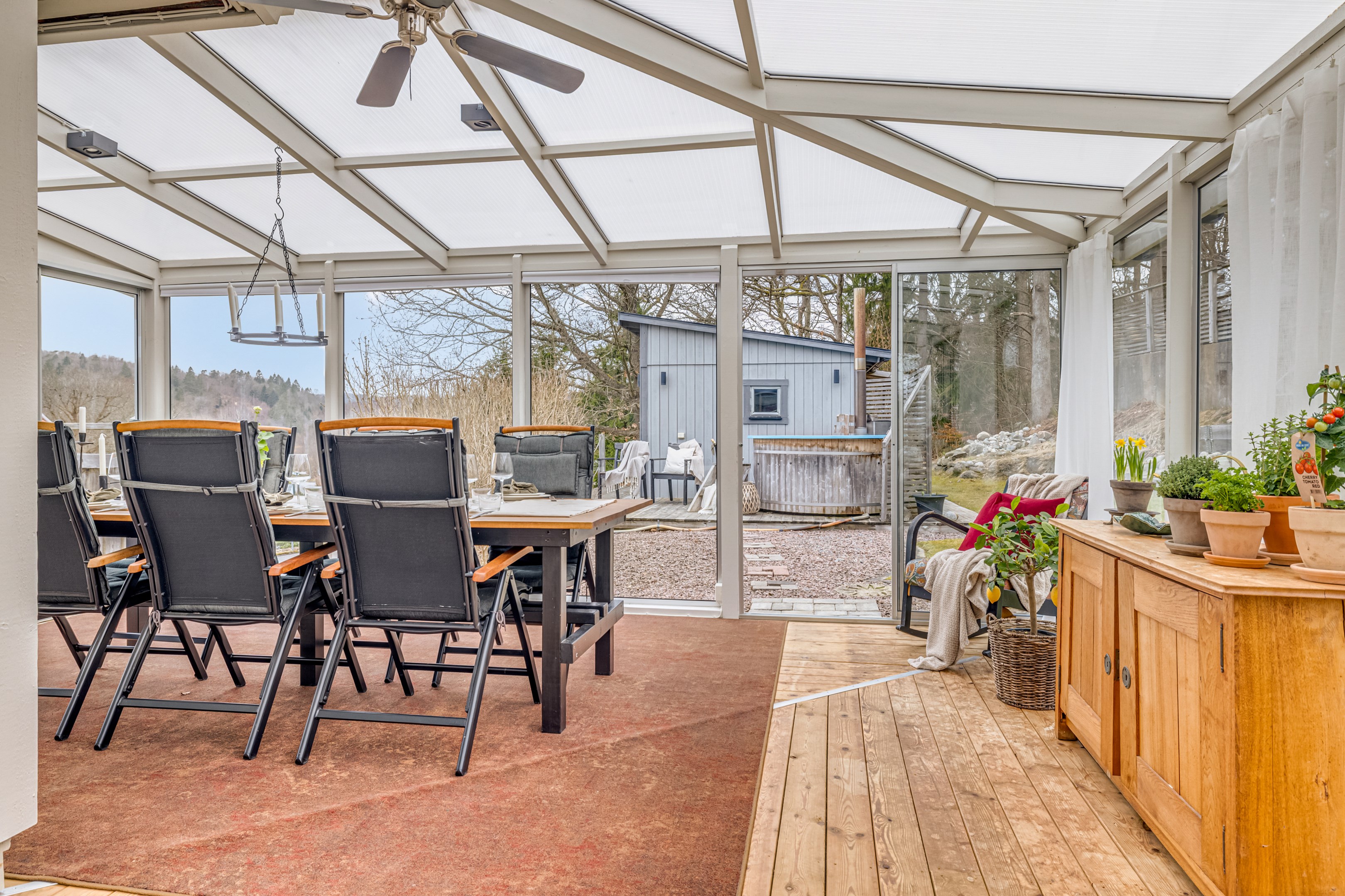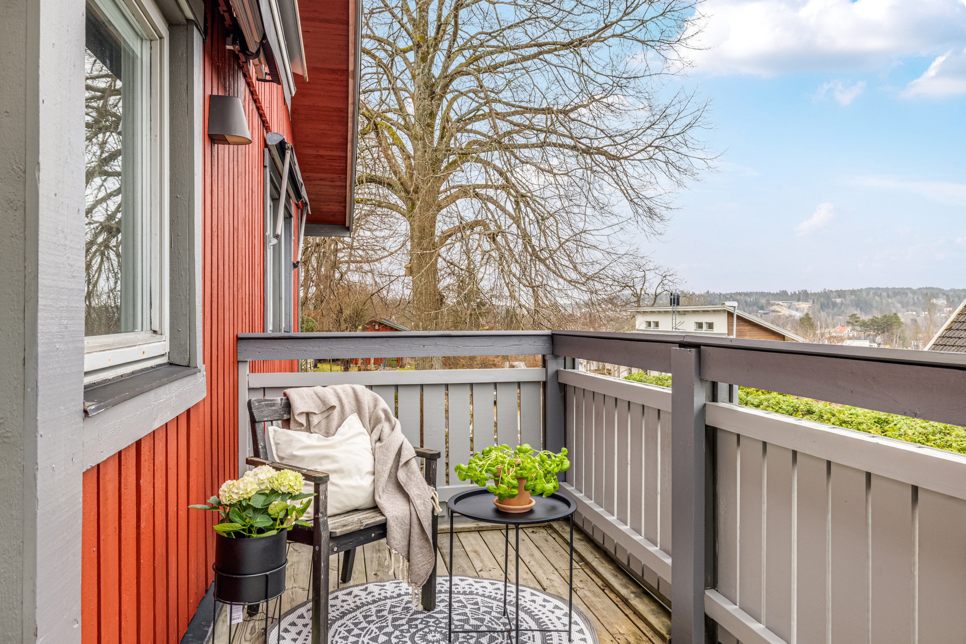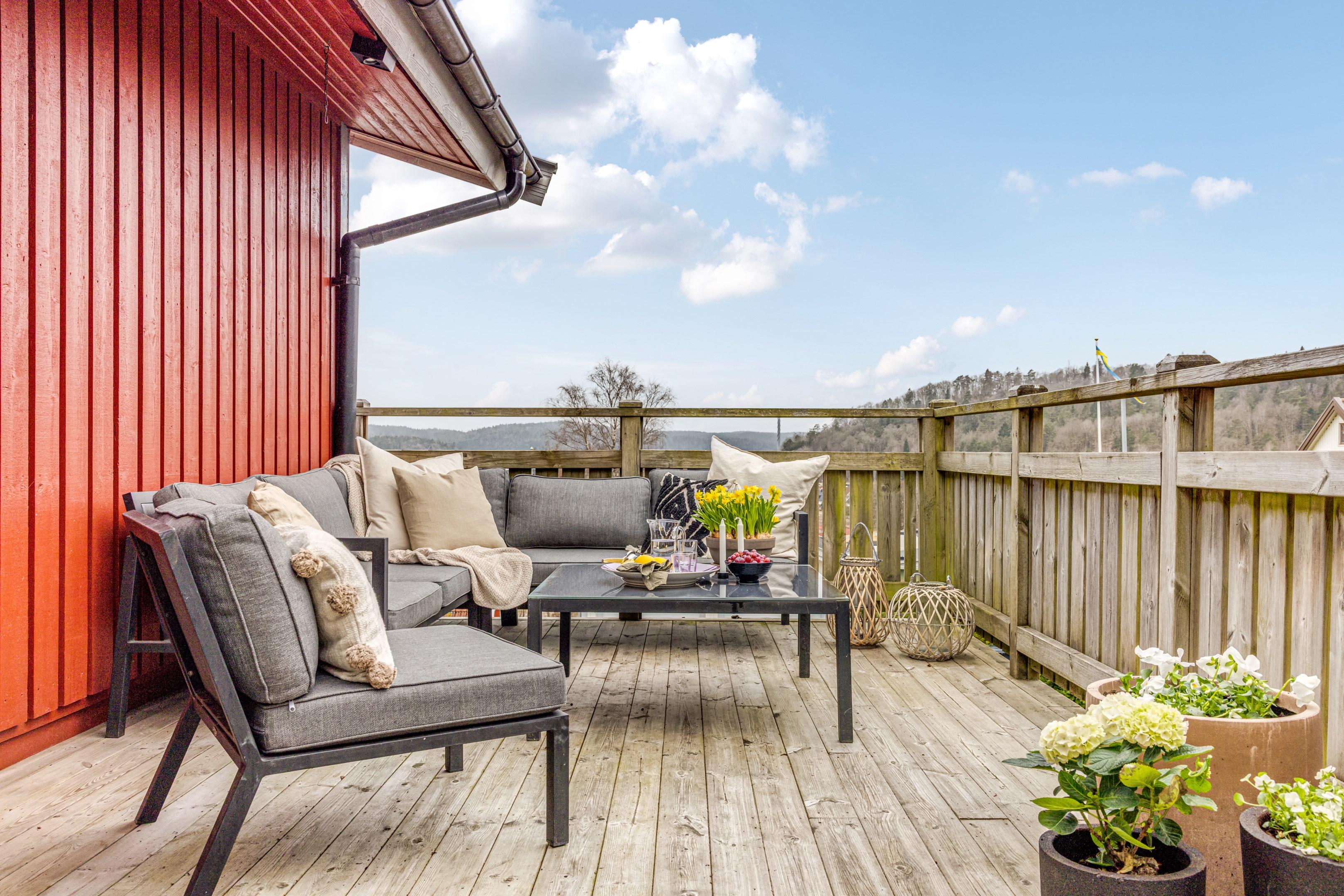 Träaltanen går runt två sidor av huset med solmöjligheter från morgon till kväll. Här erbjuds du både vid sträckt utsikt och lummig grönska. Det mysiga uterummet är placerat mittemellan altanerna och nås även från vardagsrummet. Från köket når du den lilla balkongen som ligger i sydvästläge.