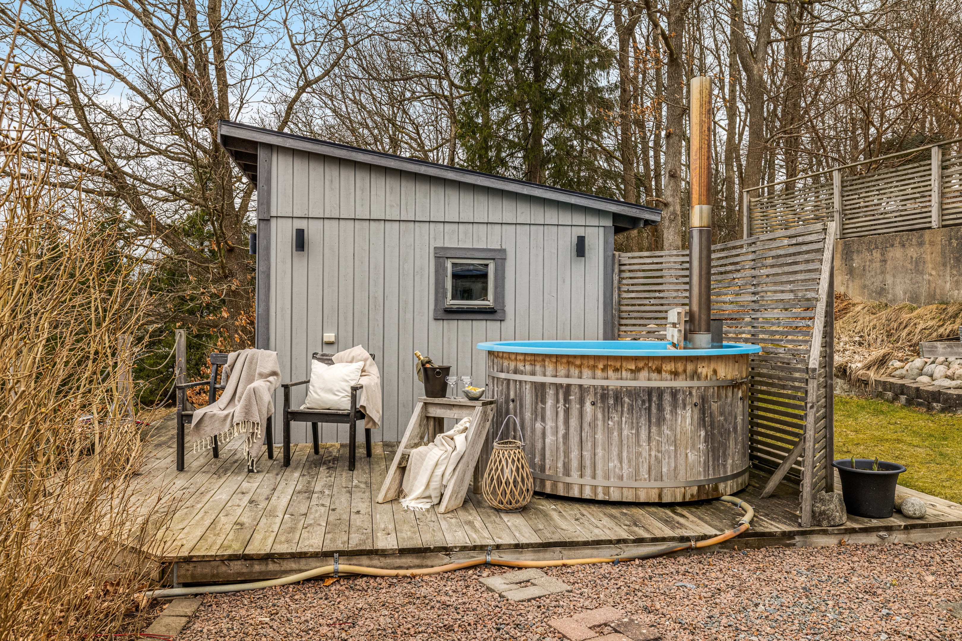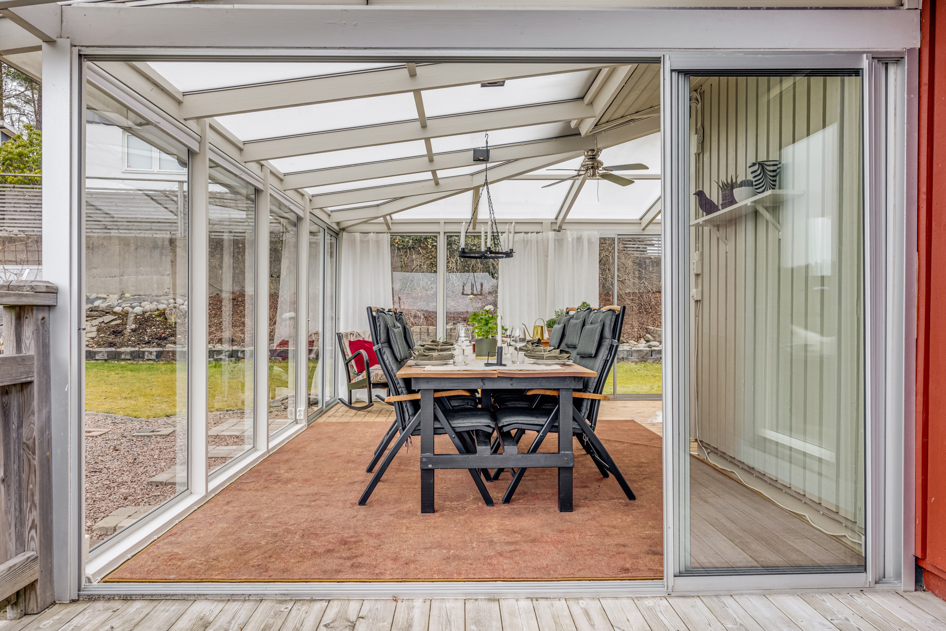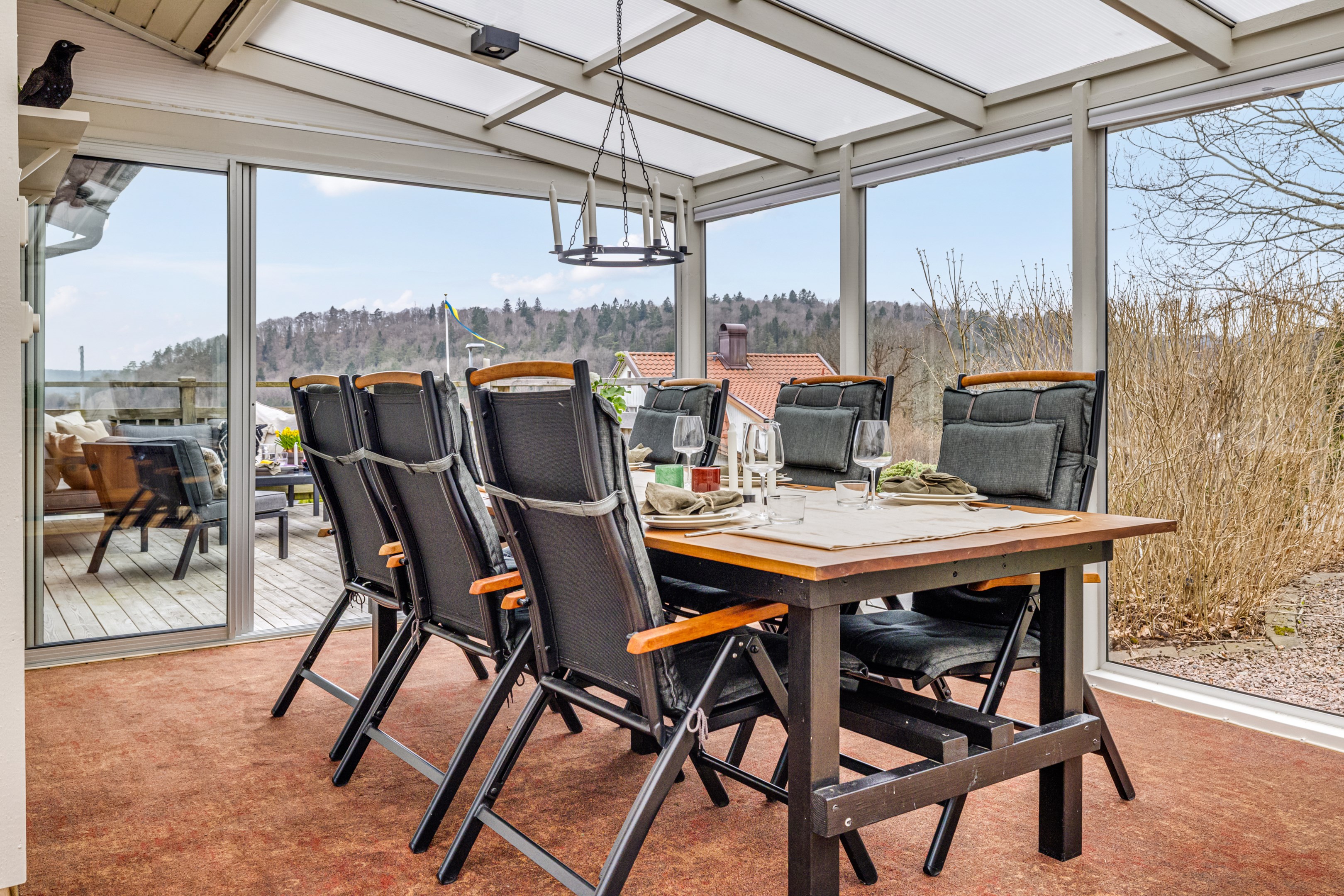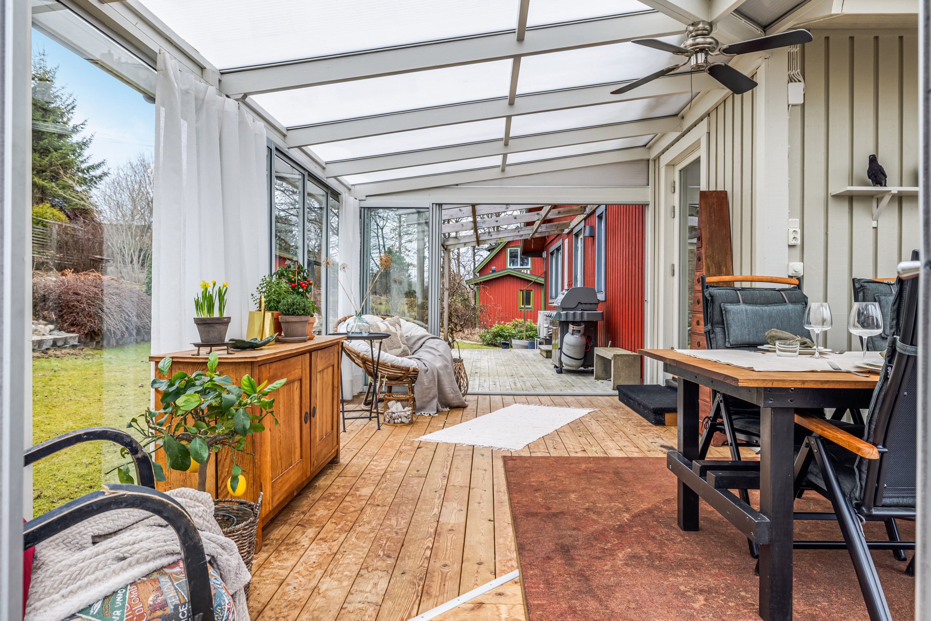 Träaltanen går runt två sidor av huset med solmöjligheter från morgon till kväll. Här erbjuds du både vid sträckt utsikt och lummig grönska. Det mysiga uterummet är placerat mittemellan altanerna och nås även från vardagsrummet. Från köket når du den lilla balkongen som ligger i sydvästläge.